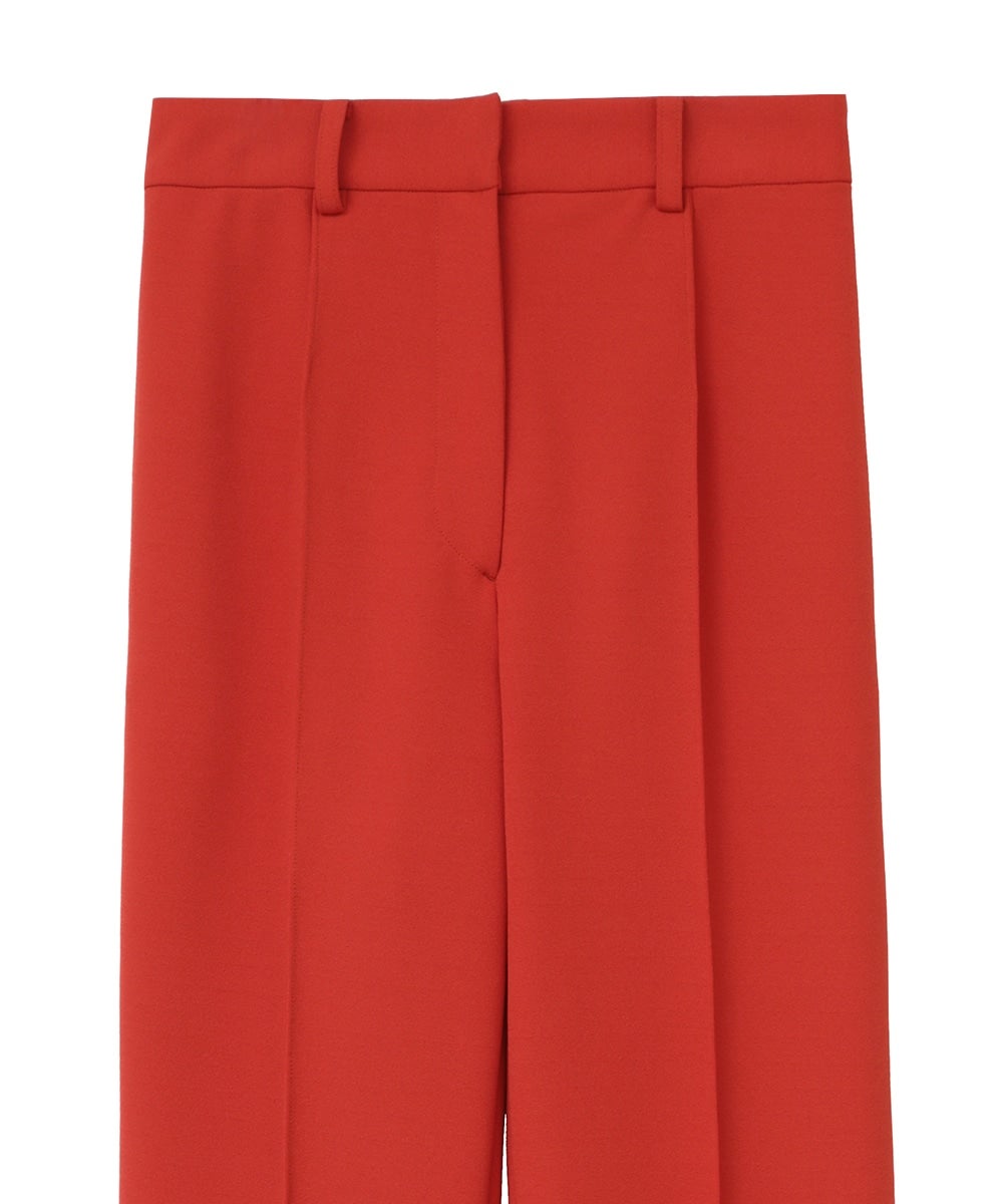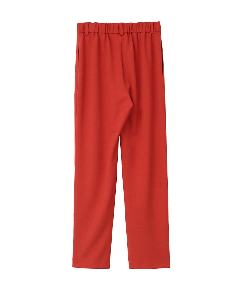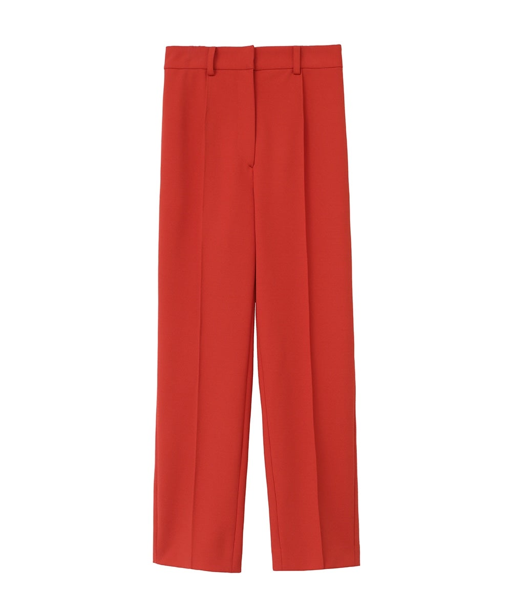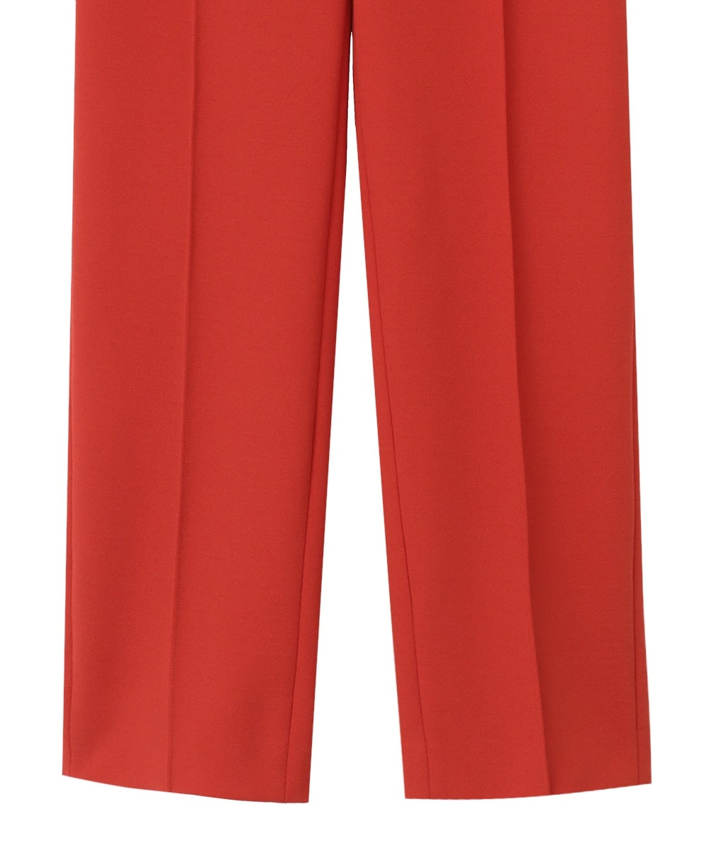日本製の特殊な編み方により布帛のように見えるジャージ素材で、程よくモード感を出しつつ着心地が良さが特徴です。真っ直ぐキレイにおちるコンパクトなシルエットと、センターラインのピンタックが脚長効果を出してくれます。オフィスシーンや普段使いまでシーンレスで着られるアイテムで、低身長の方でも綺麗に着用できる丈にしました。