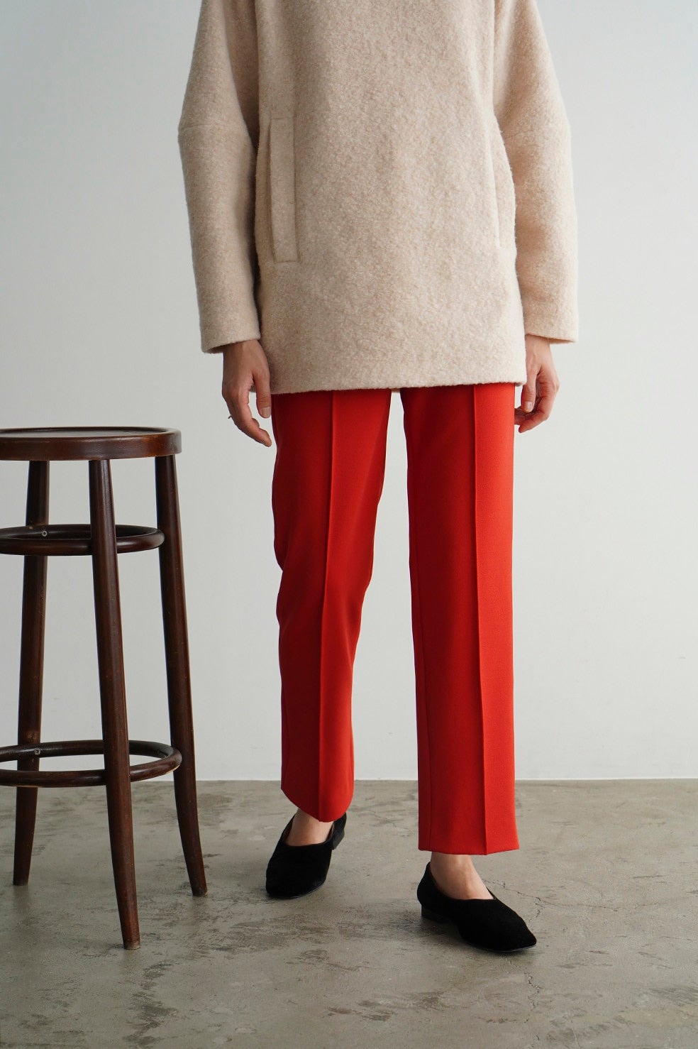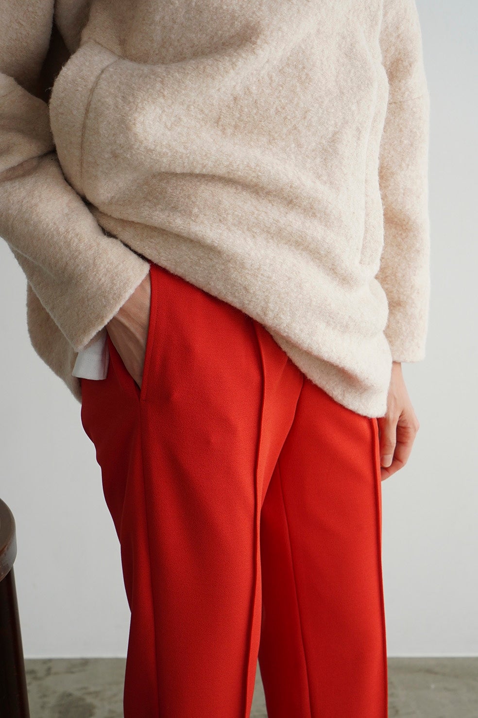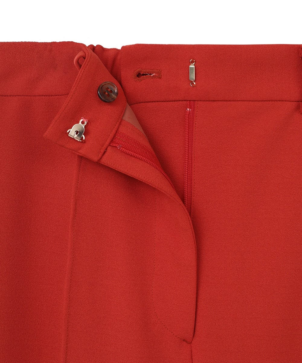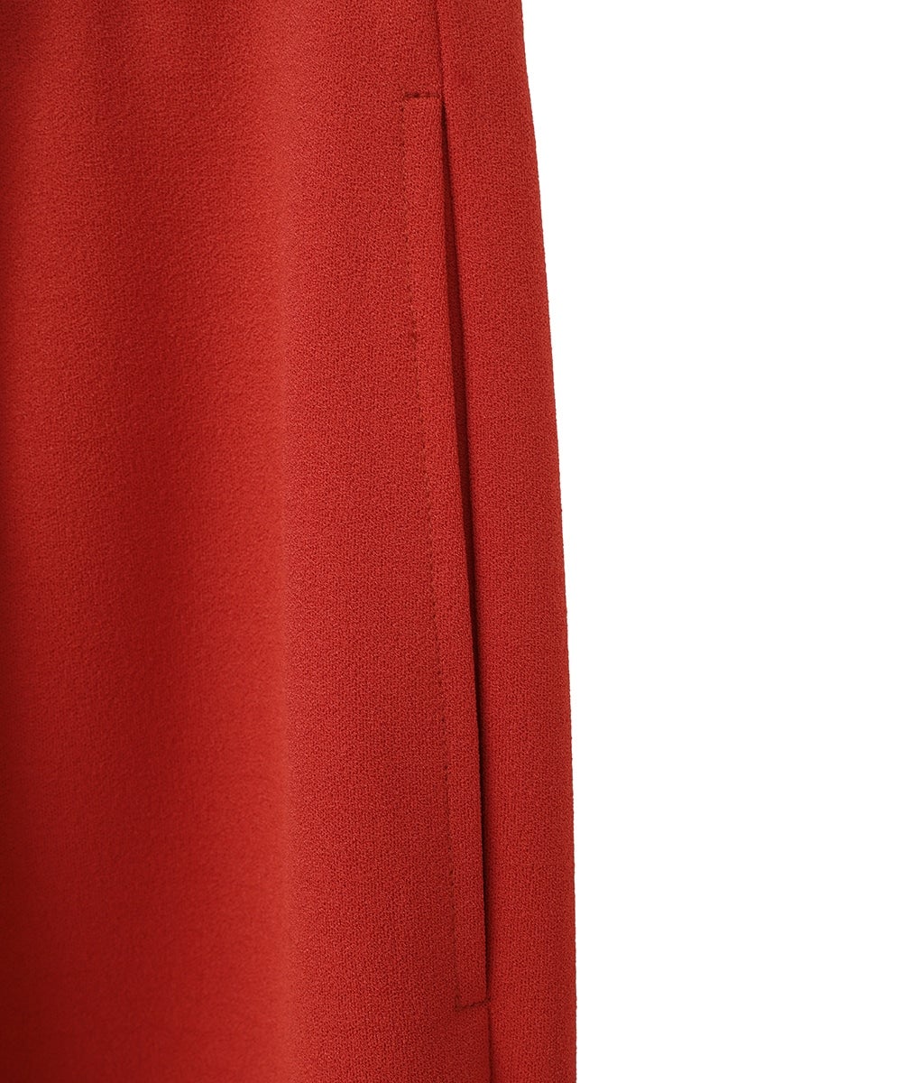 日本製の特殊な編み方により布帛のように見えるジャージ素材で、程よくモード感を出しつつ着心地が良さが特徴です。真っ直ぐキレイにおちるコンパクトなシルエットと、センターラインのピンタックが脚長効果を出してくれます。オフィスシーンや普段使いまでシーンレスで着られるアイテムで、低身長の方でも綺麗に着用できる丈にしました。