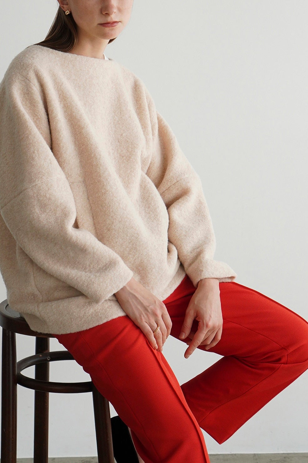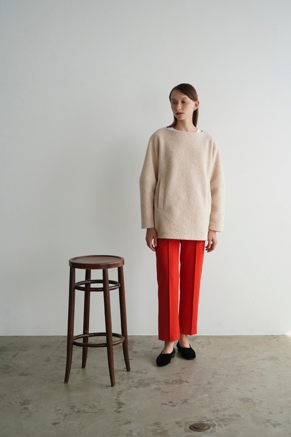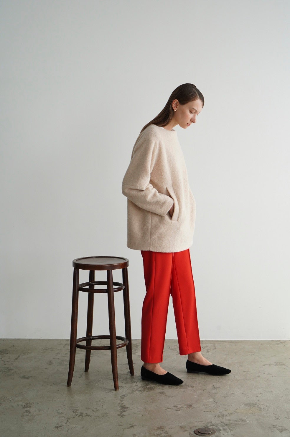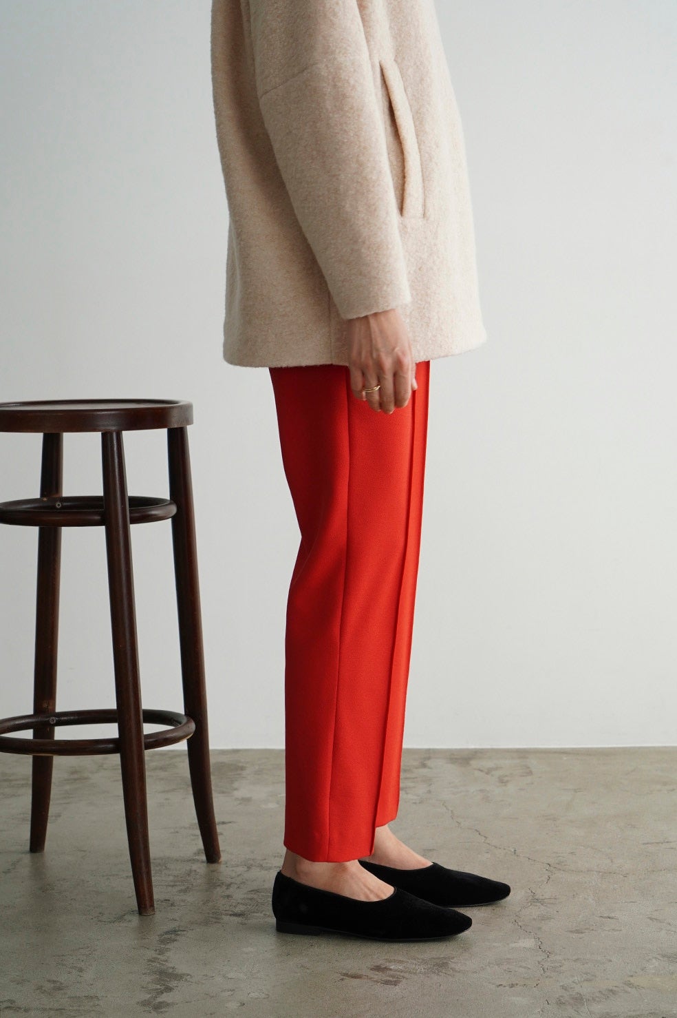 日本製の特殊な編み方により布帛のように見えるジャージ素材で、程よくモード感を出しつつ着心地が良さが特徴です。真っ直ぐキレイにおちるコンパクトなシルエットと、センターラインのピンタックが脚長効果を出してくれます。オフィスシーンや普段使いまでシーンレスで着られるアイテムで、低身長の方でも綺麗に着用できる丈にしました。