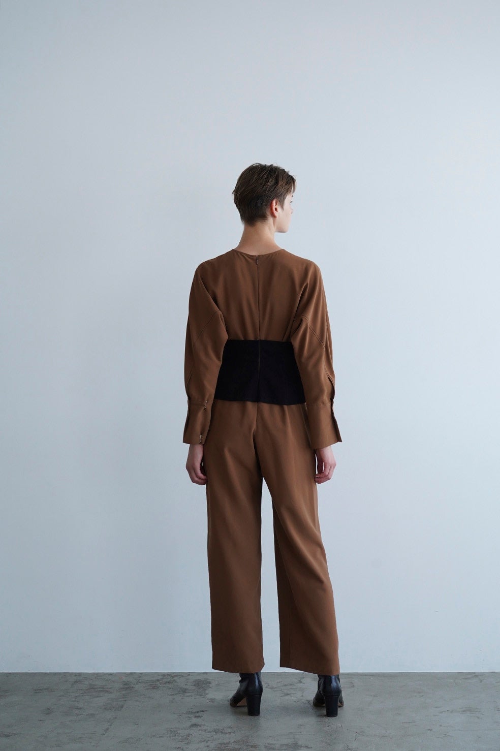 ウエストにウールビスチェがドッキングされた落ち感のあるオールインワン。