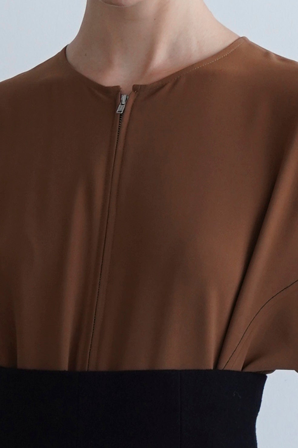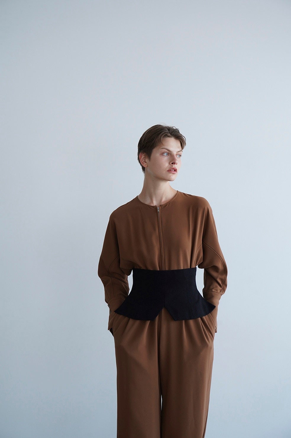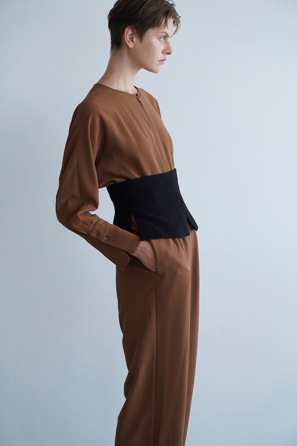 立体的なカッティングの袖や配色ステッチ、フロントのファスナーディティールがCLANEらしいモードな印象になるよう仕上げた他にはない1枚です。ウエストにフィットするビスチェがメリハリを演出し、スタイルアップ効果もあります。