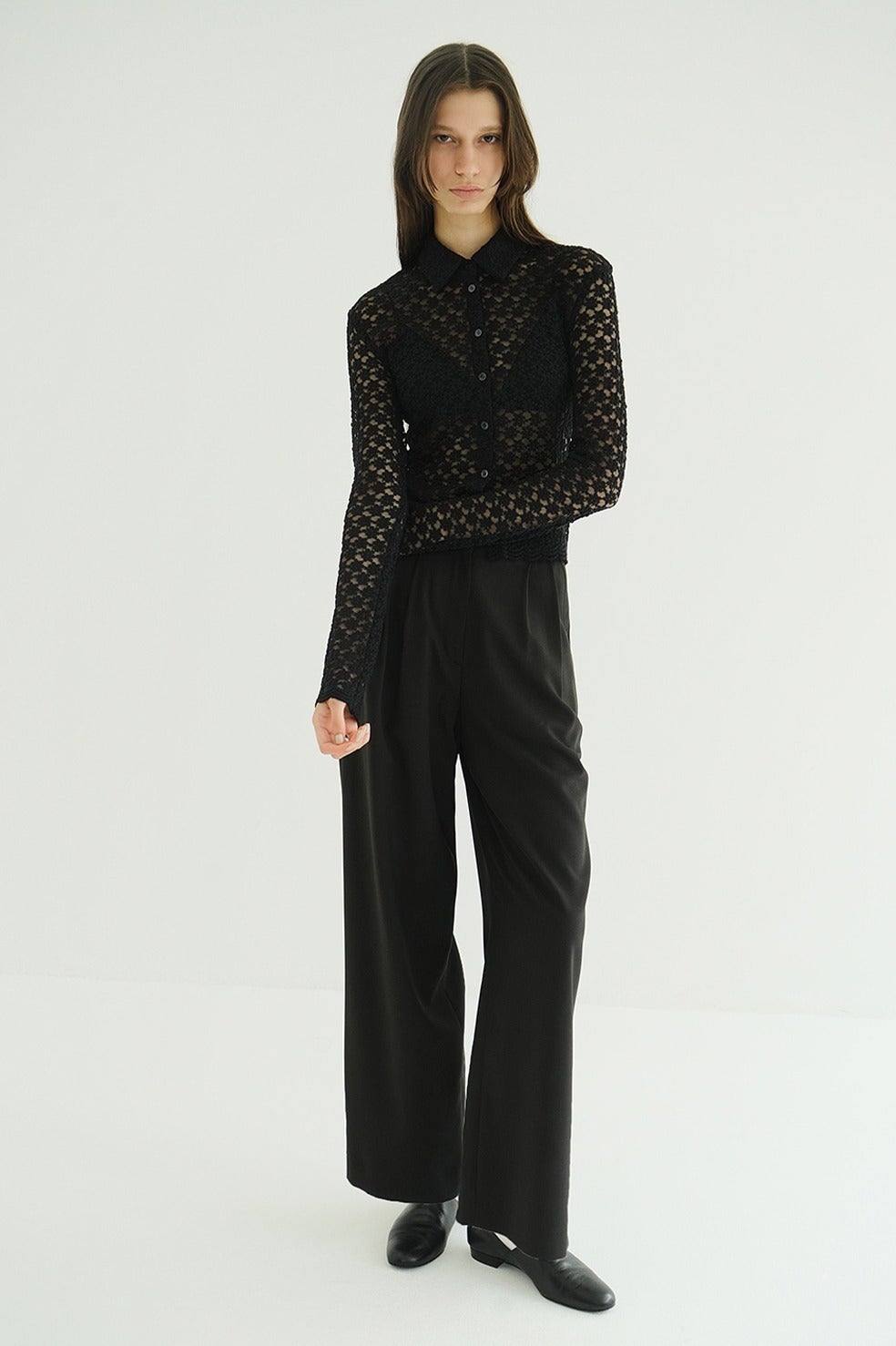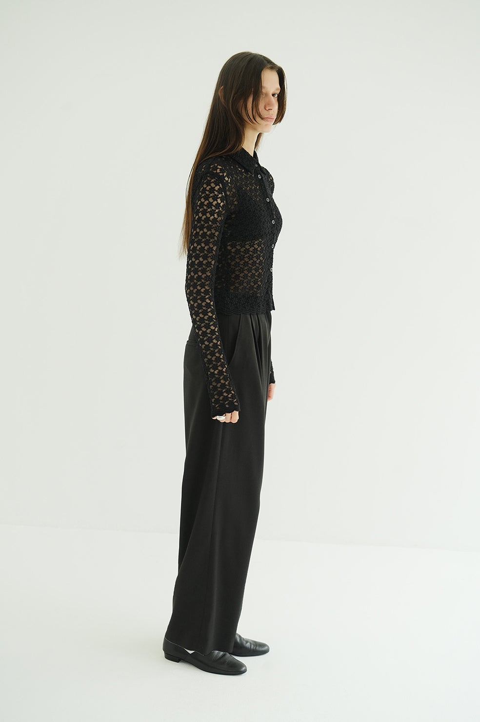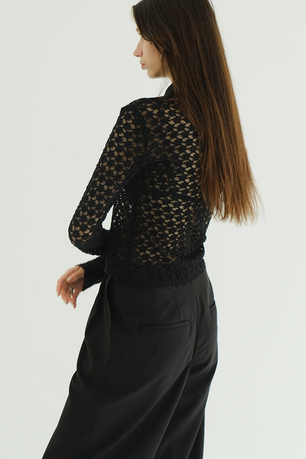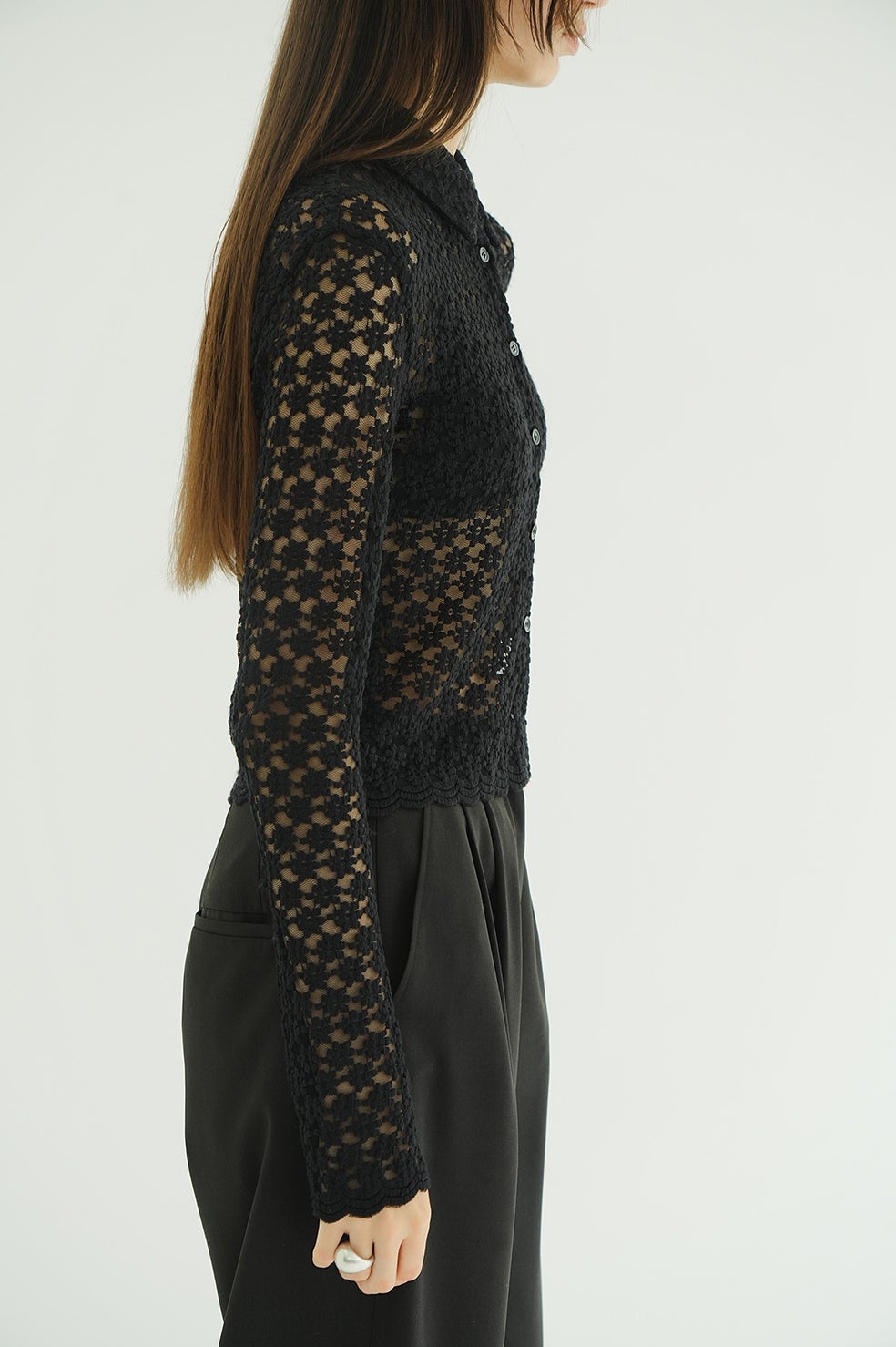 柄が詰まったレースは程よい透け感で、シャツディテールに小さめの襟を合わせることでコンパクトに仕上げました。裾や袖口にはスカラップを取り入れ、フェミニンな要素をプラス。ボトムに合わせやすいバランスの取れたサイズ感で、羽織りとしてはもちろん、釦を閉めてトップスとしても着用いただけます。こだわりを詰め込んだ、今季おすすめの柄シリーズです。