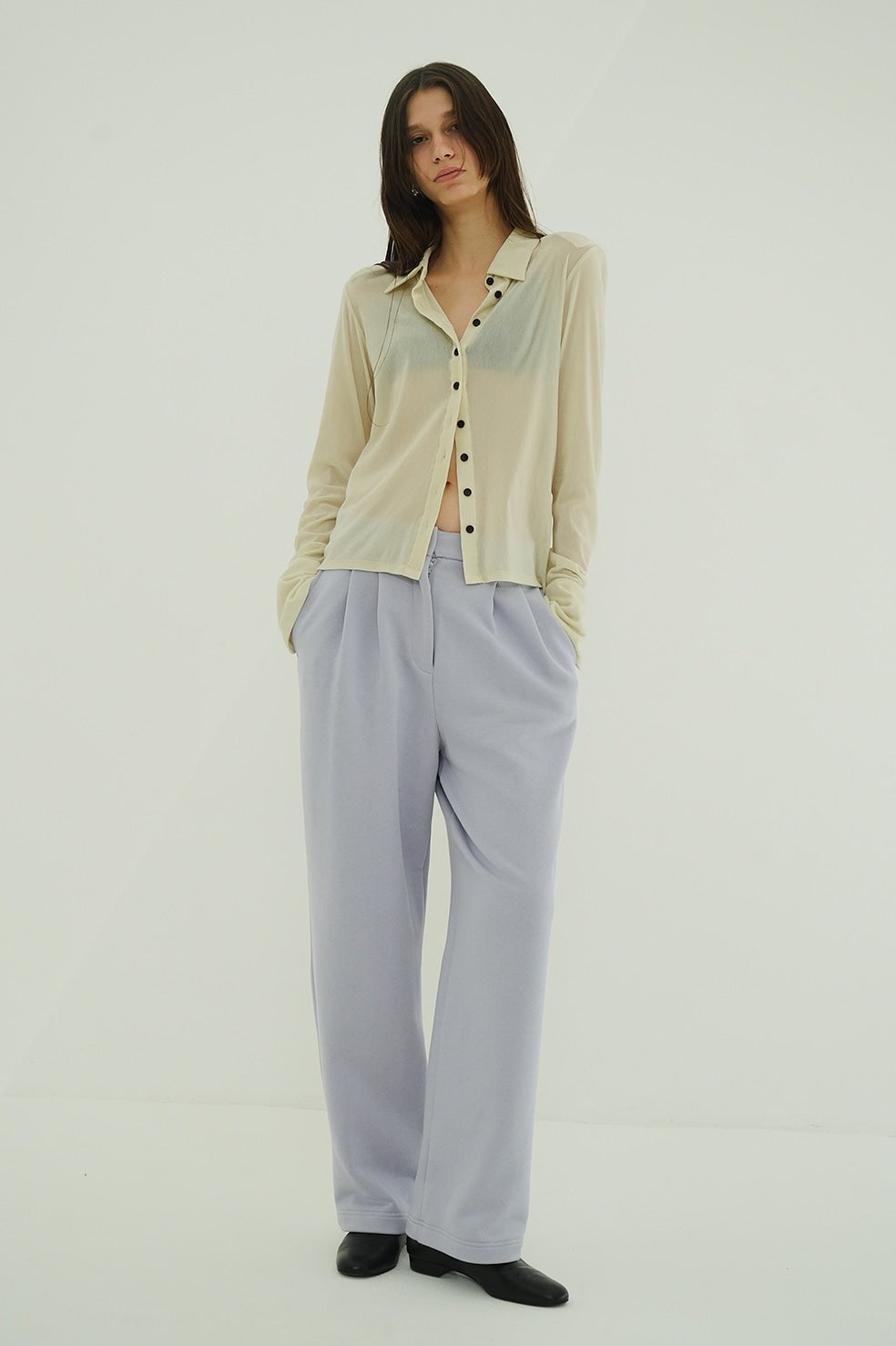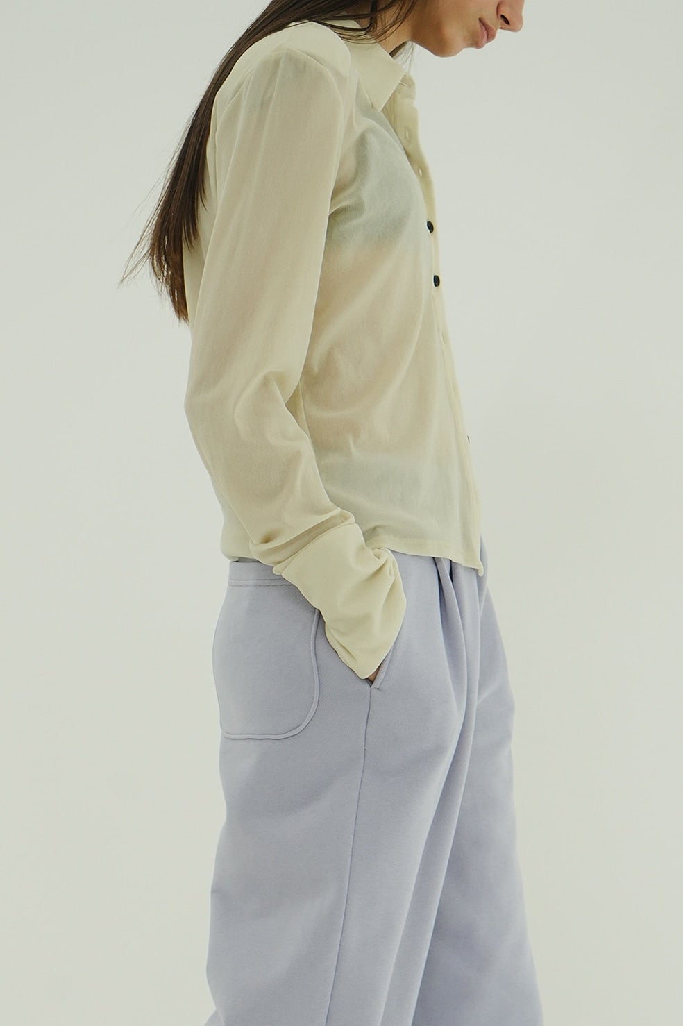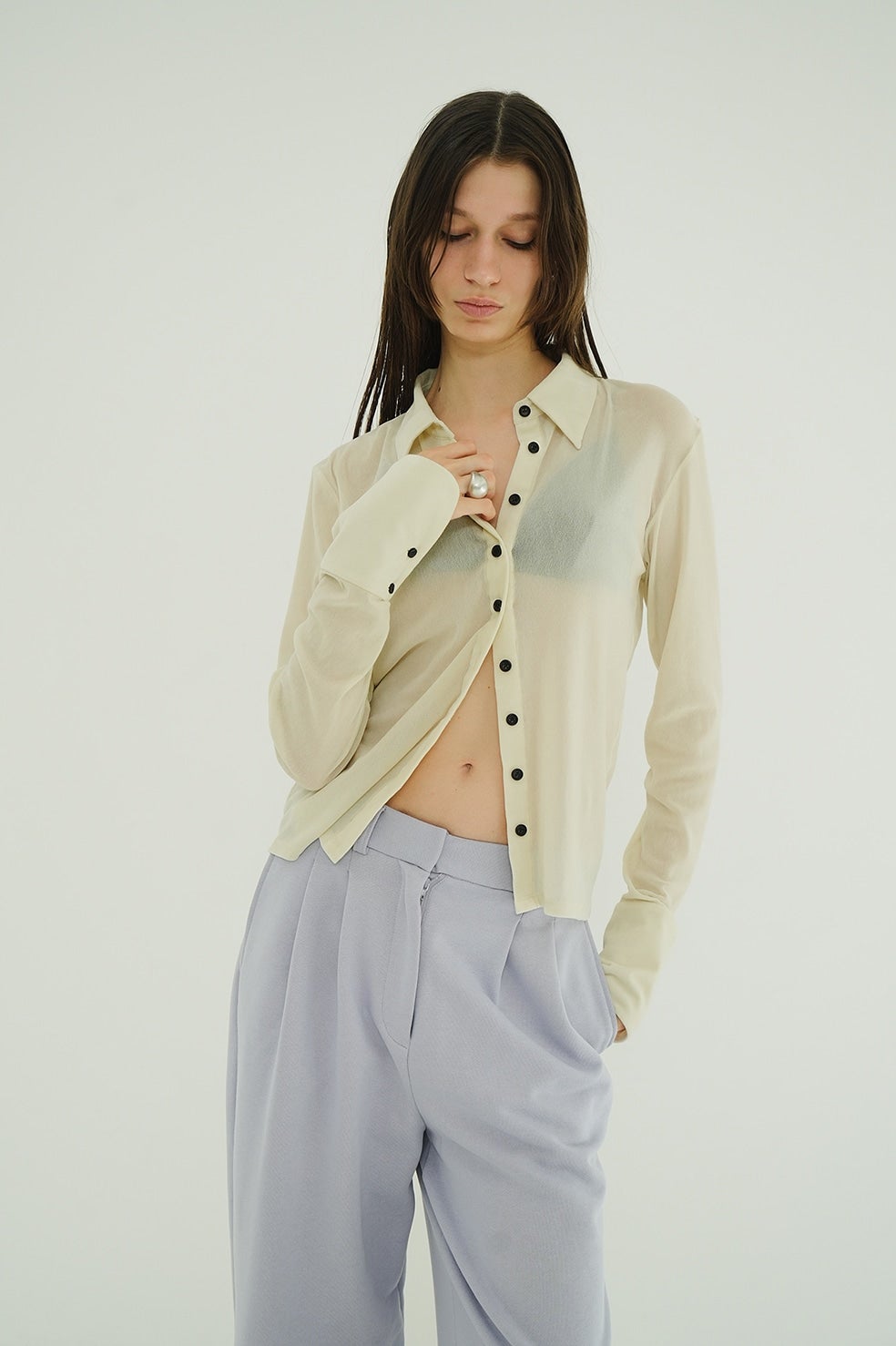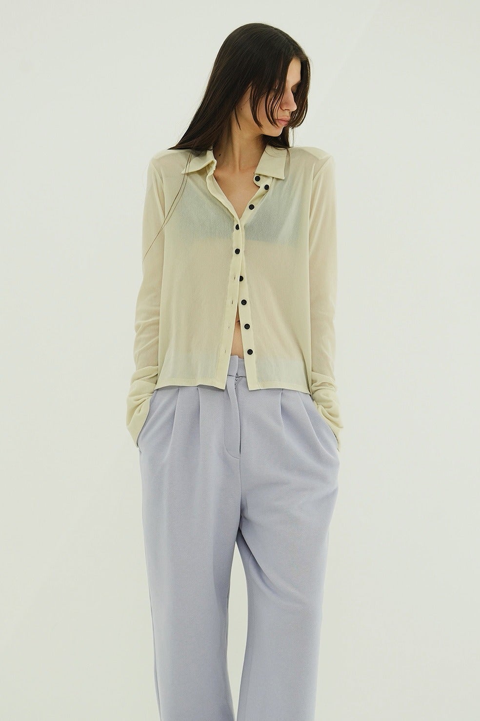 インでもアウトでも着やすい丈感で、コーディネートの幅を広げてくれる万能な一枚。繊細なチュールにフロッキー加工を施すことで、心地よい着用感と奥行きのある表情を実現。さりげない微配色のボタンもポイントです。