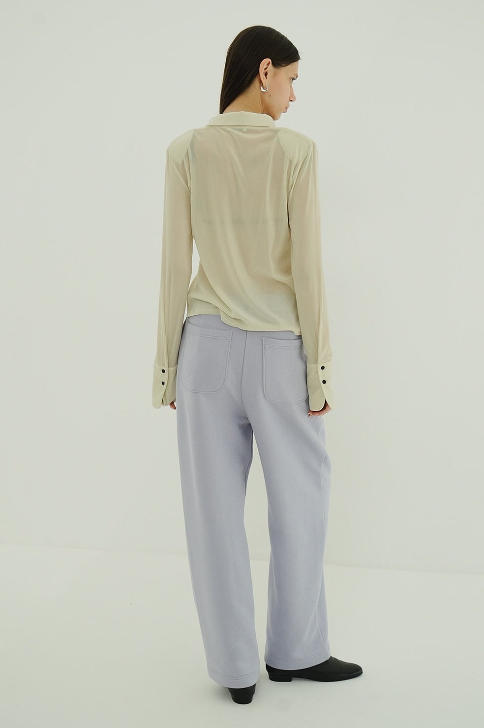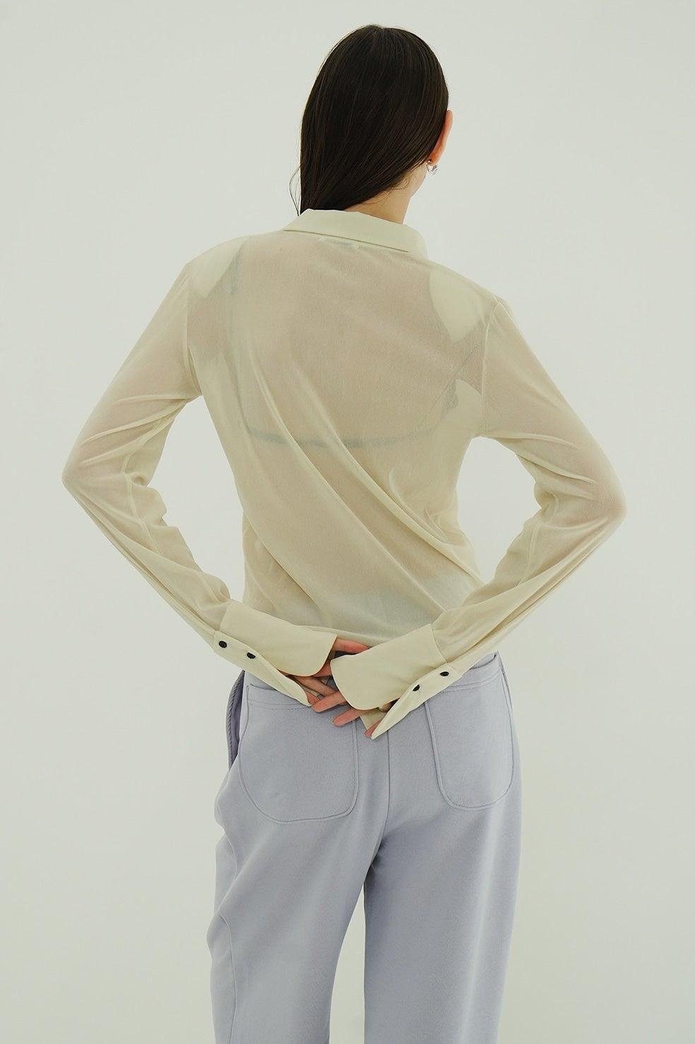 透け感のあるチュールフロッキー素材を使用し、程よくフィットするシルエットが女性らしい印象のポロトップス。