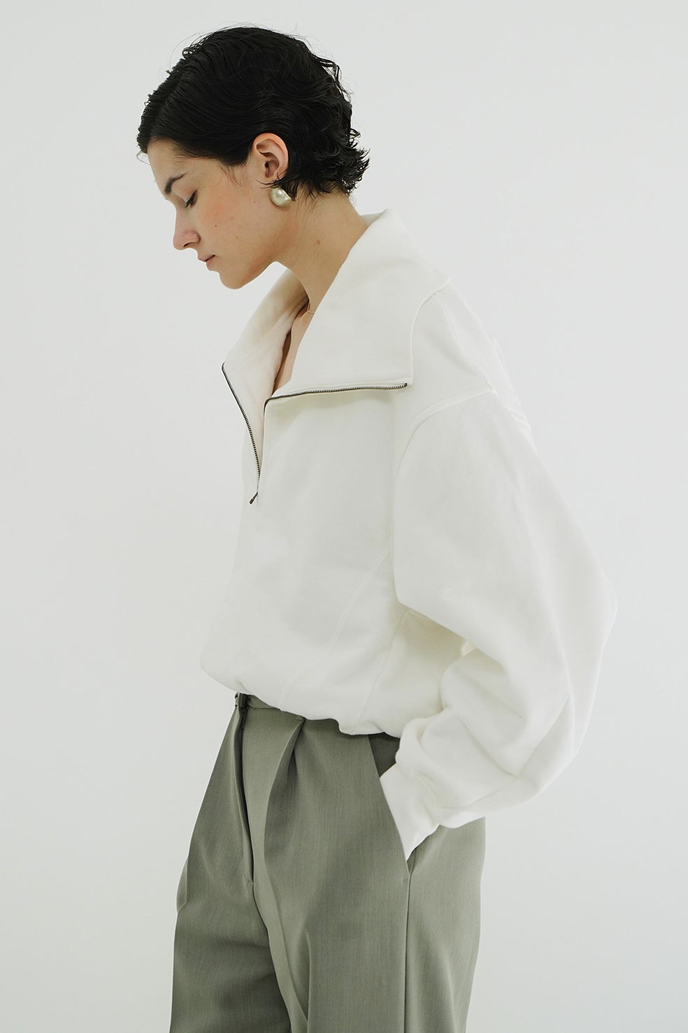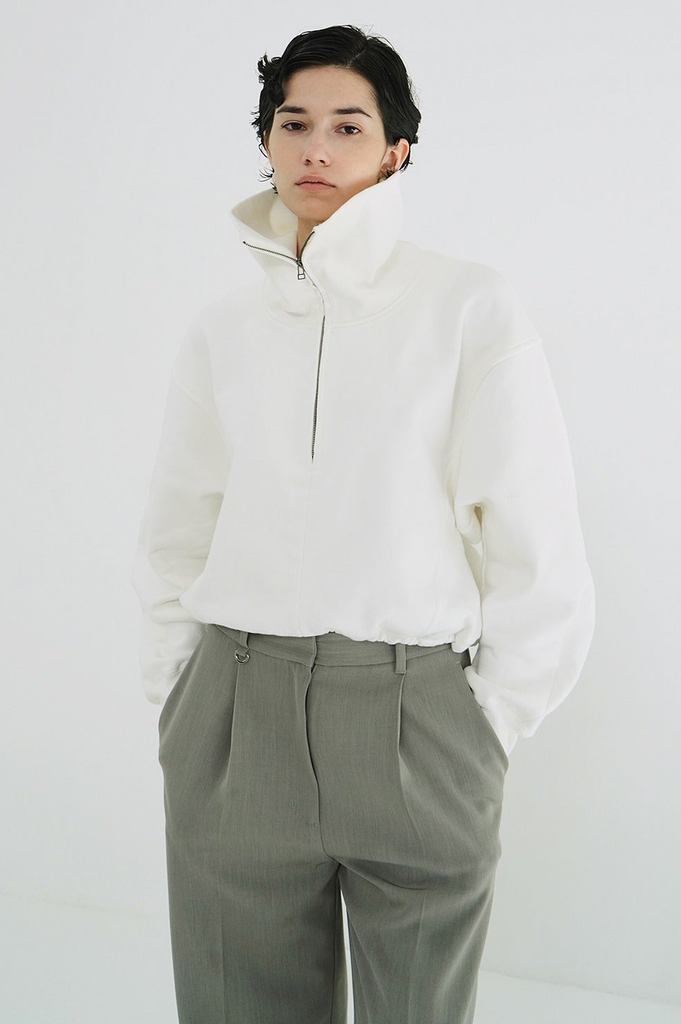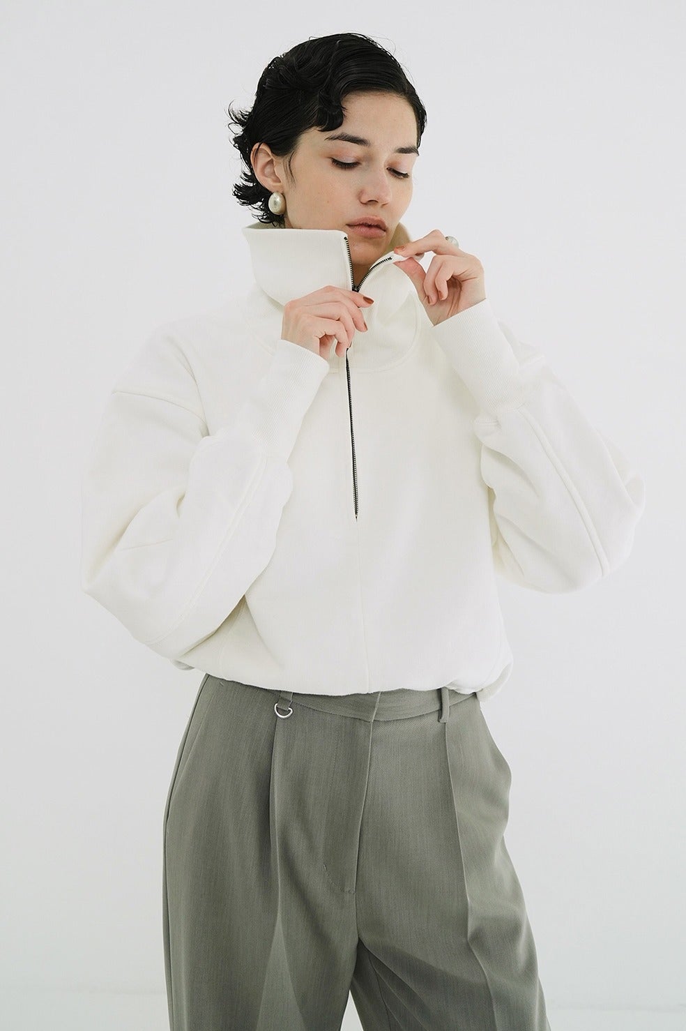 大きなタートルで顔まわりが映えるハーフジップトップス。