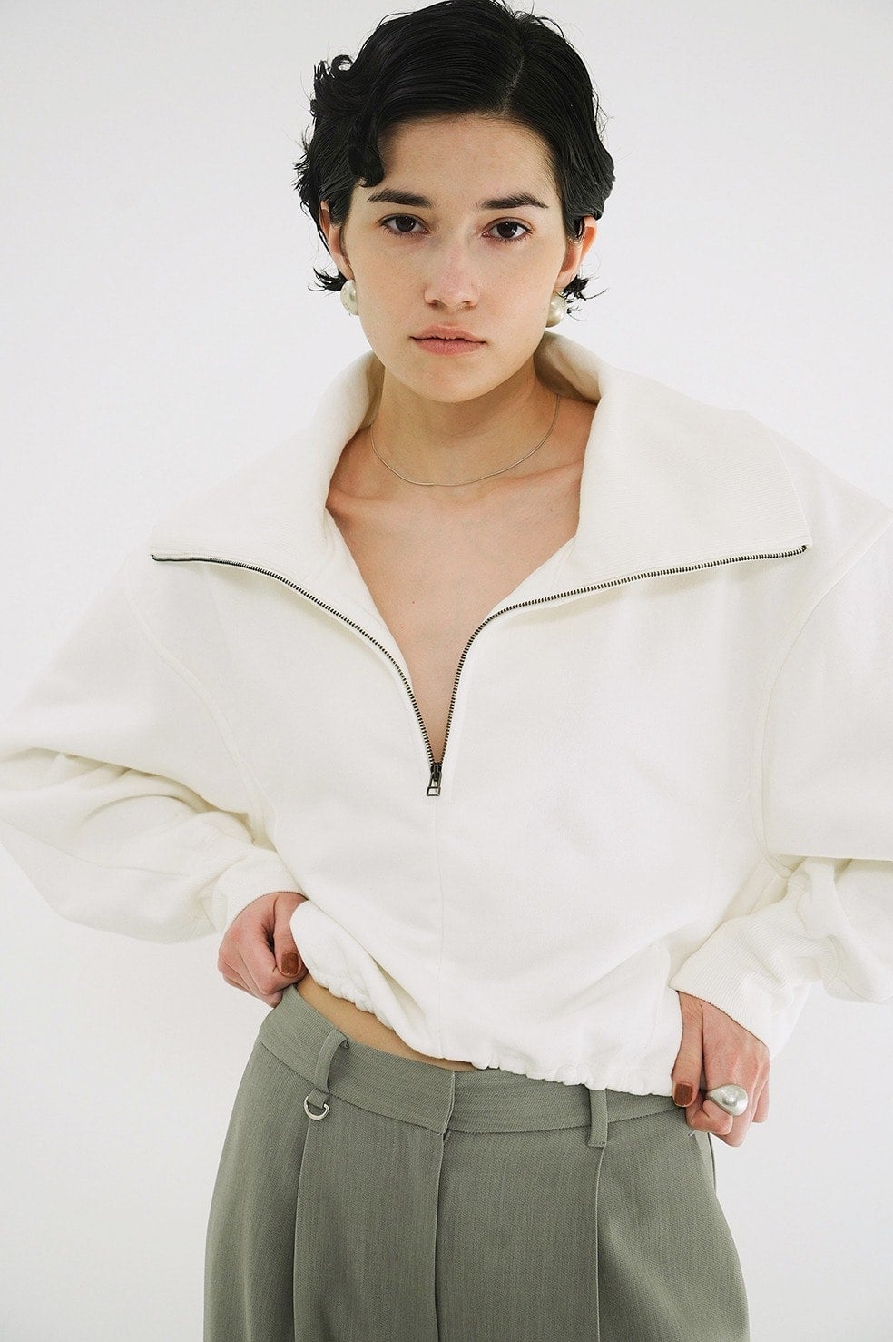 ファスナーを開けると大きめの襟が小顔効果を演出し、ショート丈でもバランスの取りやすいデザインです。