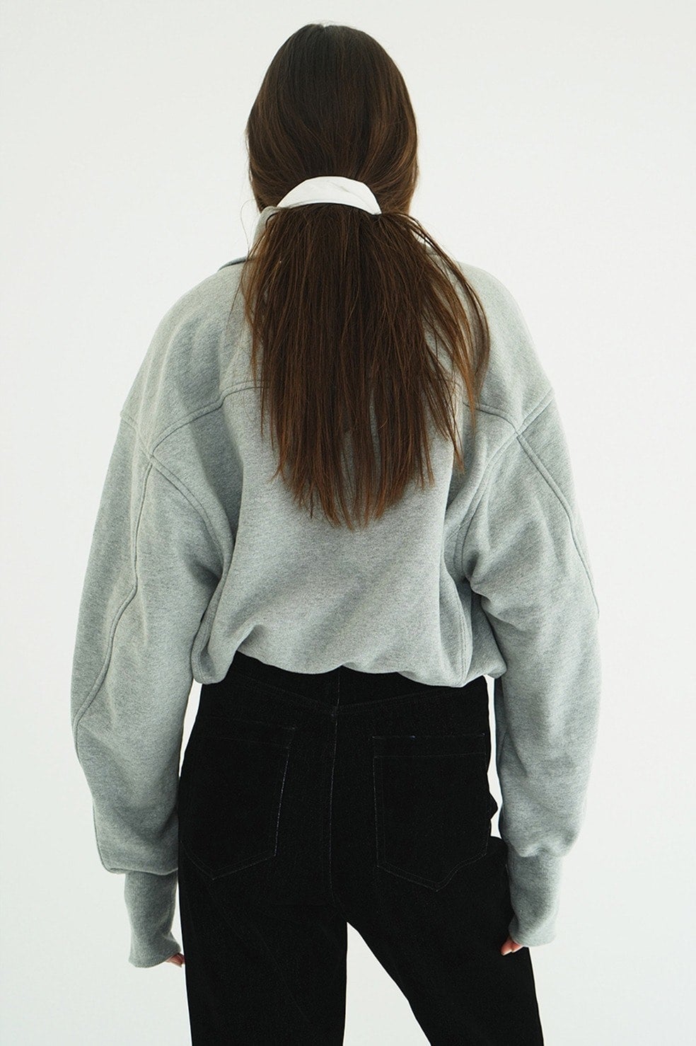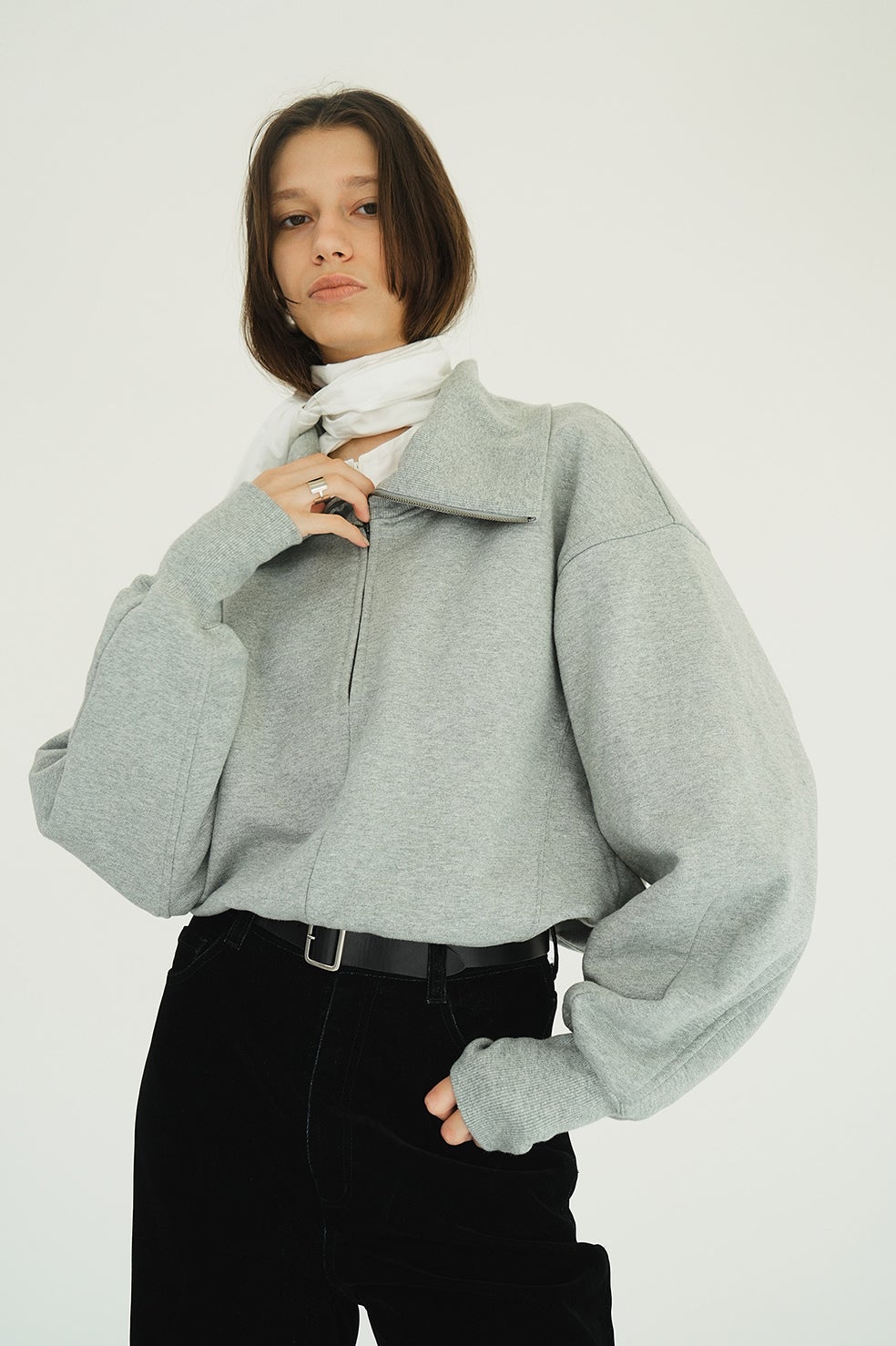 大きなタートルで顔まわりが映えるハーフジップトップス。