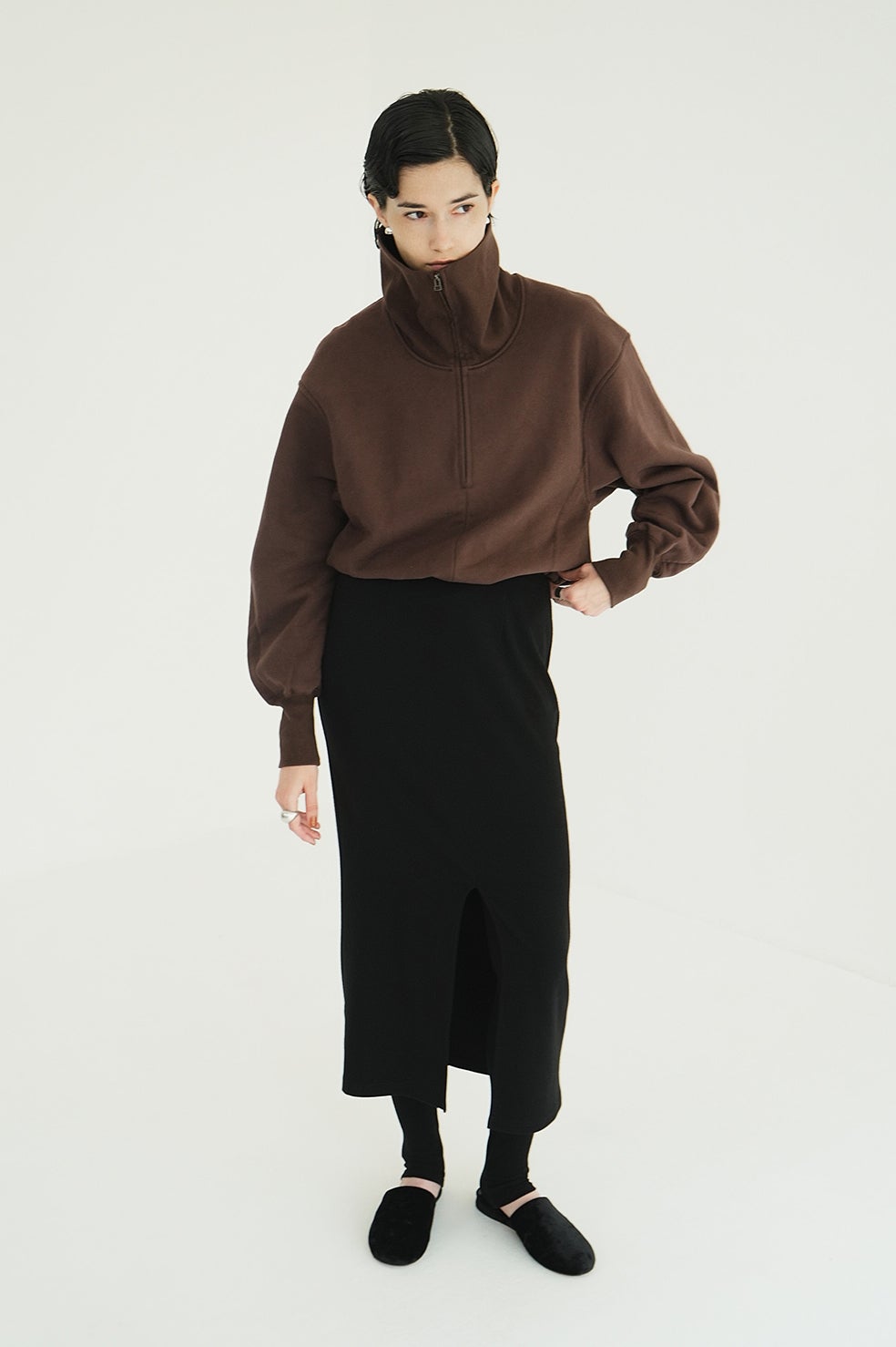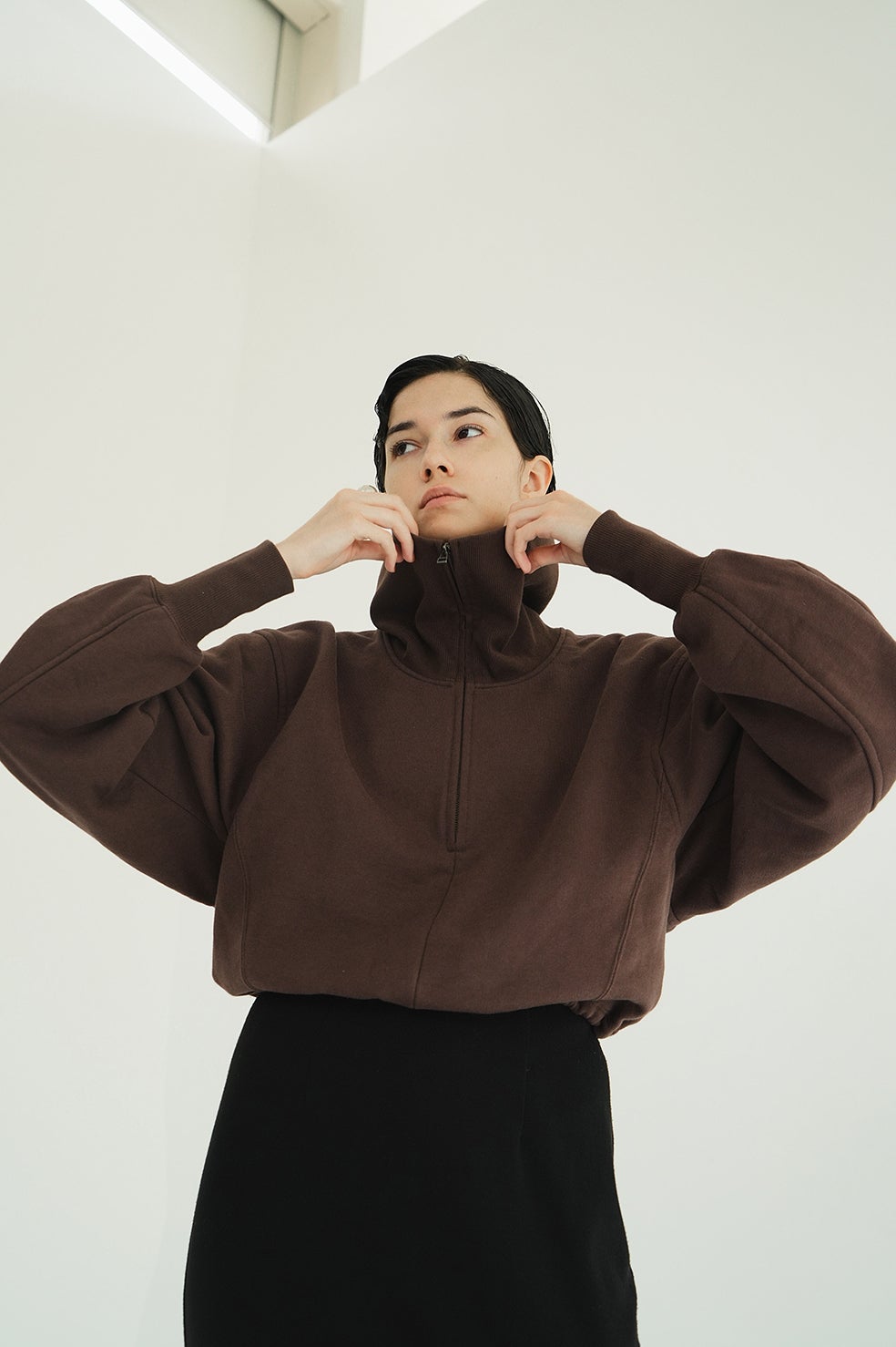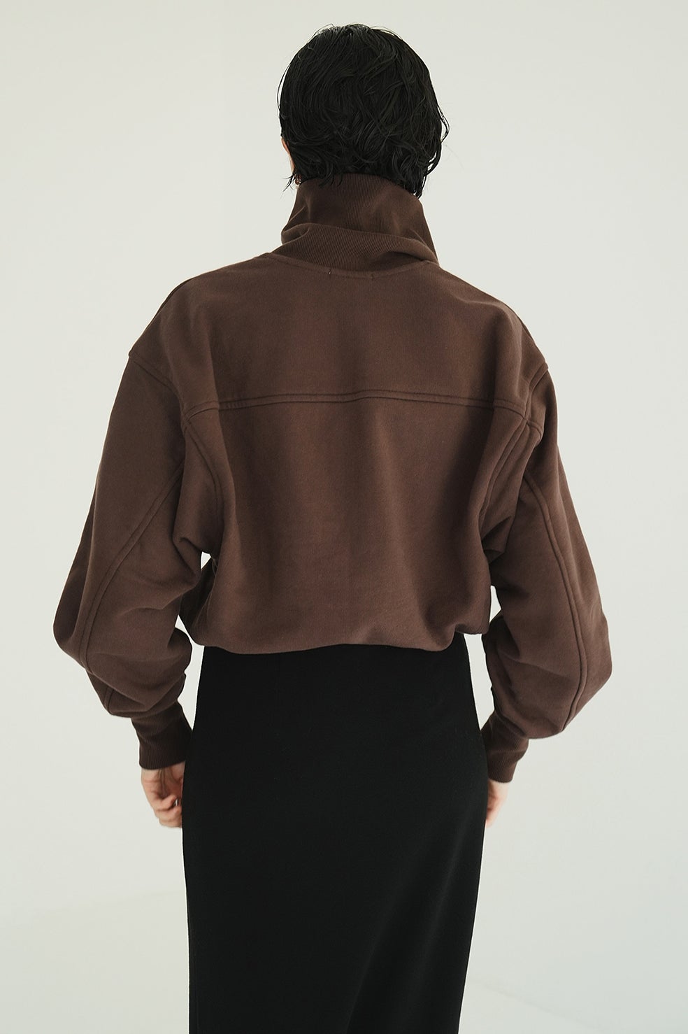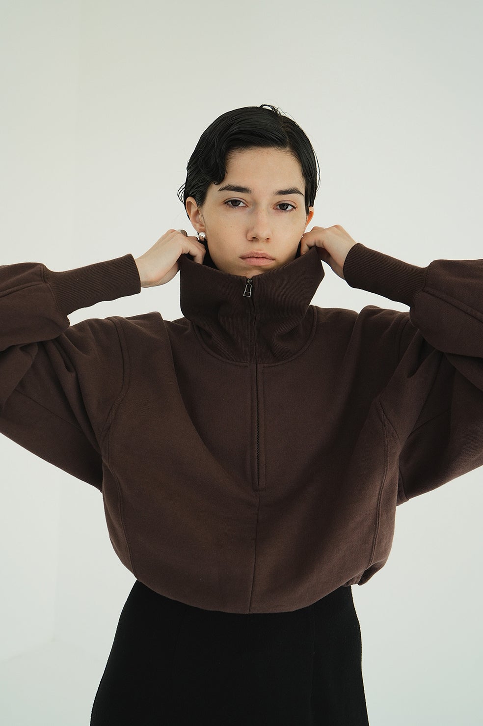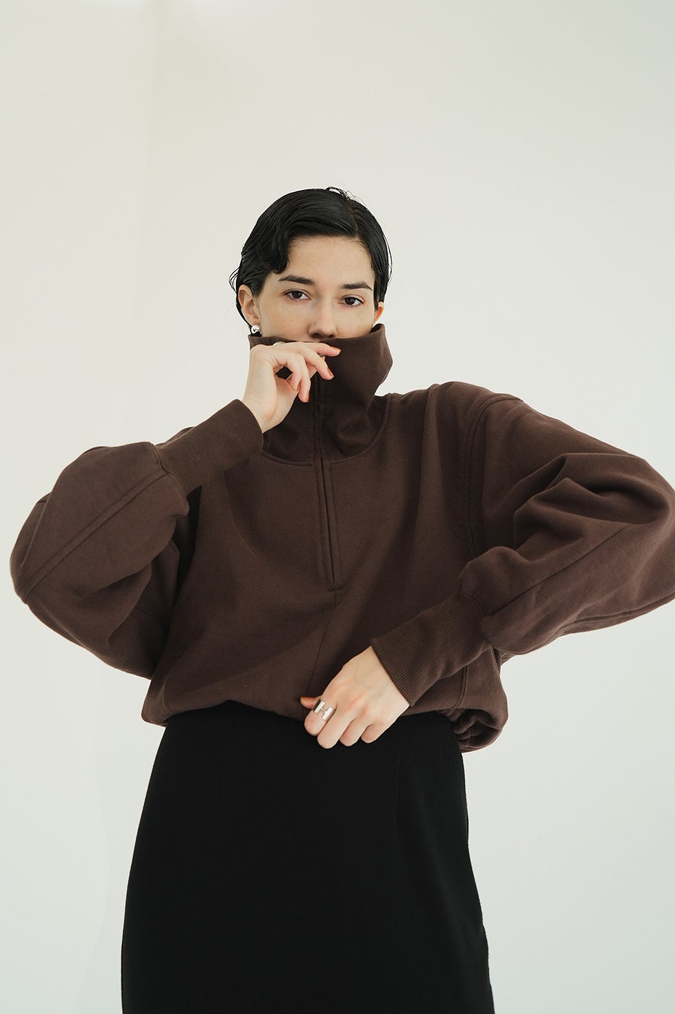 大きなタートルで顔まわりが映えるハーフジップトップス。