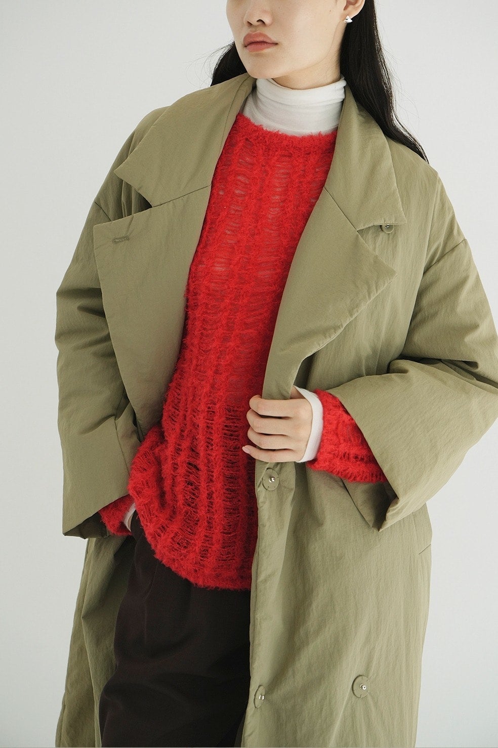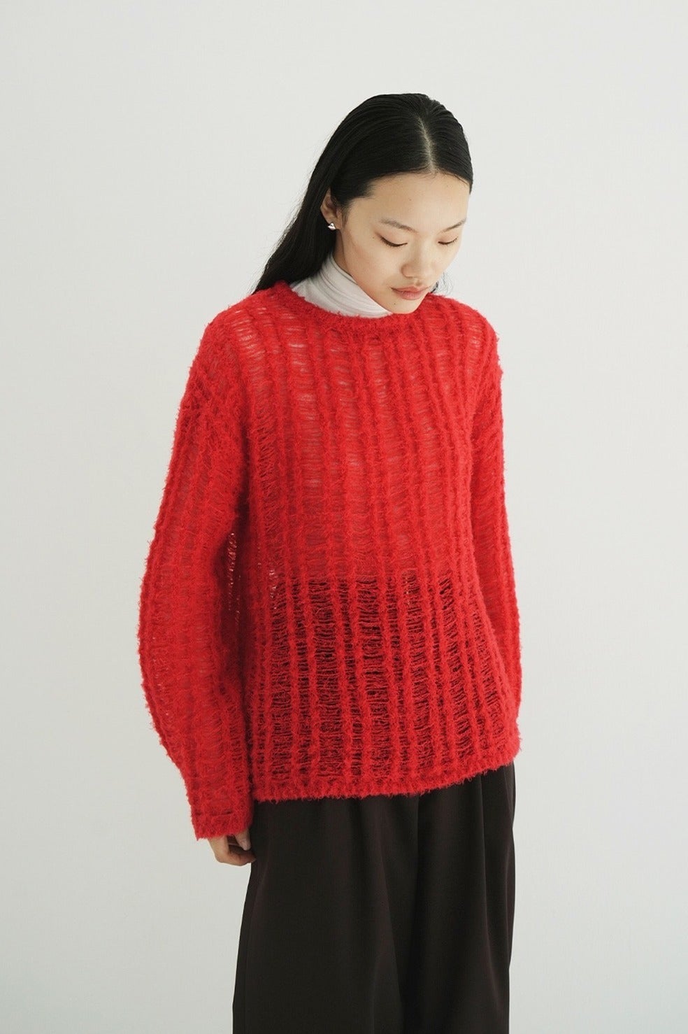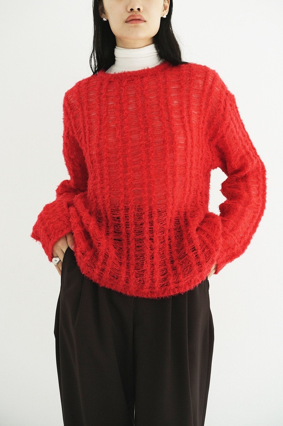 太番手のモヘアとソフトなシャギー糸をミックスさせ、程よい毛足感を表現しました。針抜き組織にすることで軽さを出し、ふんわりとした風合いに仕上げています。袖と着丈を長めに設定し、身幅を広くとったルーズなシルエットで、シンプルながらも素材の表情が引き立つ一枚。