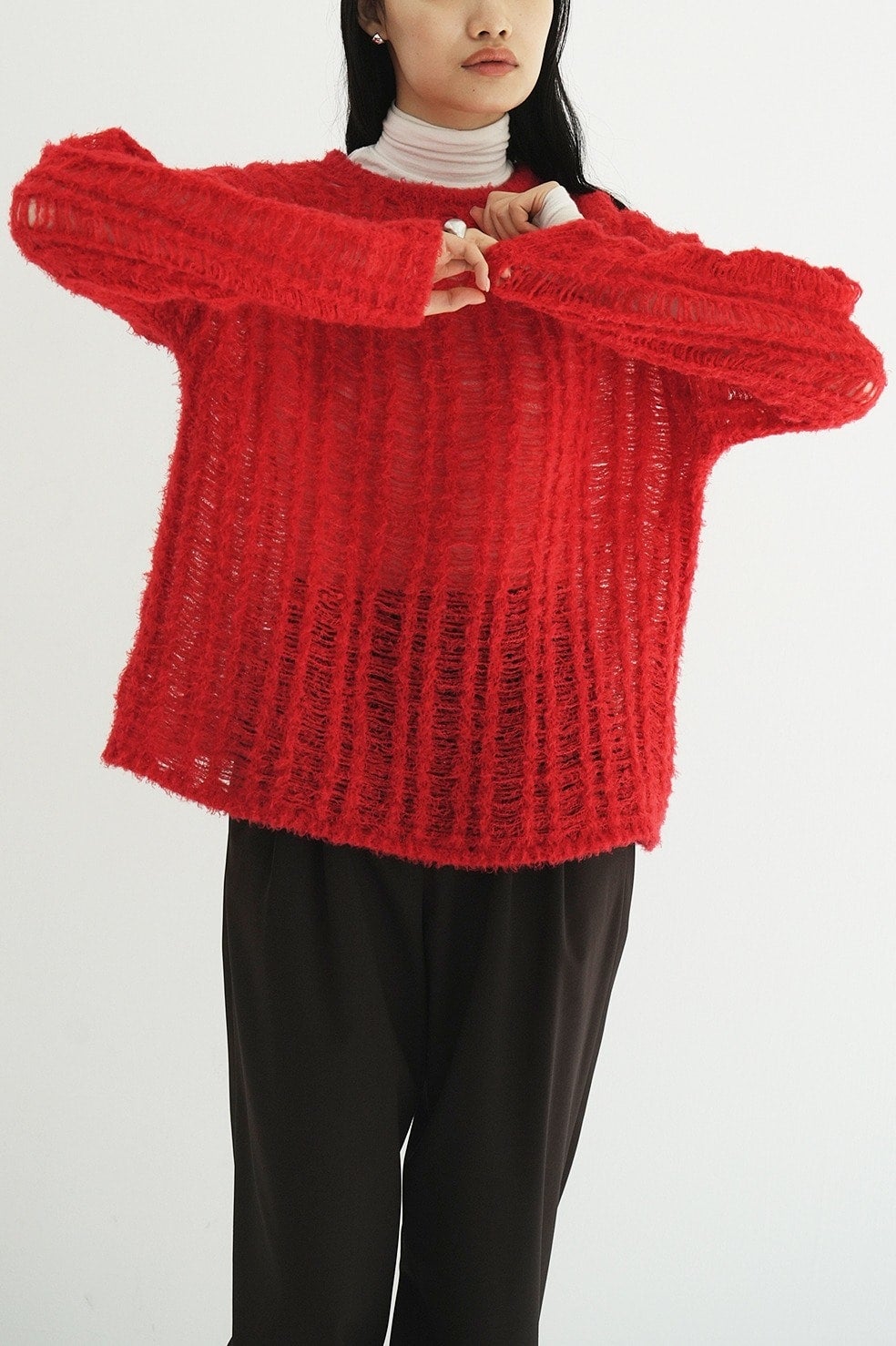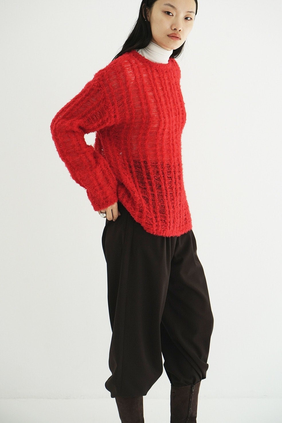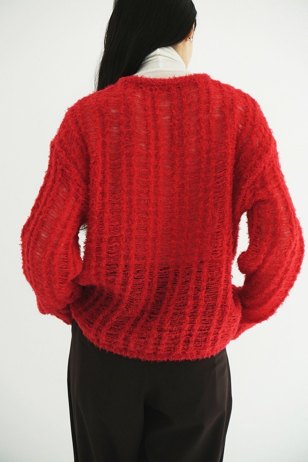太番手のモヘアとソフトなシャギー糸をミックスさせ、程よい毛足感を表現しました。針抜き組織にすることで軽さを出し、ふんわりとした風合いに仕上げています。袖と着丈を長めに設定し、身幅を広くとったルーズなシルエットで、シンプルながらも素材の表情が引き立つ一枚。