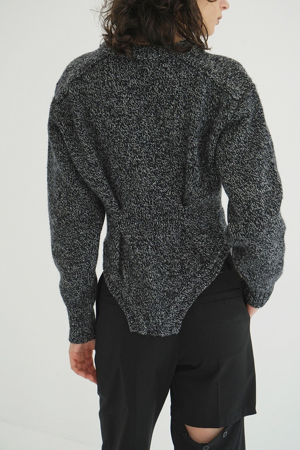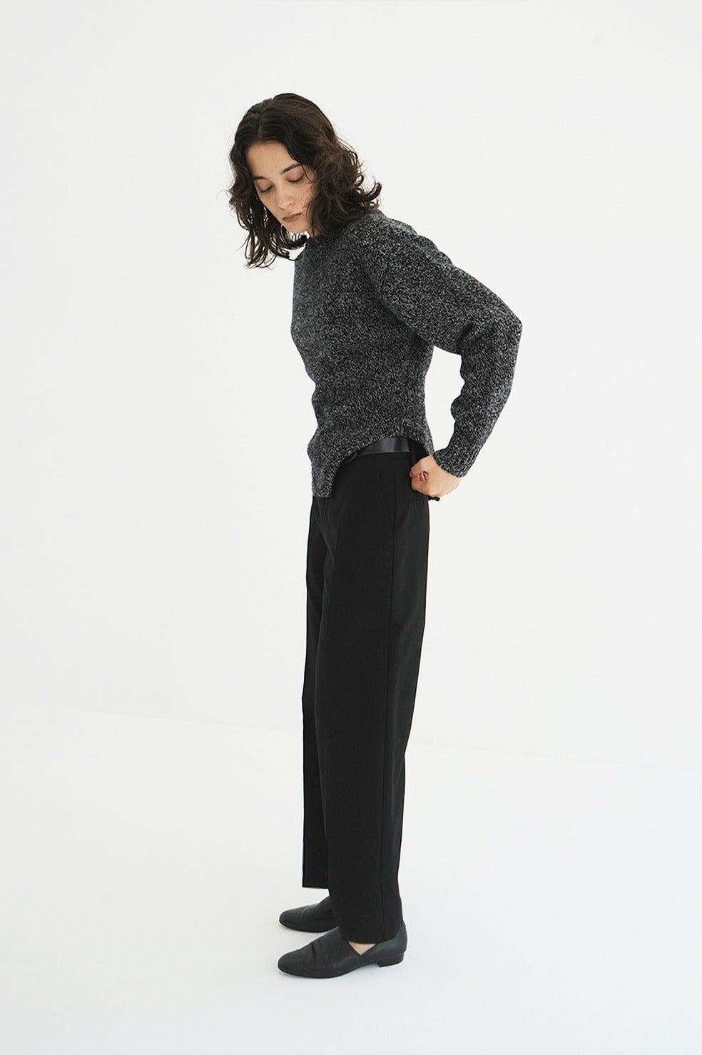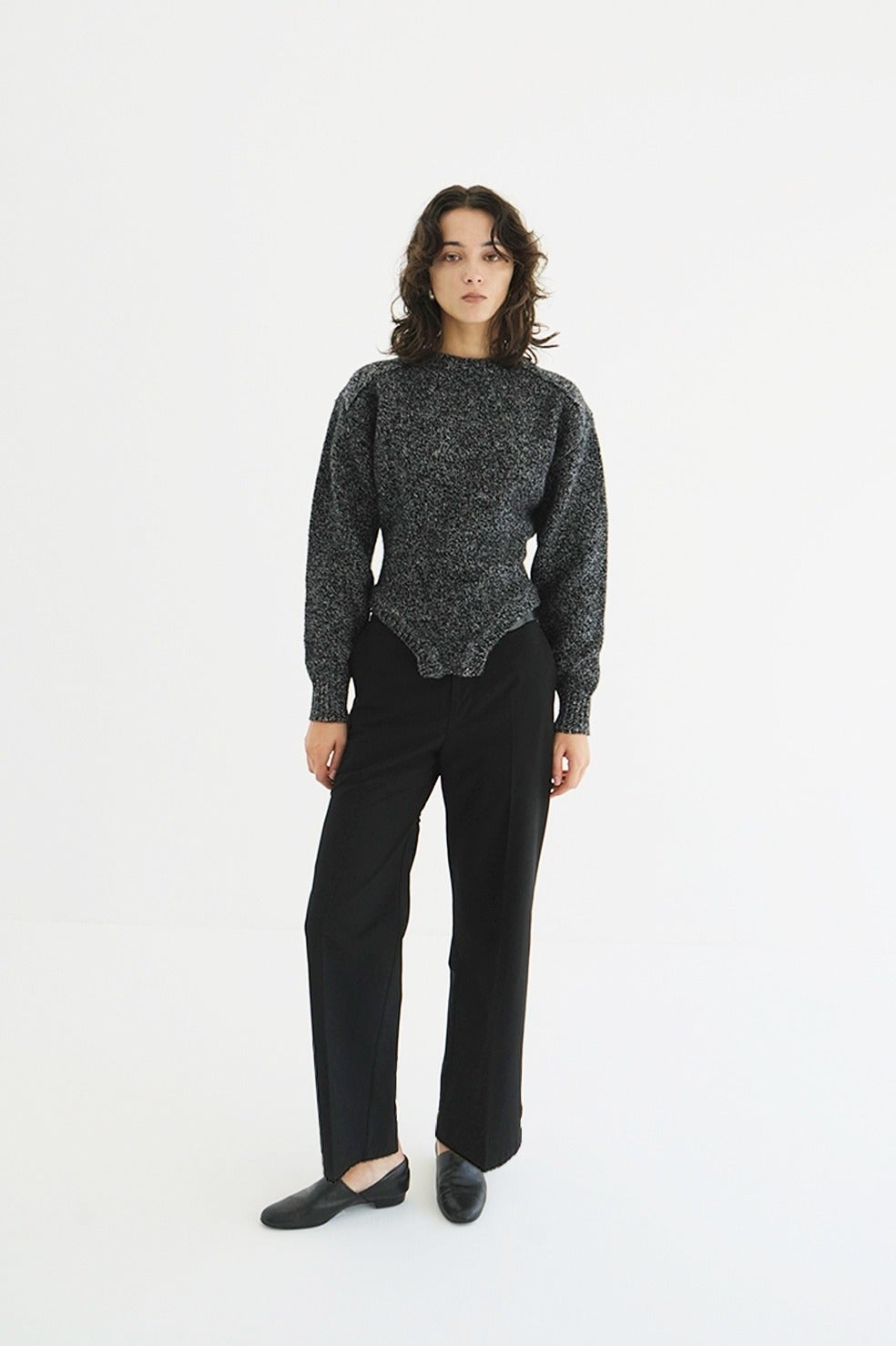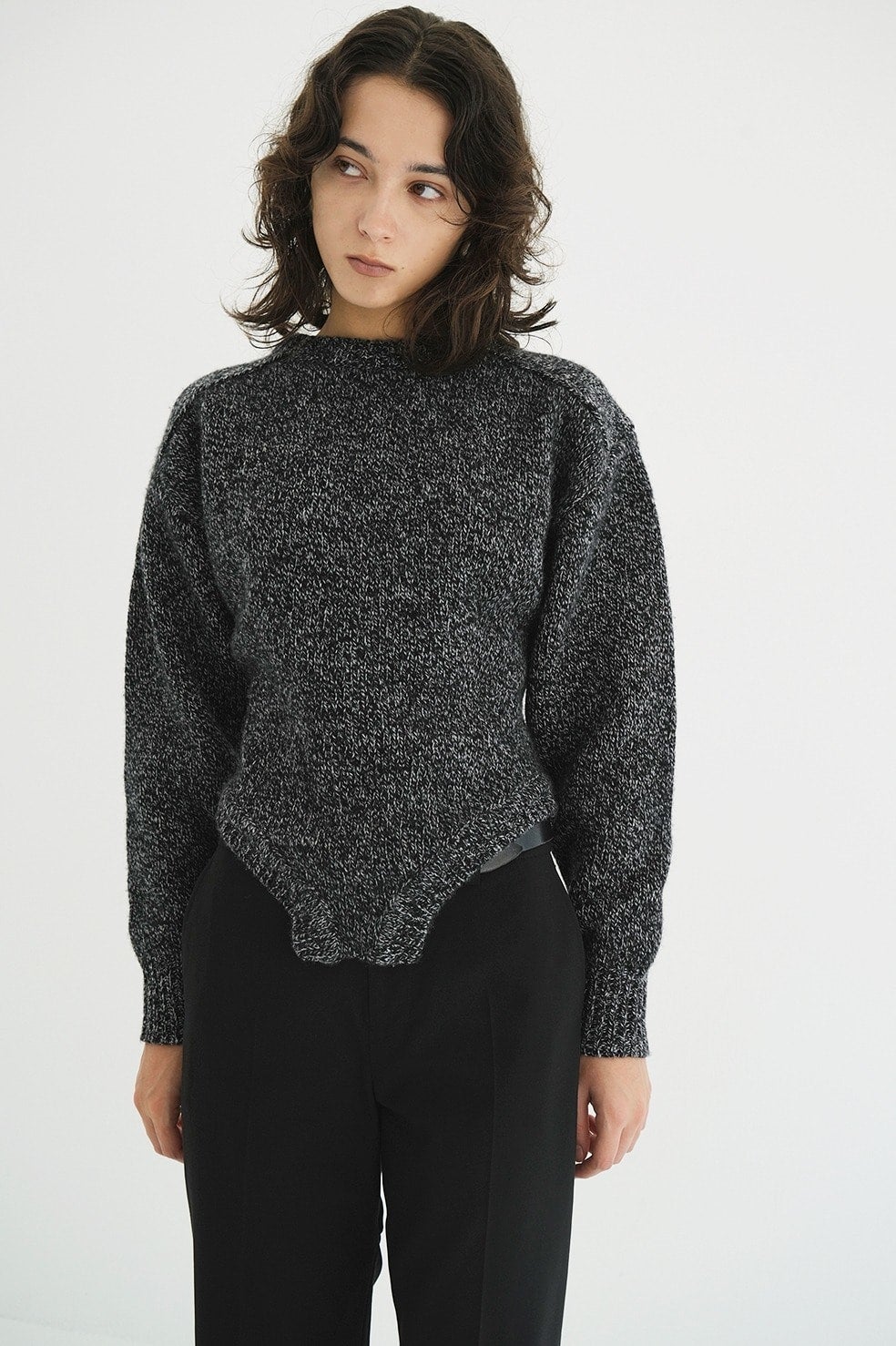 ショルダー部分とウエストのシェイプが印象的な、ボディスーツ型のニットトップス。
