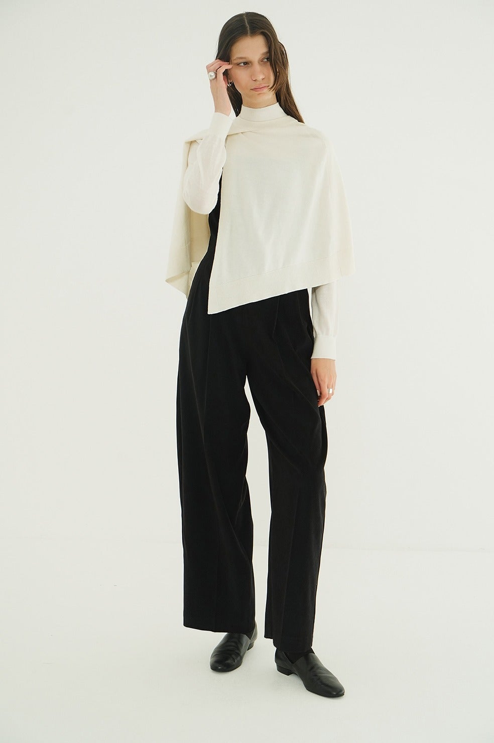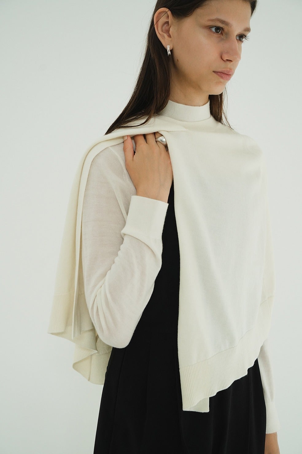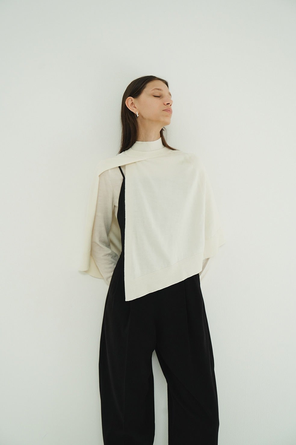 ケープはあえてアシンメトリーなデザインにすることで、肩から自然に羽織ったり、マフラーのように首に巻いたりと、幅広いスタイリングが楽しめます。インナーのハイネックロングスリーブは、シンプルでコンパクトなデザインに仕上げており、単体でも活躍する万能な一枚です。