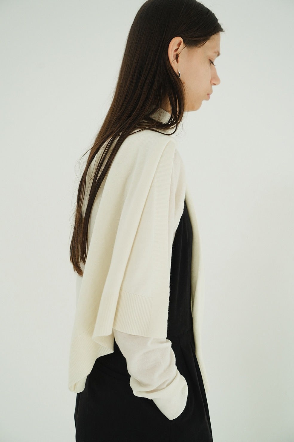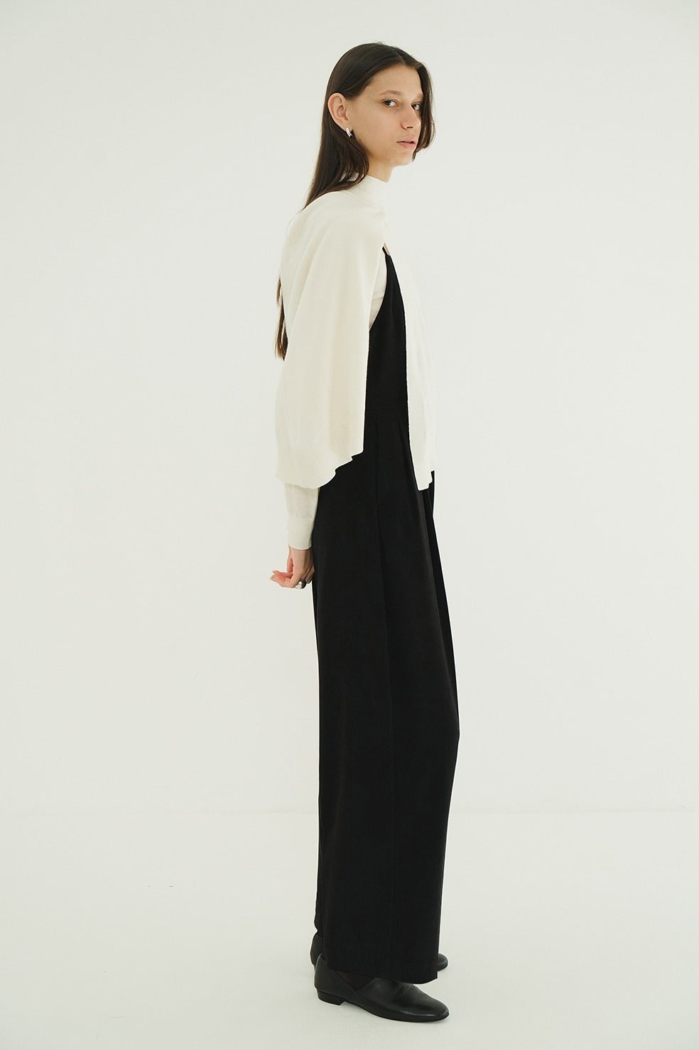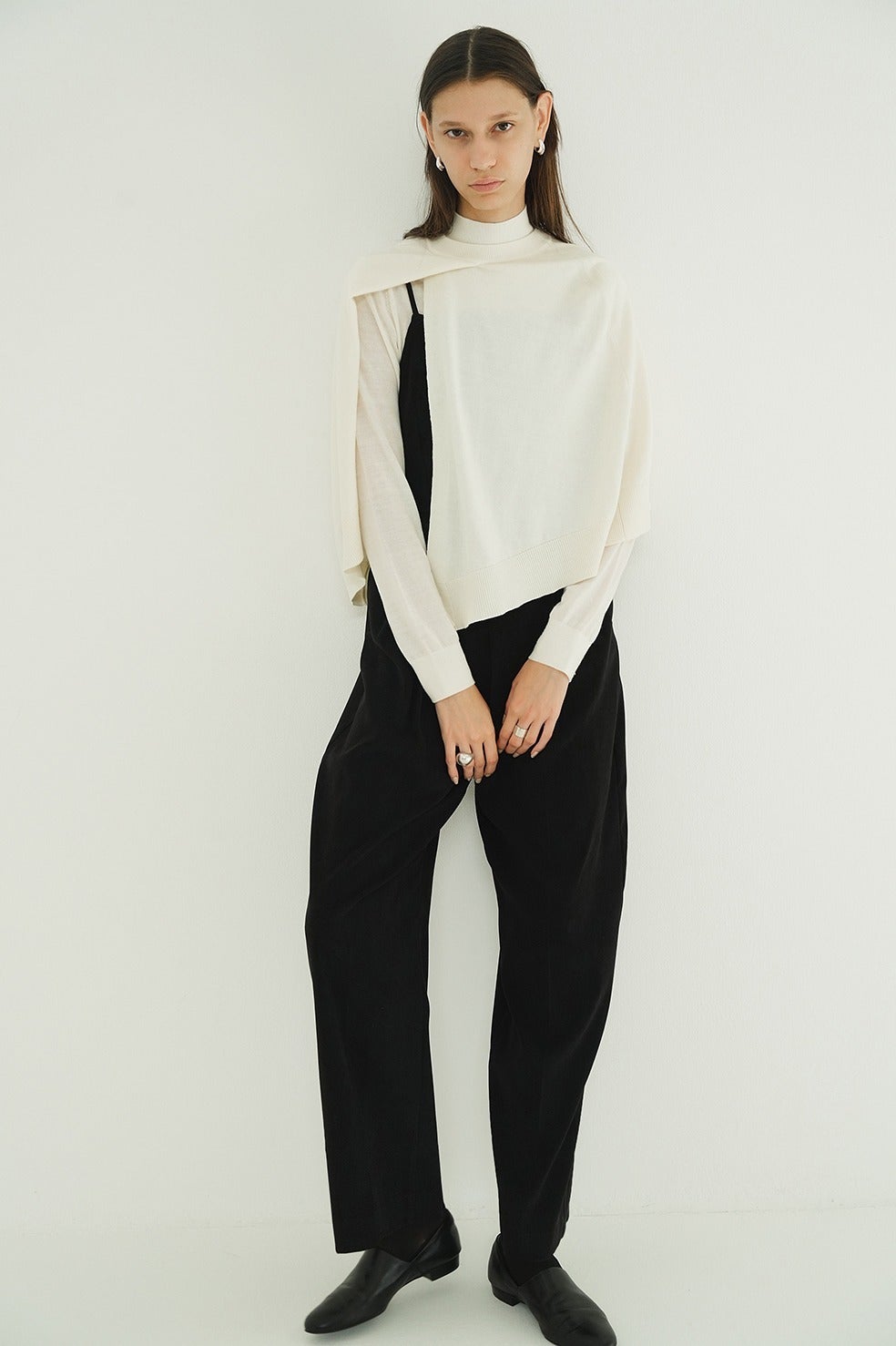 ケープはあえてアシンメトリーなデザインにすることで、肩から自然に羽織ったり、マフラーのように首に巻いたりと、幅広いスタイリングが楽しめます。インナーのハイネックロングスリーブは、シンプルでコンパクトなデザインに仕上げており、単体でも活躍する万能な一枚です。