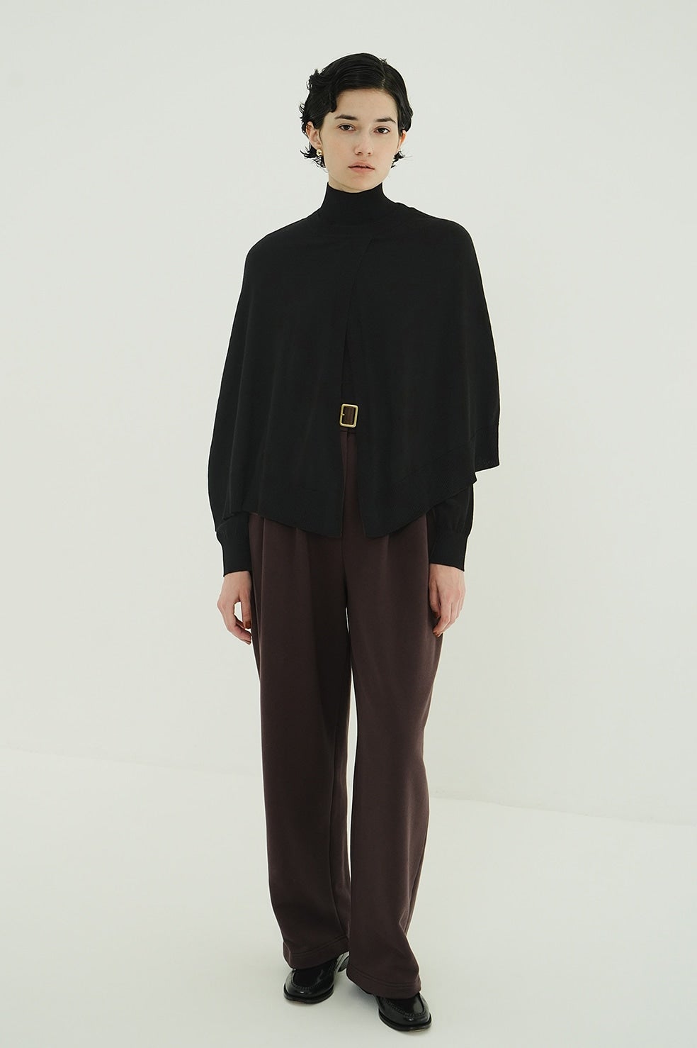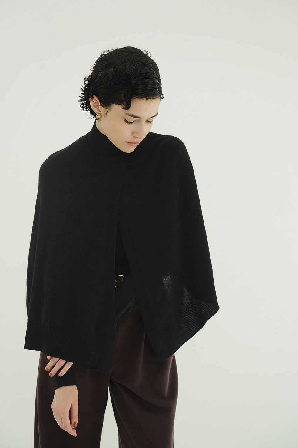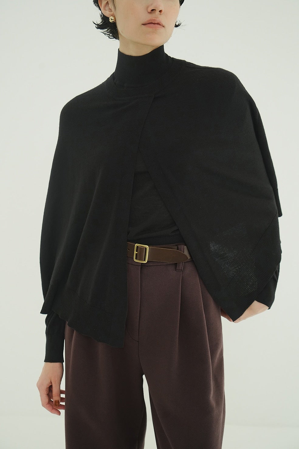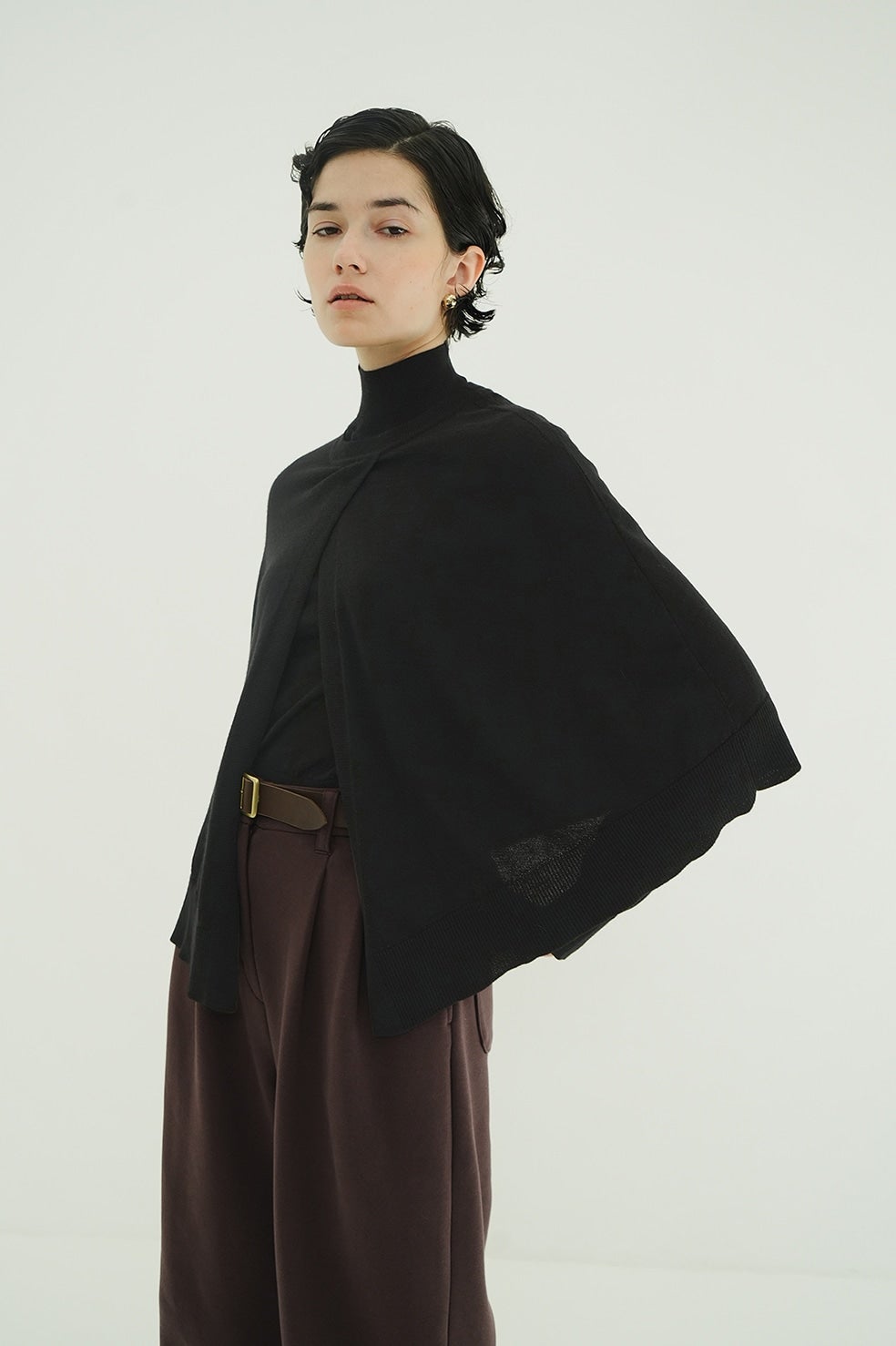 ケープはあえてアシンメトリーなデザインにすることで、肩から自然に羽織ったり、マフラーのように首に巻いたりと、幅広いスタイリングが楽しめます。インナーのハイネックロングスリーブは、シンプルでコンパクトなデザインに仕上げており、単体でも活躍する万能な一枚です。