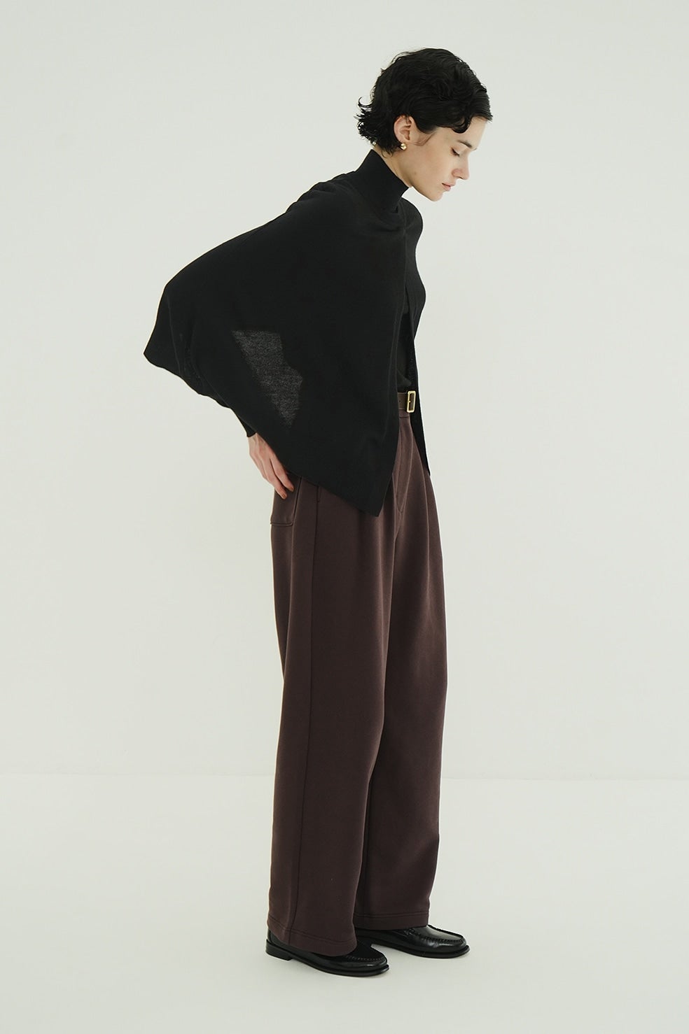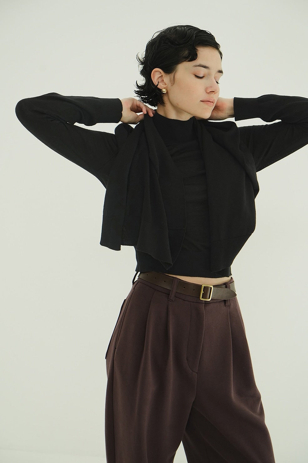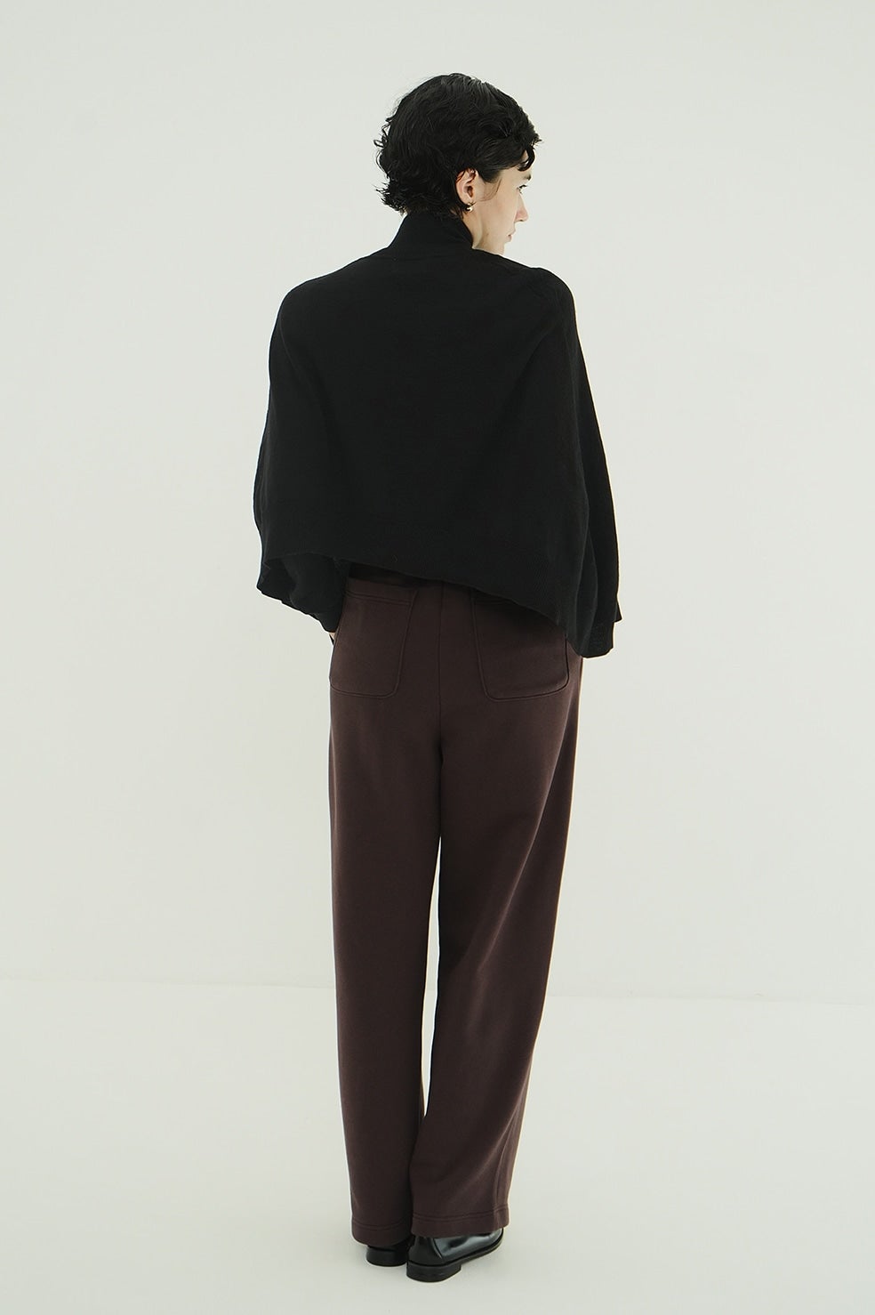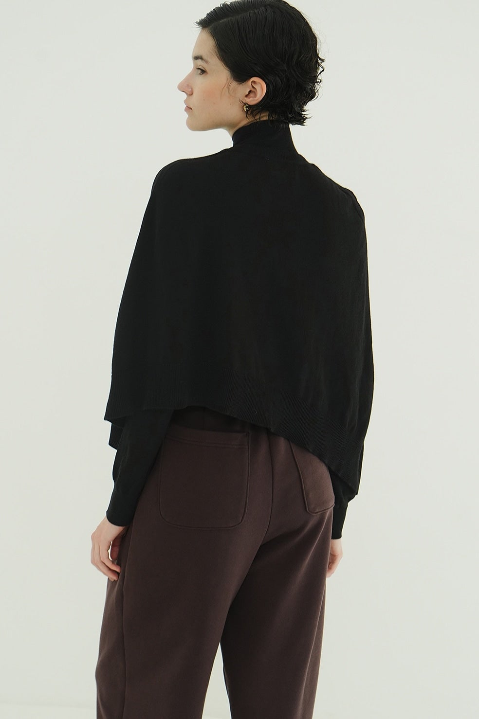ケープはあえてアシンメトリーなデザインにすることで、肩から自然に羽織ったり、マフラーのように首に巻いたりと、幅広いスタイリングが楽しめます。インナーのハイネックロングスリーブは、シンプルでコンパクトなデザインに仕上げており、単体でも活躍する万能な一枚です。