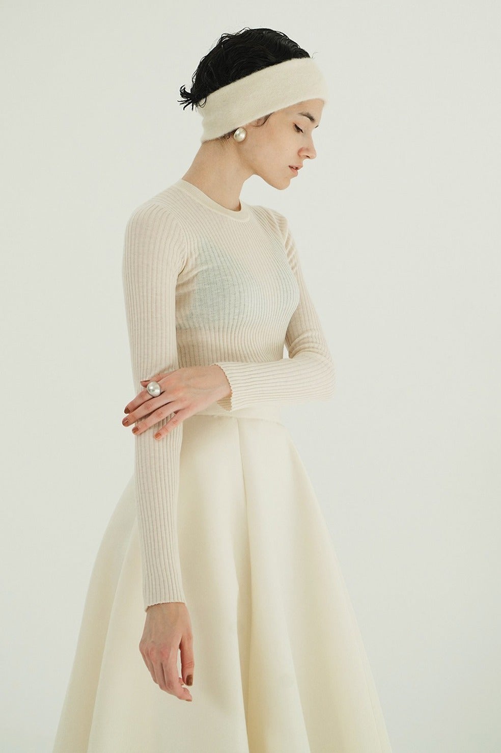 細い番手の糸を16ゲージで丁寧に編み立てた、繊細なシアーリブニット。