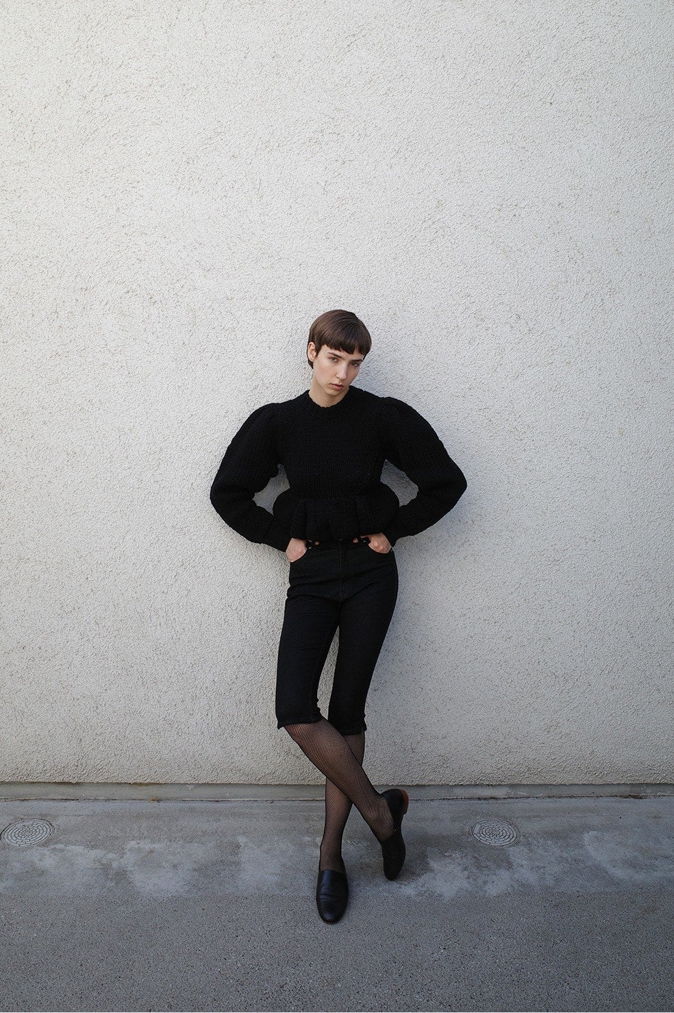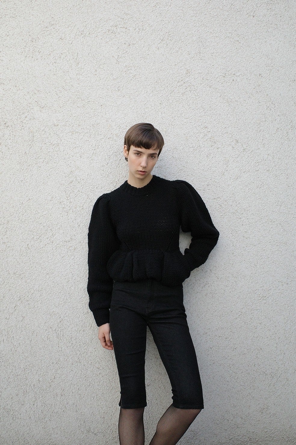 肩のパフデザインとウエストの切り替えから生まれる、ボリューム感のあるペプラムシルエットが女性らしさを引き立てます。全体的にコンパクトなサイズ感に仕上げたことでモードな印象に、ペプラム部分の両脇にはポケットを備え、実用性もプラスしました。