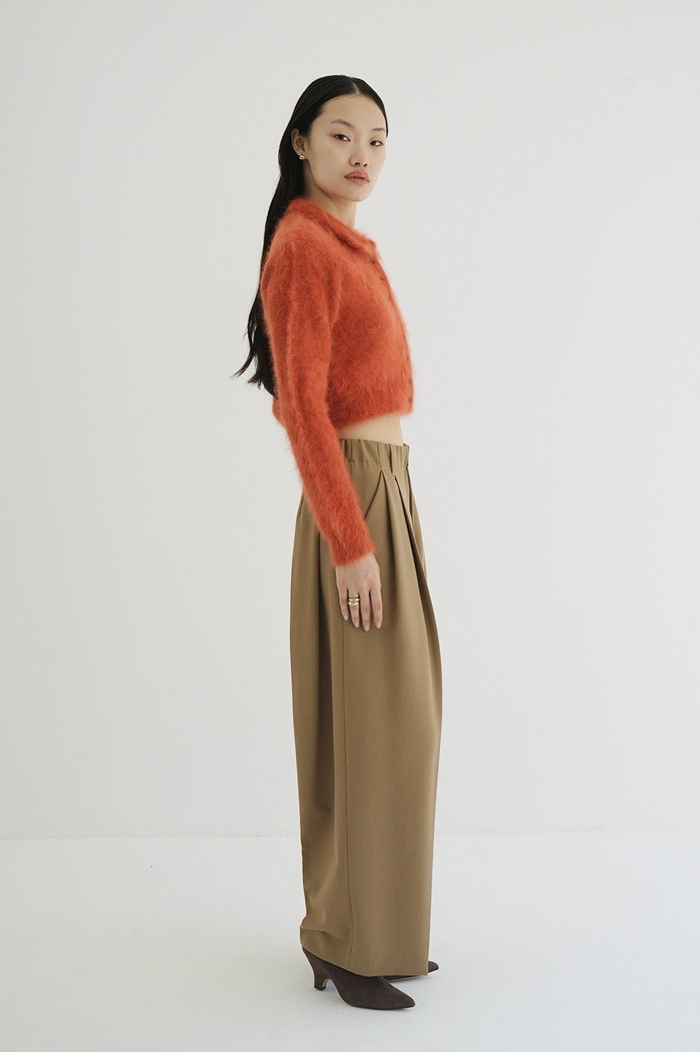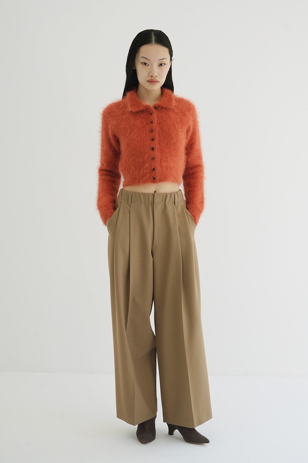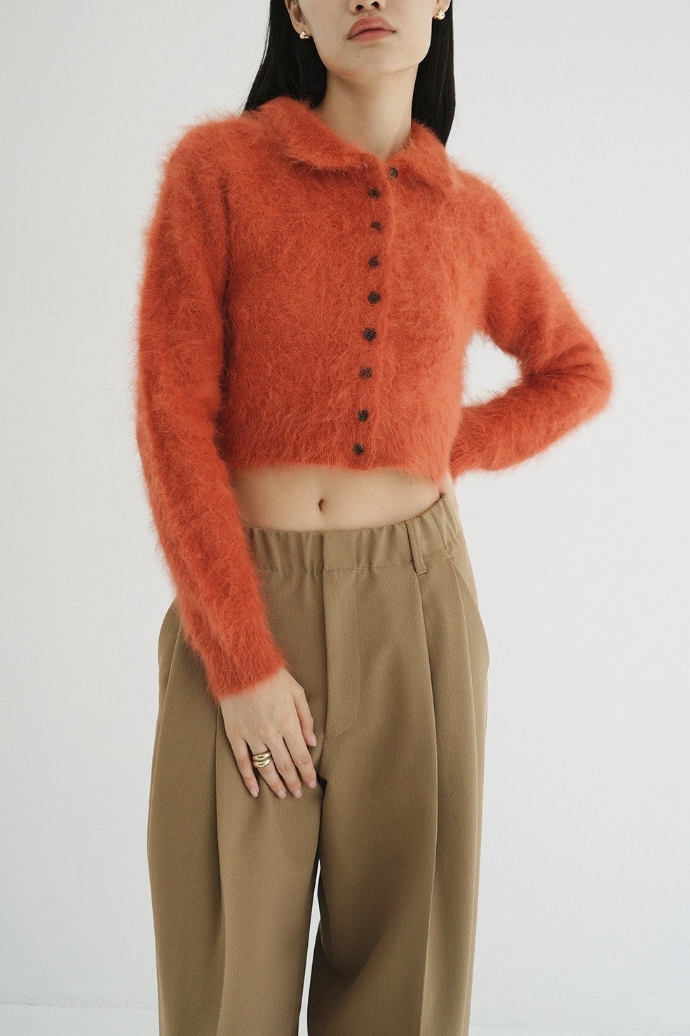 アンゴラ特有の毛足のある編み地に、襟元のバランスやボタン使いで甘くなりすぎないようデザインしました。袖はやや長めに、着丈は短めに設定し、全体をコンパクトなサイズ感に。
