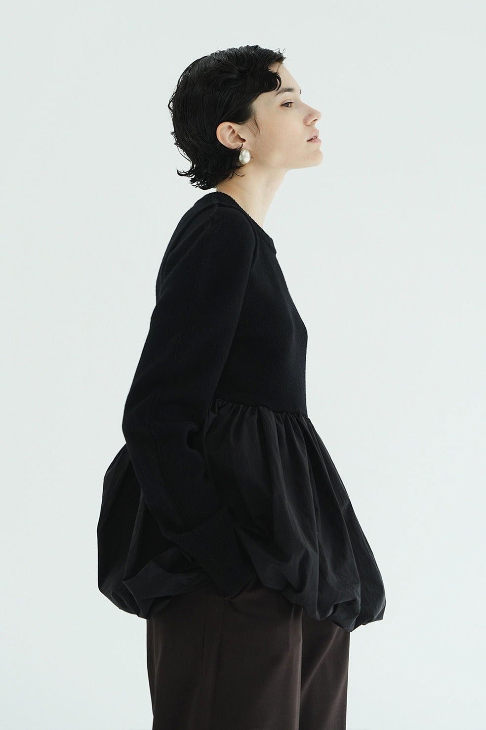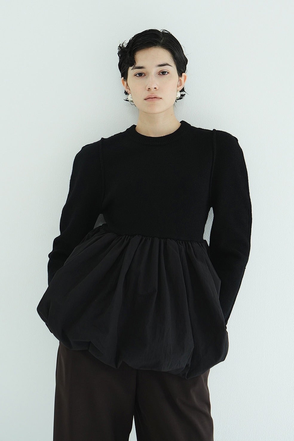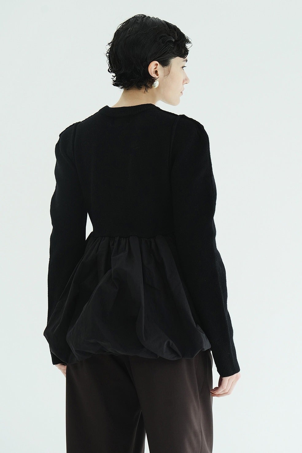 ニットとバルーンスカートがドッキングされた、デザイン性の高いニットトップス。
