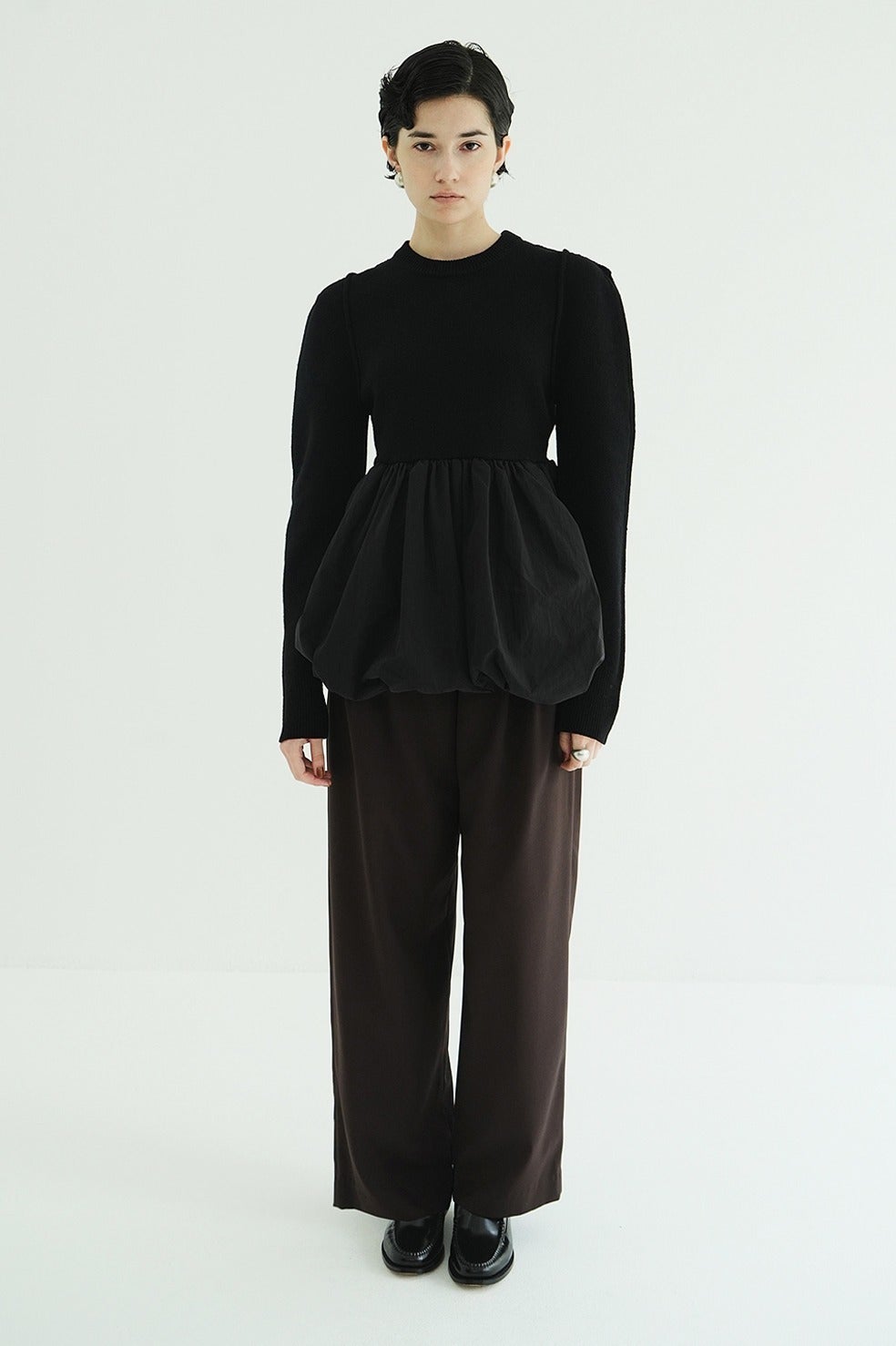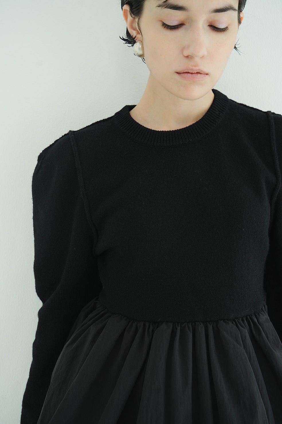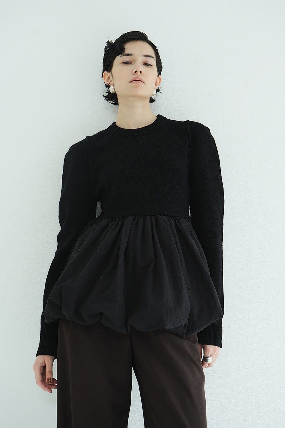 ニットとバルーンスカートがドッキングされた、デザイン性の高いニットトップス。