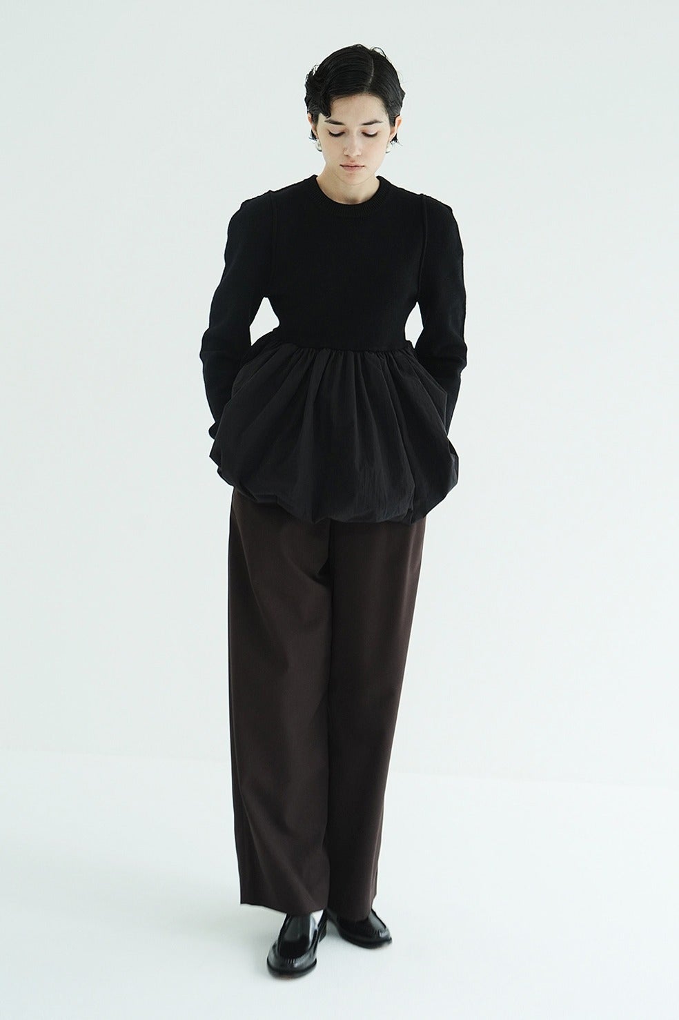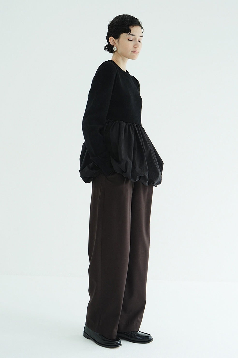 バルーンスカート部分にはハリ感のあるコットンナイロン素材を使用し、贅沢にタックギャザーを入れることで、立体感のある美しいフォルムを実現。
