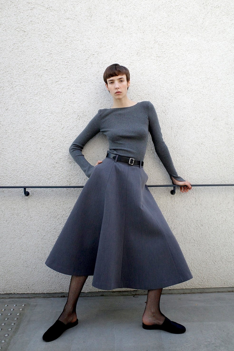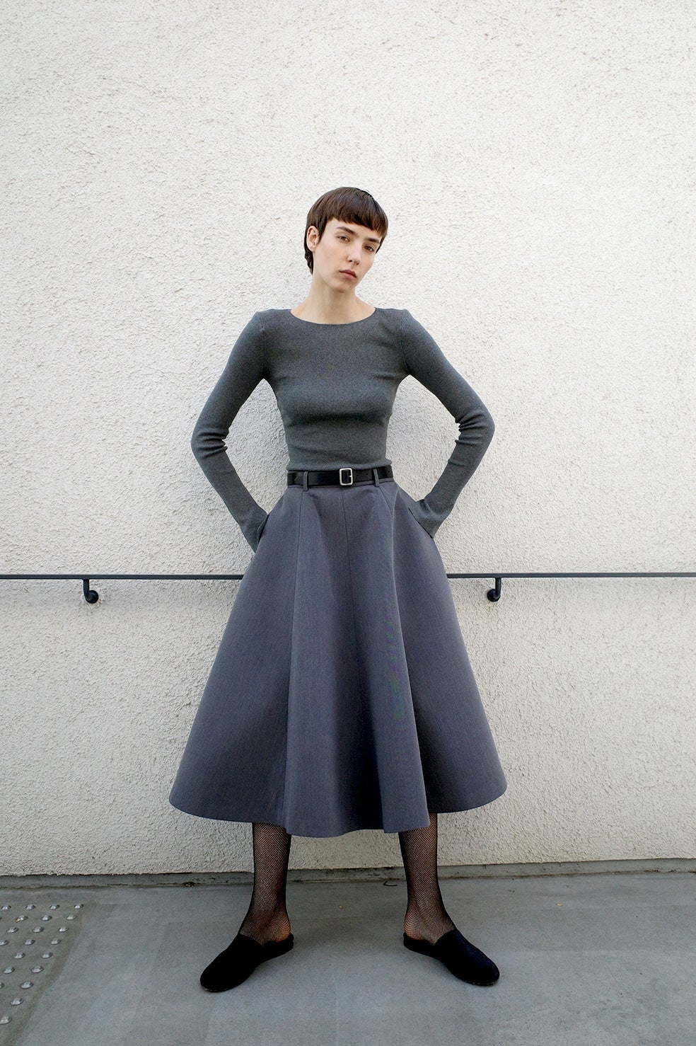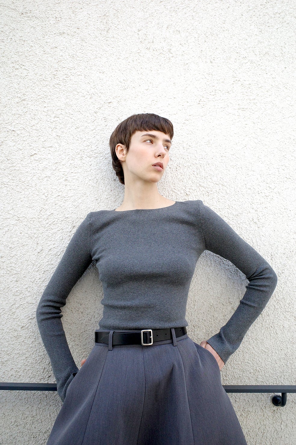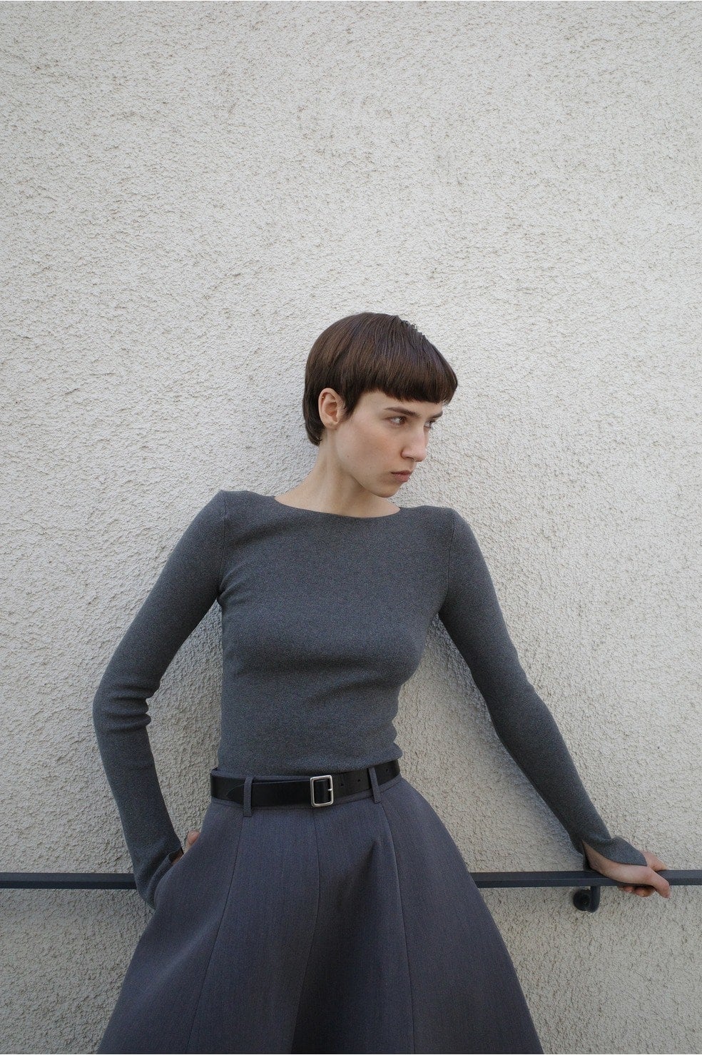 肩には取り外し可能な薄めの肩パッドを施し、袖口にはスリットを入れた長めのスリーブデザインで、シンプルながらもモードな印象に仕上げています。ストレッチ性が高く、コンパクトなシルエットながら快適な着心地が魅力です。