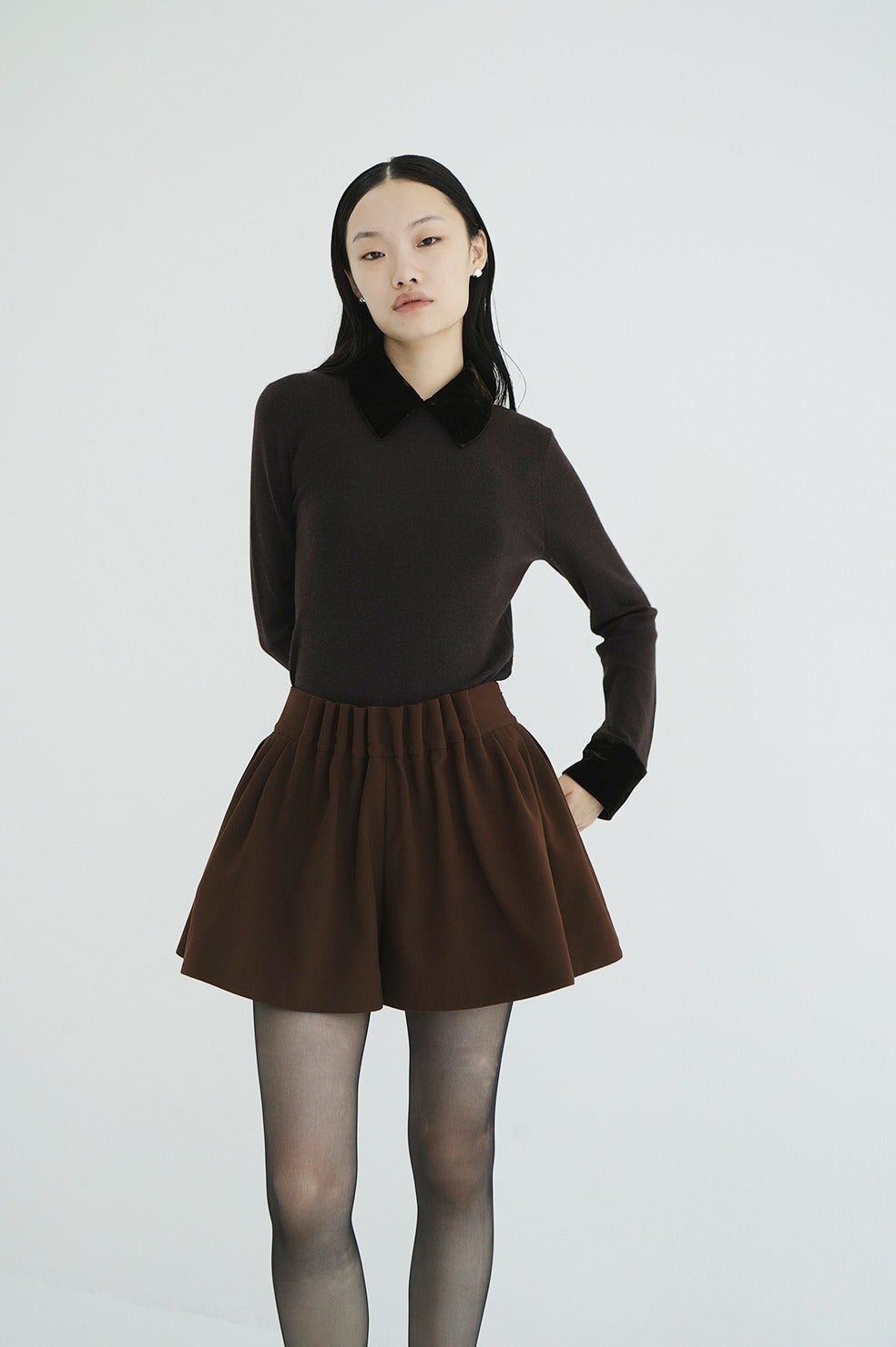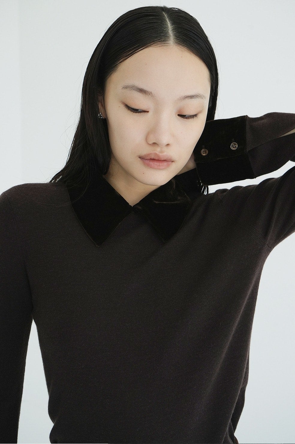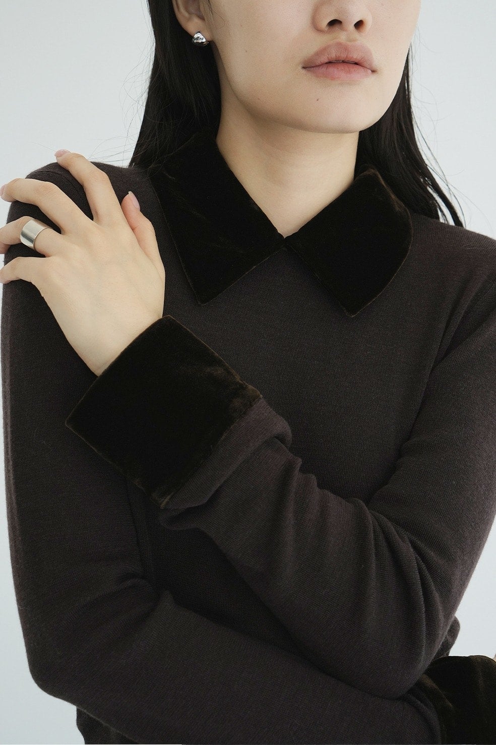 ベロア素材を組み合わせて仕上げた、レディな印象のニットトップス。