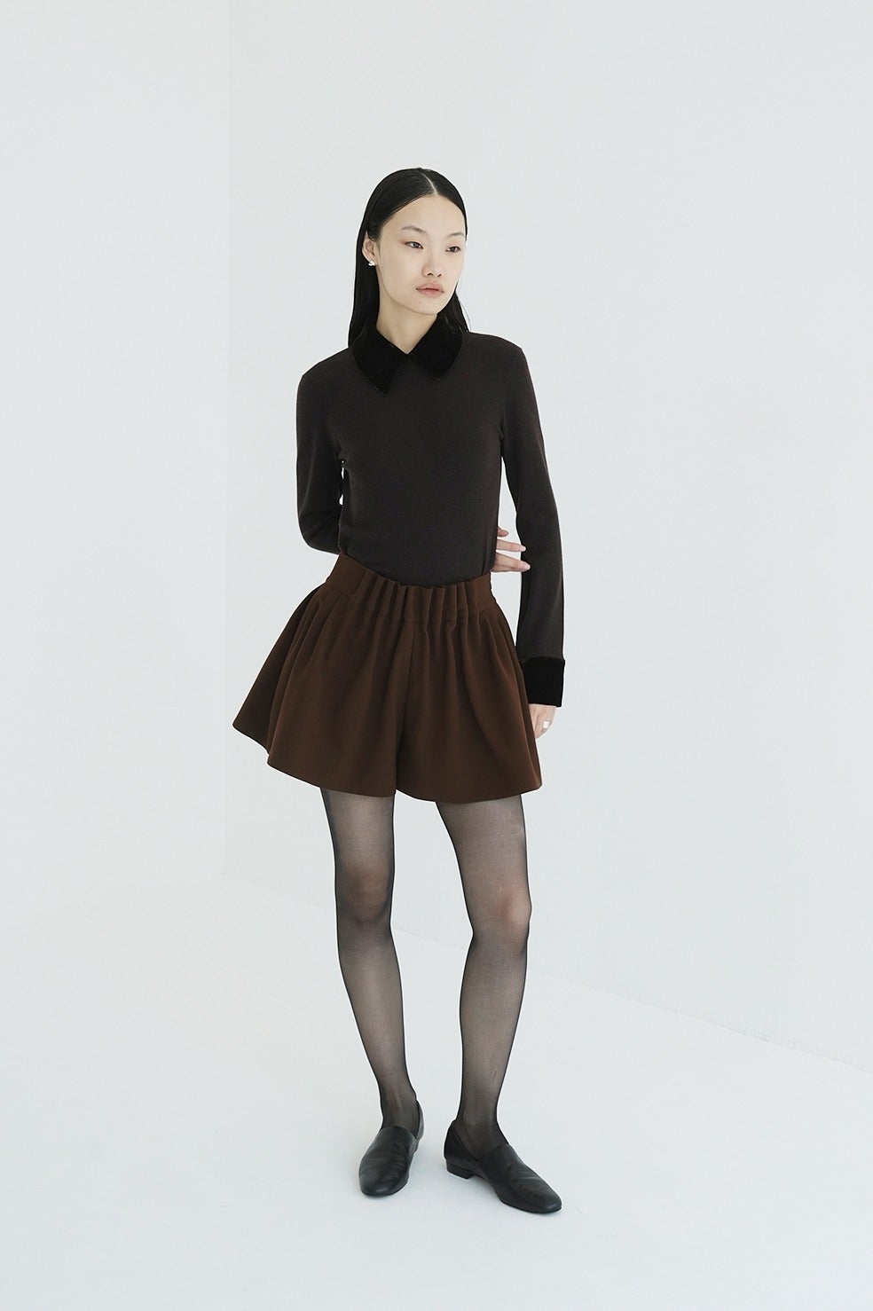 シャープな襟と袖のカフスデザインが、CLANEらしいモードさをプラスします。さらに襟と袖には光沢感のあるベロア素材がアクセントで、シンプルながらも上品で洗練された印象に。