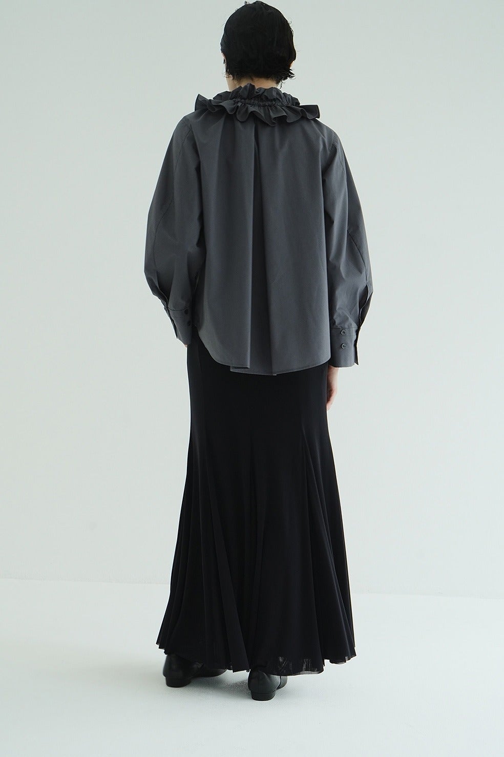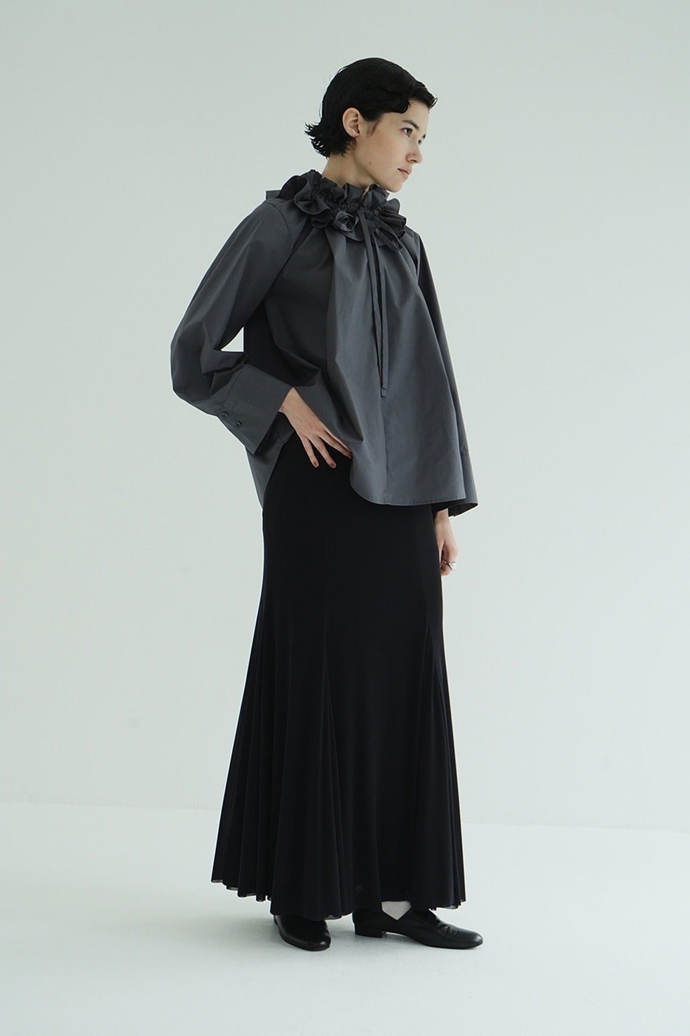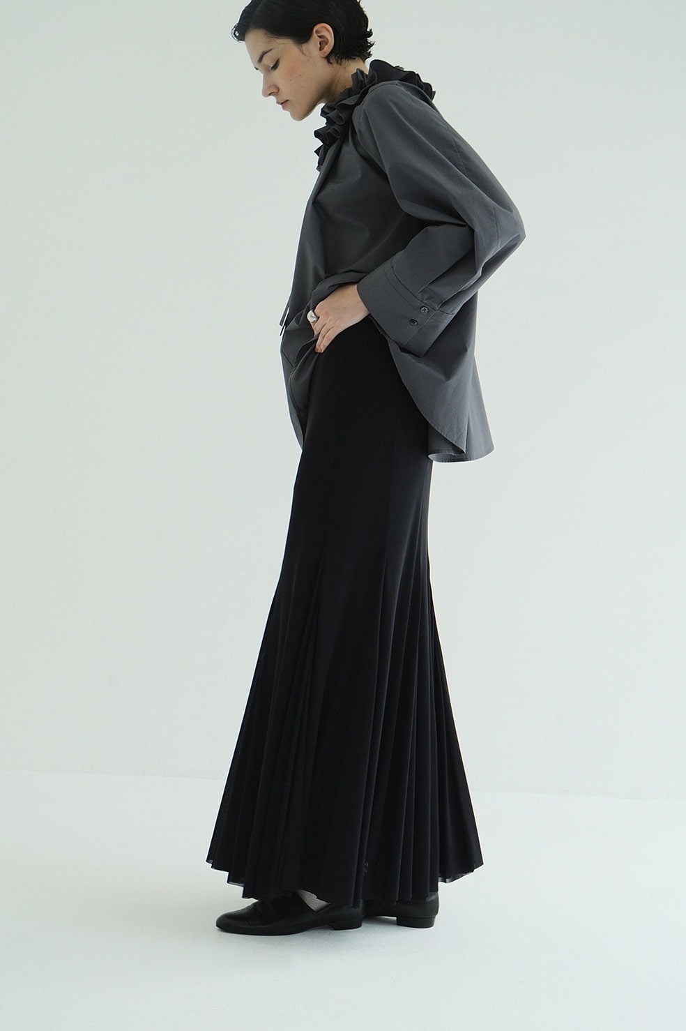 ふくらみのある柔らかさと、さらっとしたタッチが心地良いシアー素材を使用し、生地の落ち感を活かしてナチュラルなマーメイドラインに仕上げました。透け感のあるシアー素材を2枚重ねることで、奥行きのあるニュアンスを表現。