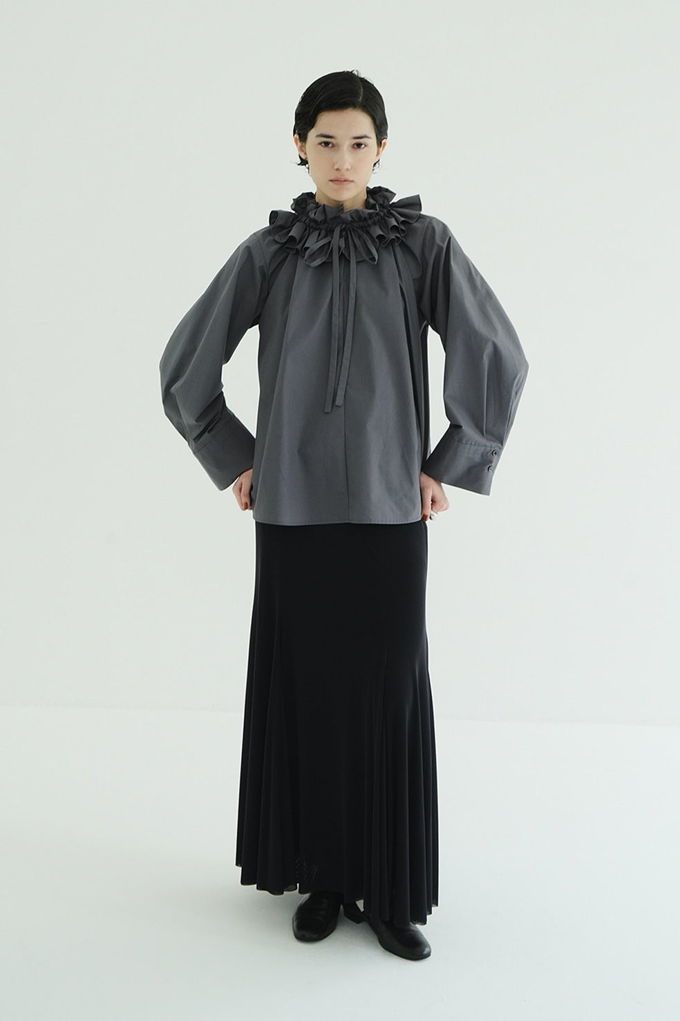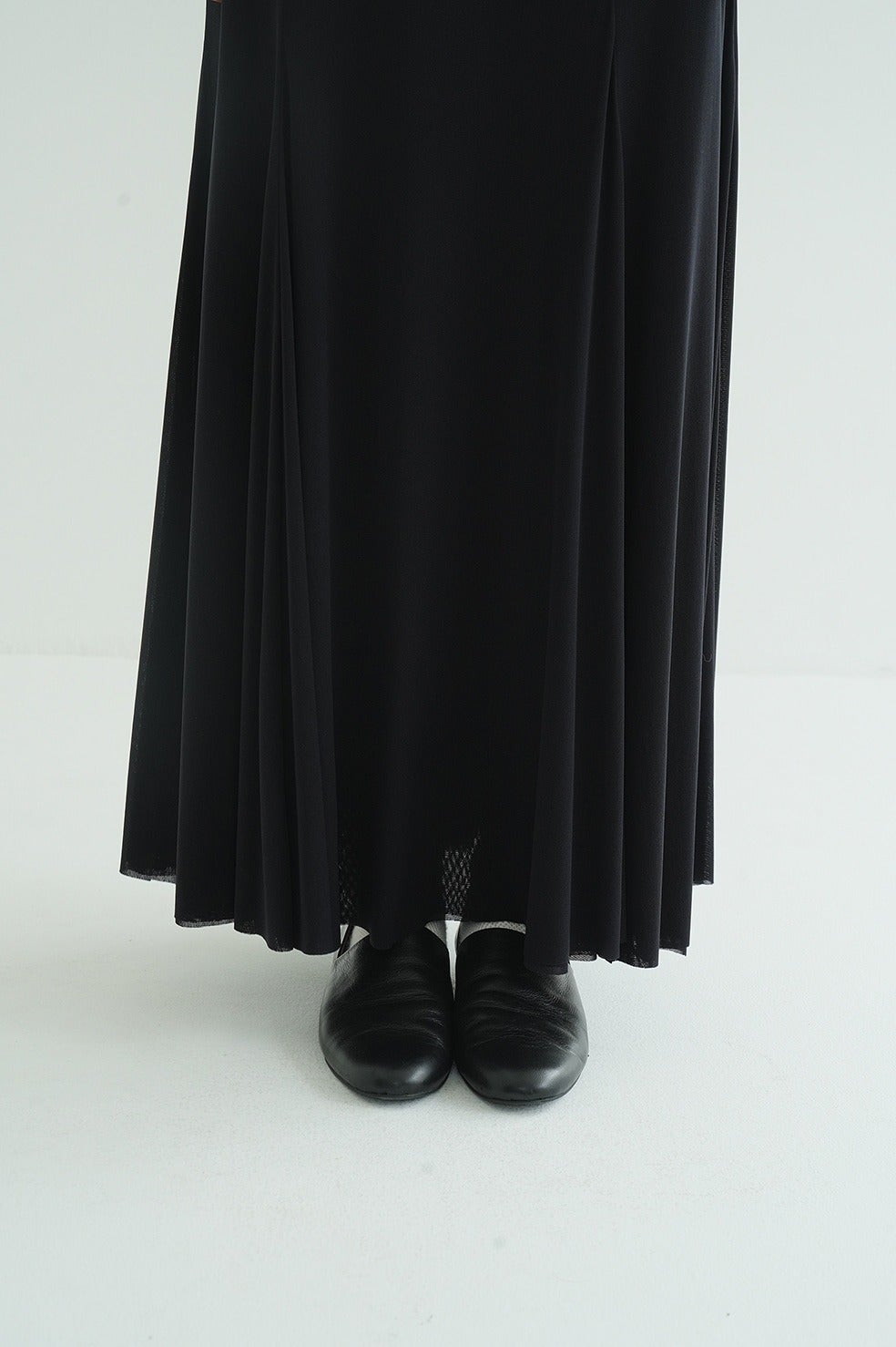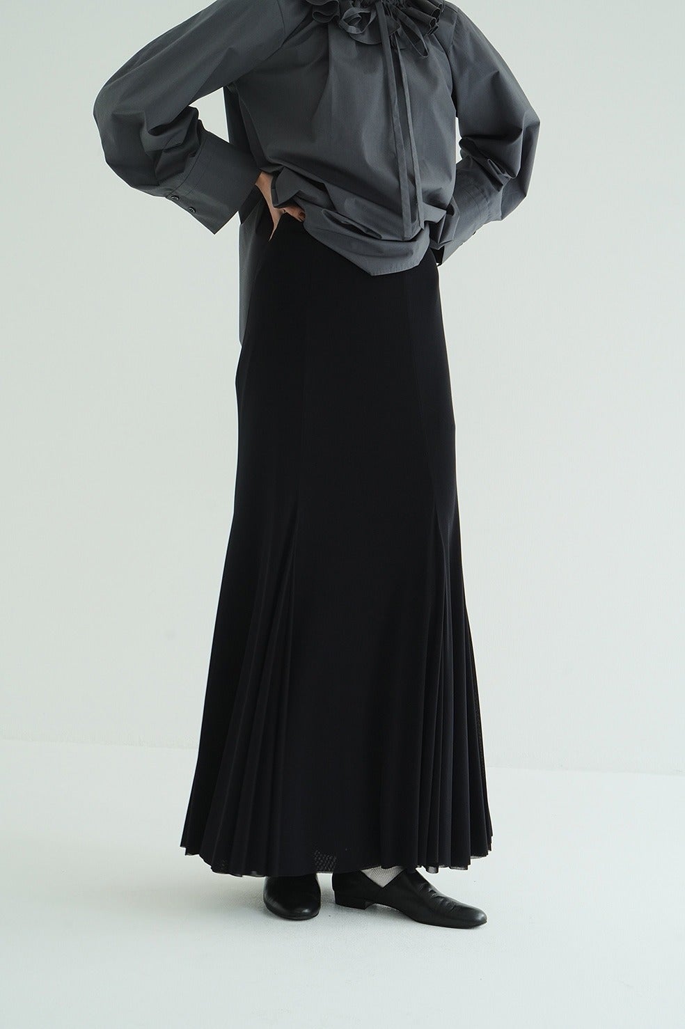 ふくらみのある柔らかさと、さらっとしたタッチが心地良いシアー素材を使用し、生地の落ち感を活かしてナチュラルなマーメイドラインに仕上げました。透け感のあるシアー素材を2枚重ねることで、奥行きのあるニュアンスを表現。