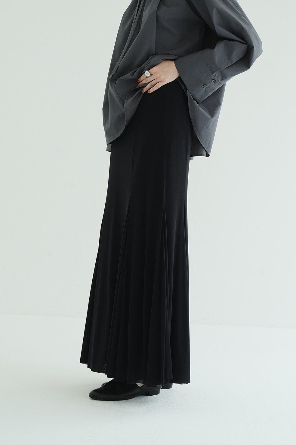 流れるようなラインがポイントのローウエストシアーマーメイドスカート。