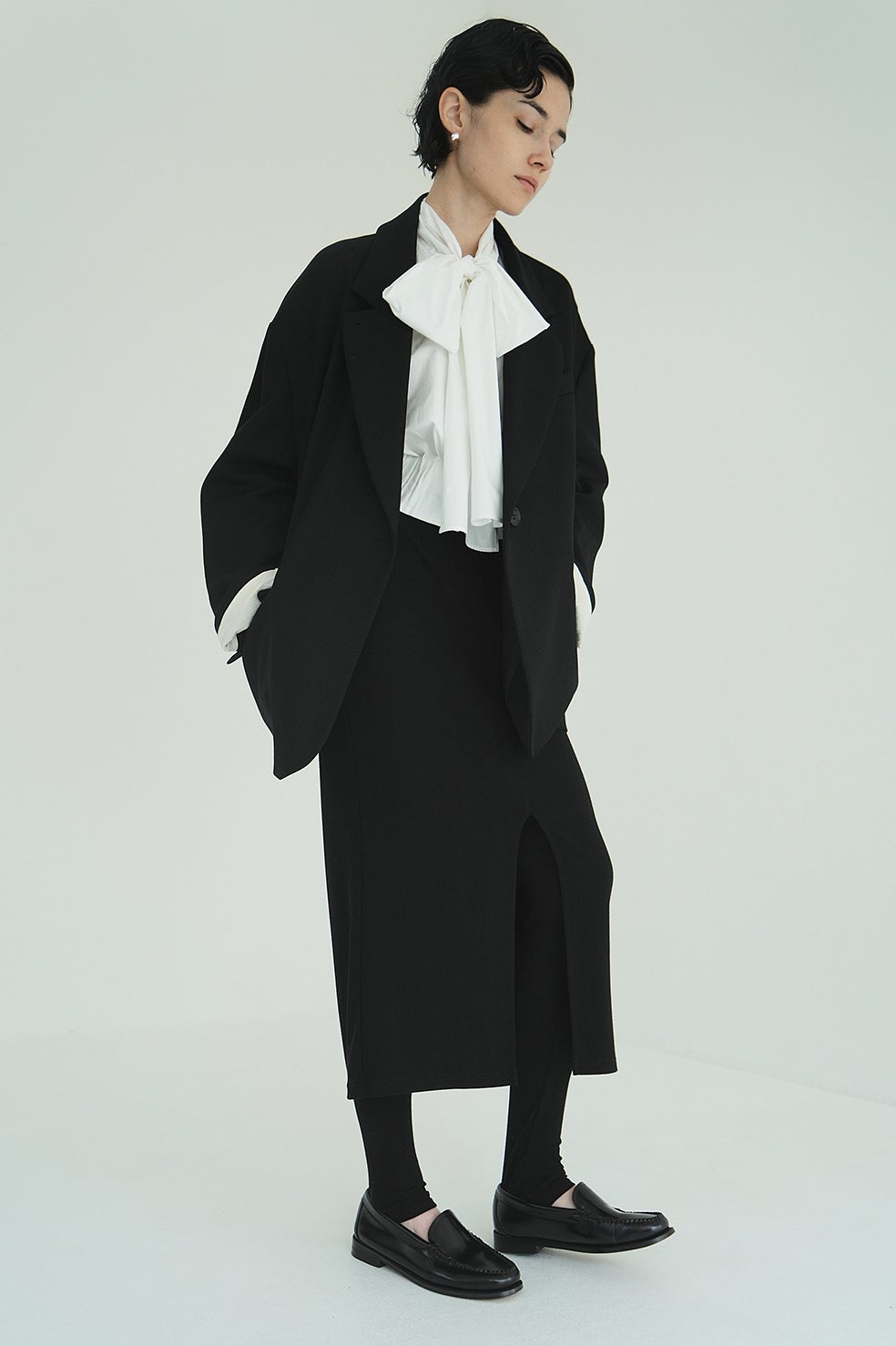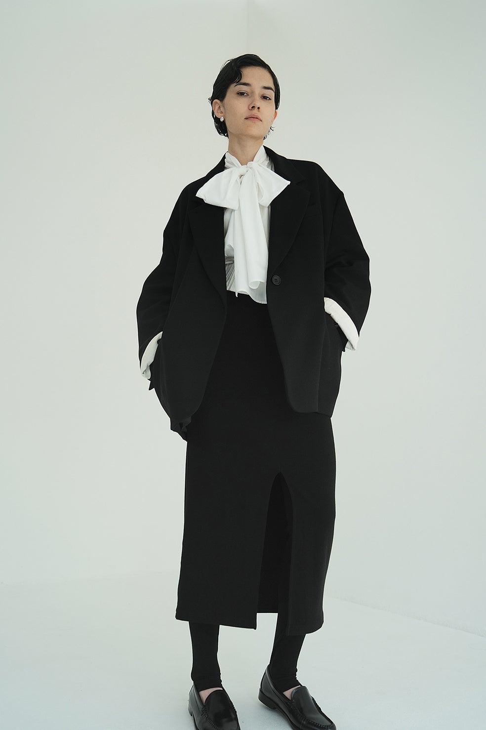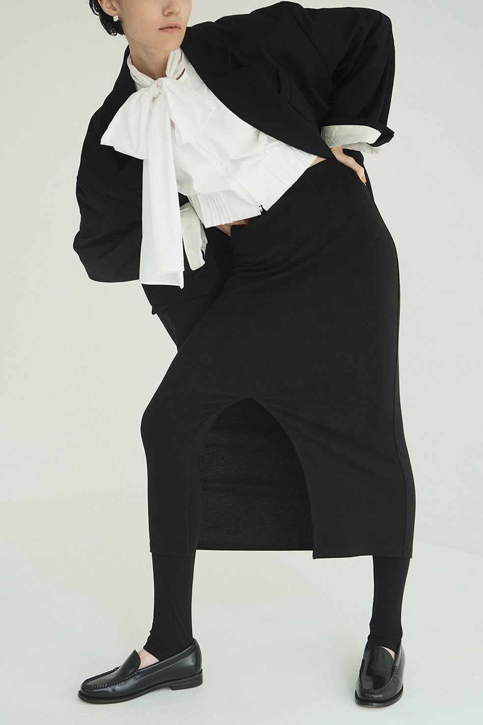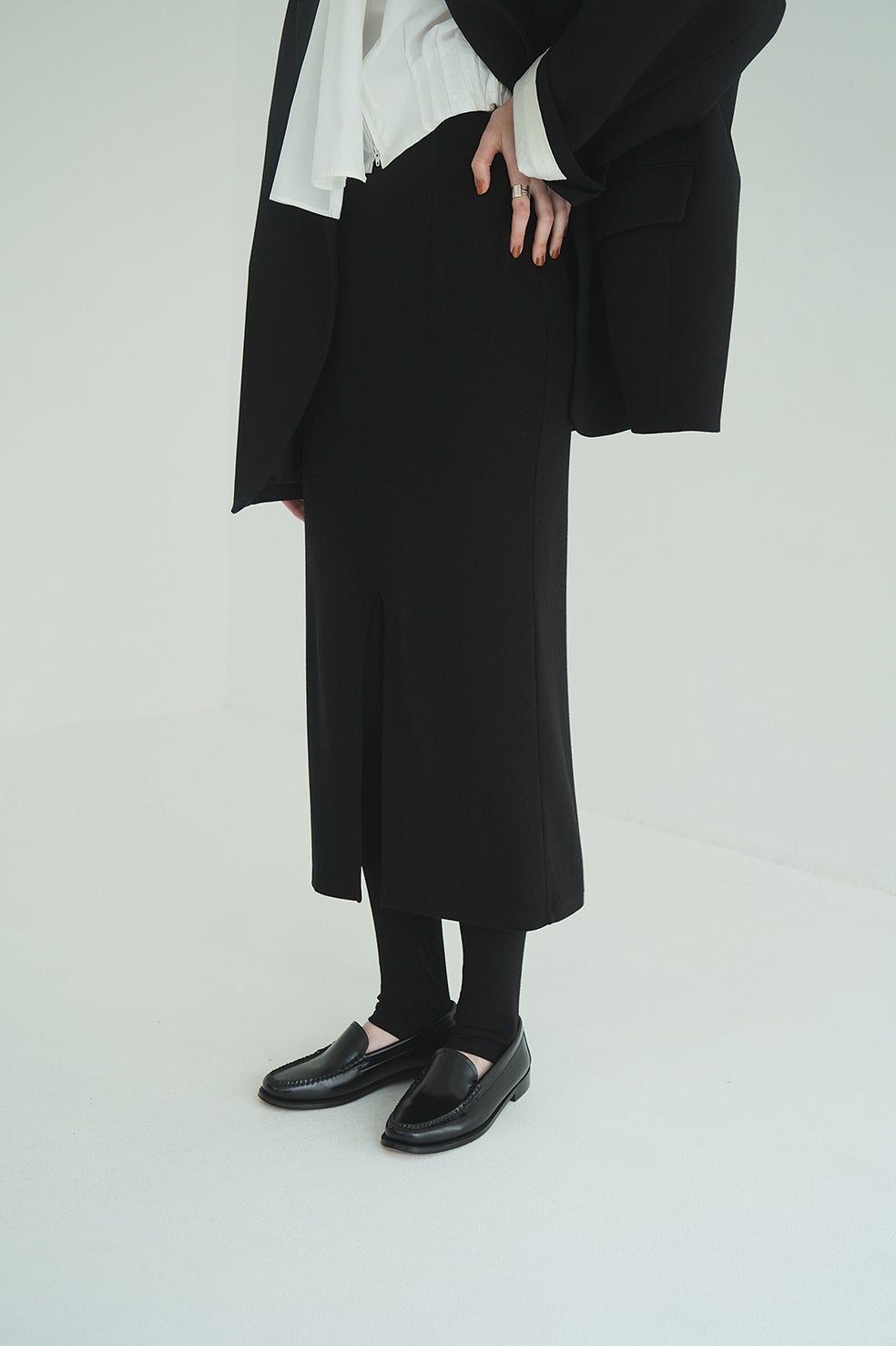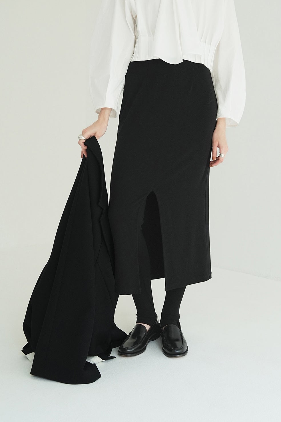 スカートは前スリットでも、後ろスリットでも着用可能なので、スタイリングに合わせてお好みに着用いただけます。