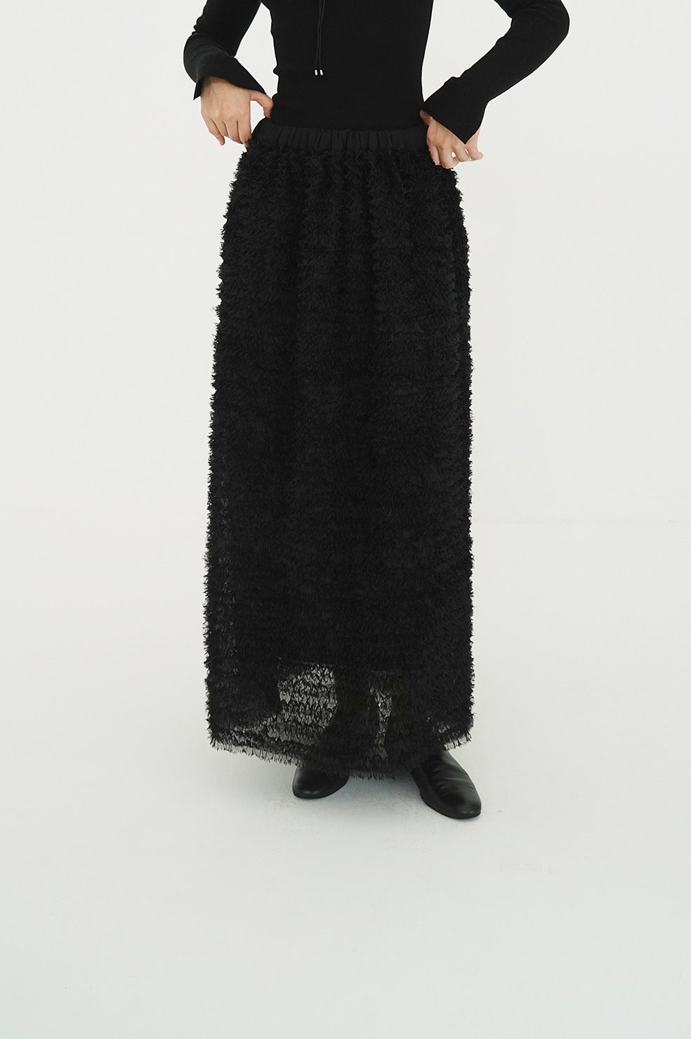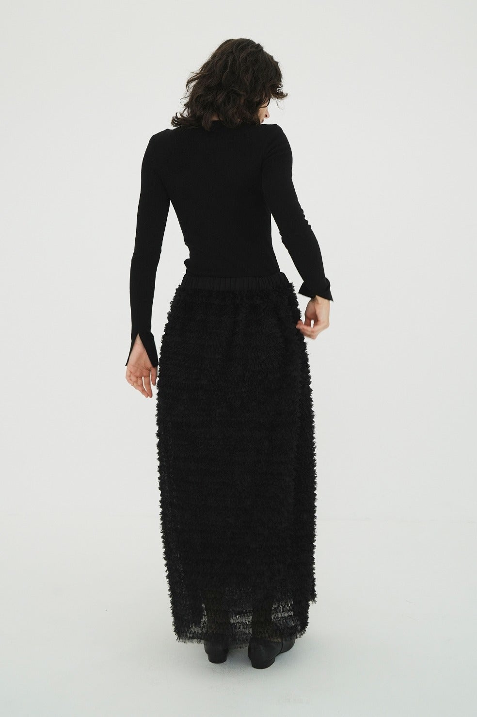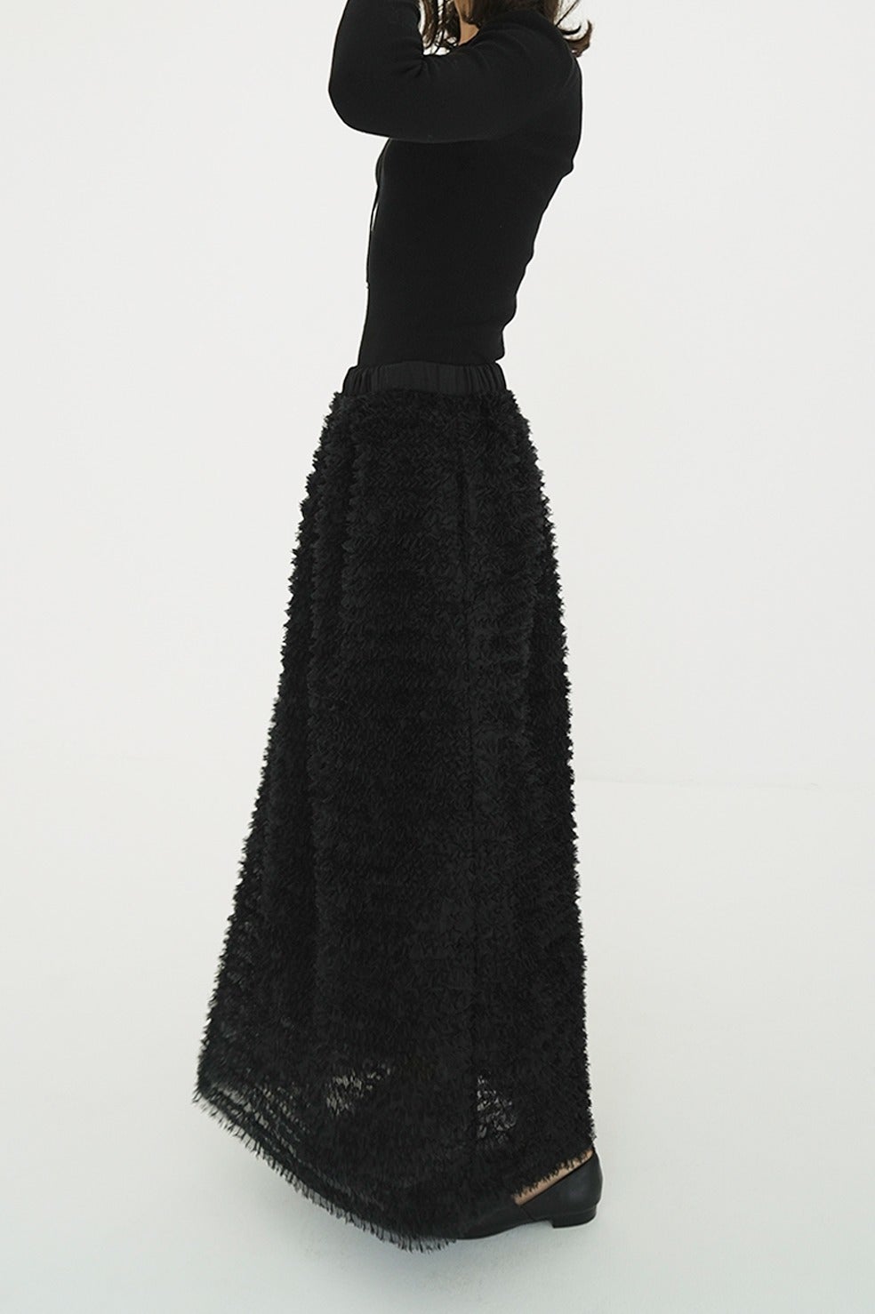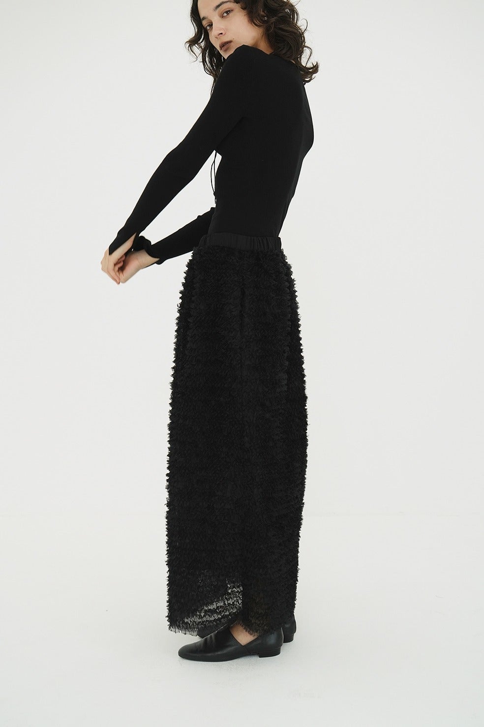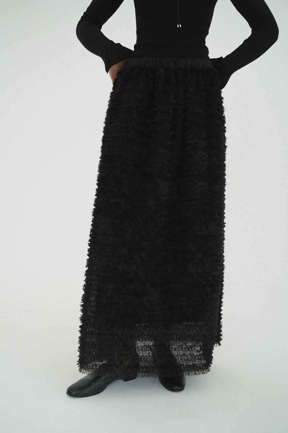 ウエストはゴム仕様で、サイズを選ばず安定感のある履き心地に。裏地とフリル生地の間にチュールを一枚挟むことで、ボリュームのあるシルエットに仕上げました。