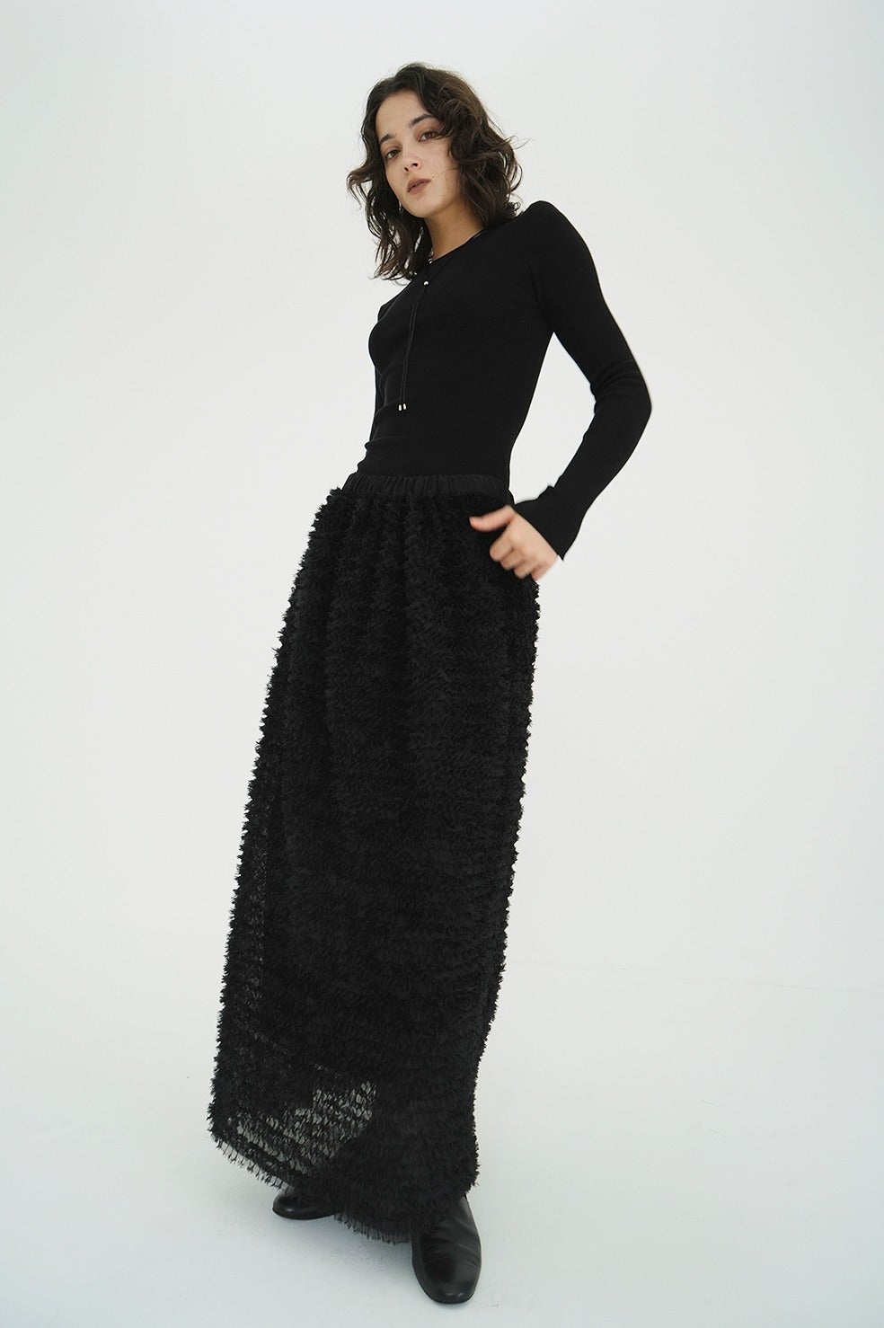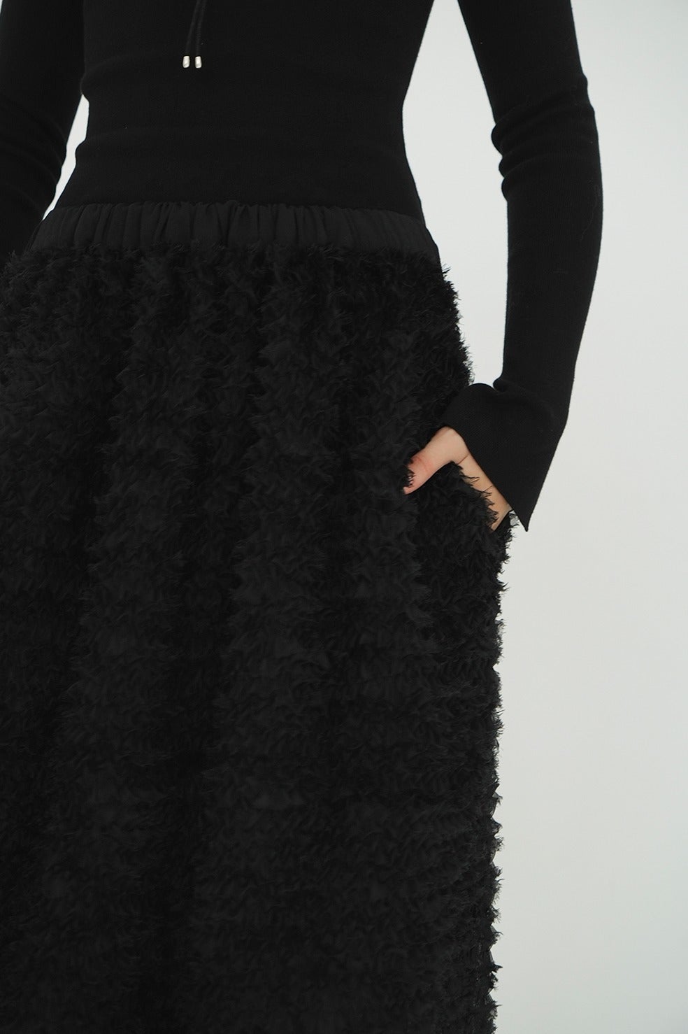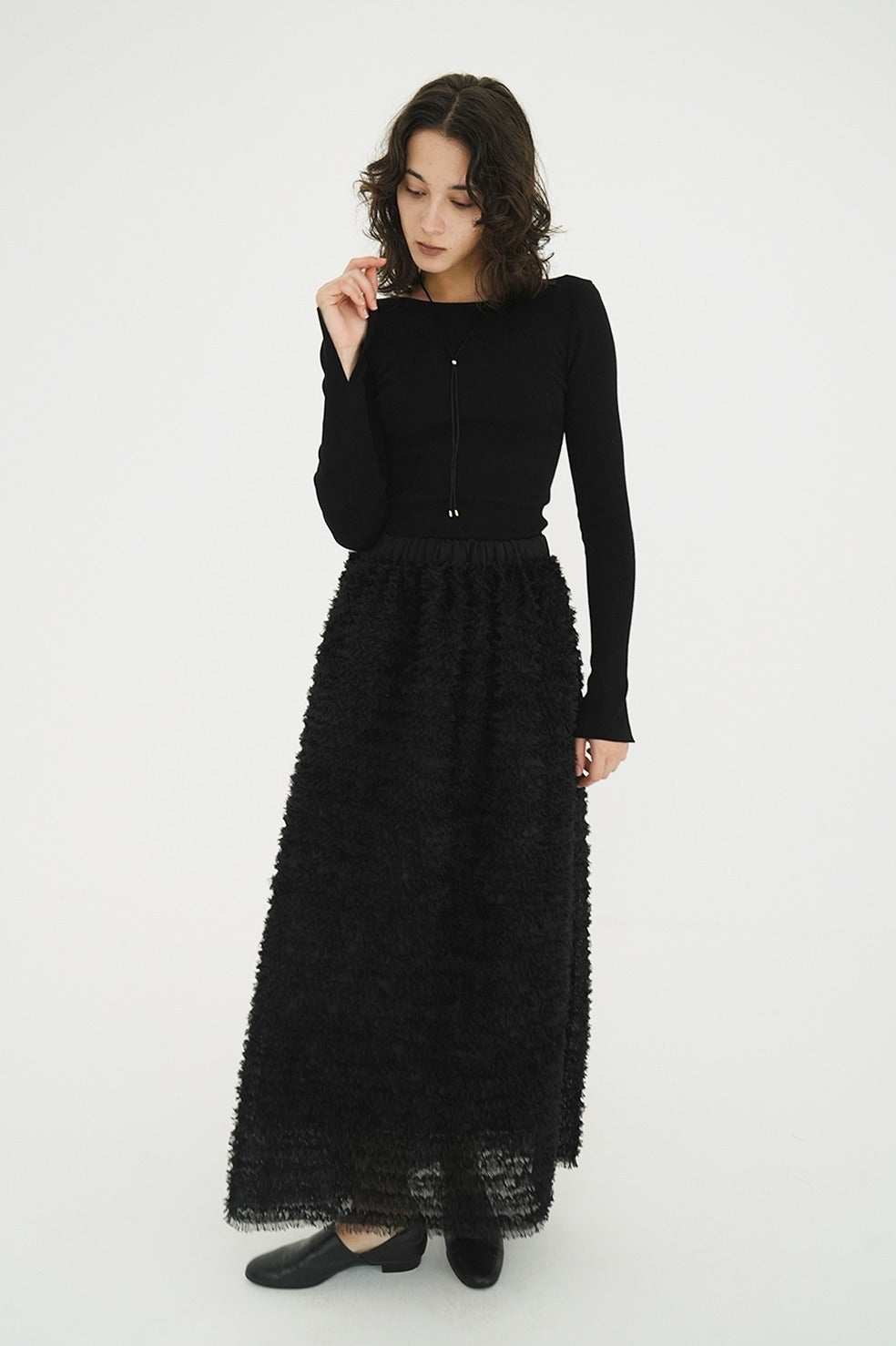 贅沢にギャザーを寄せ、フリル生地をふんだんに使ったドームスカート。