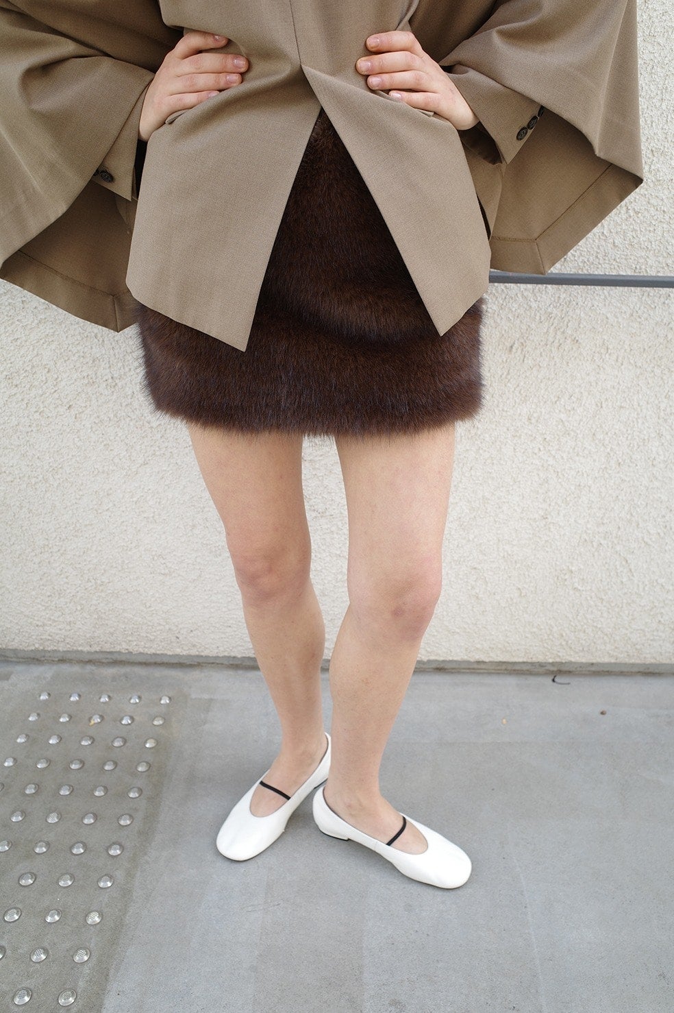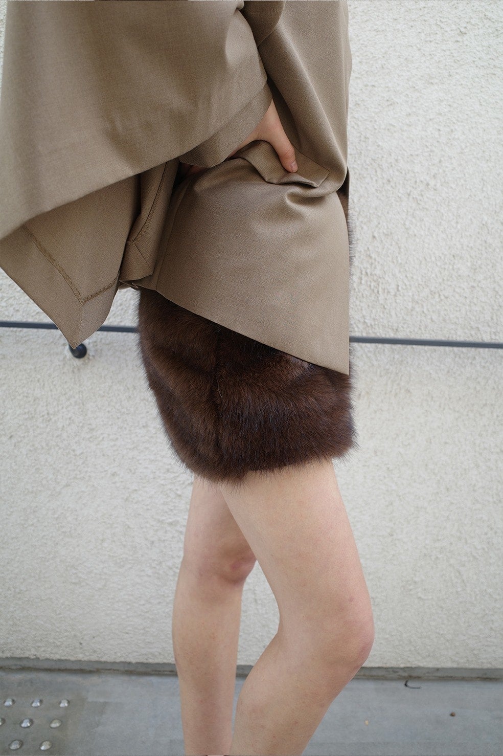 毛足の長いファーを使用した、ローウエストのミニスカート。