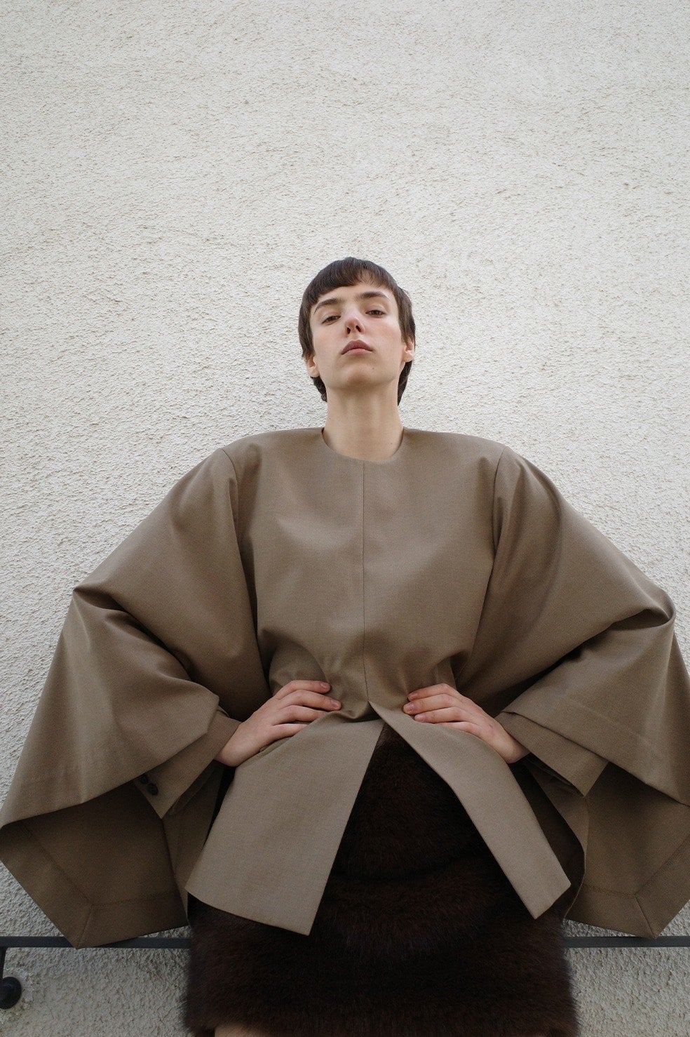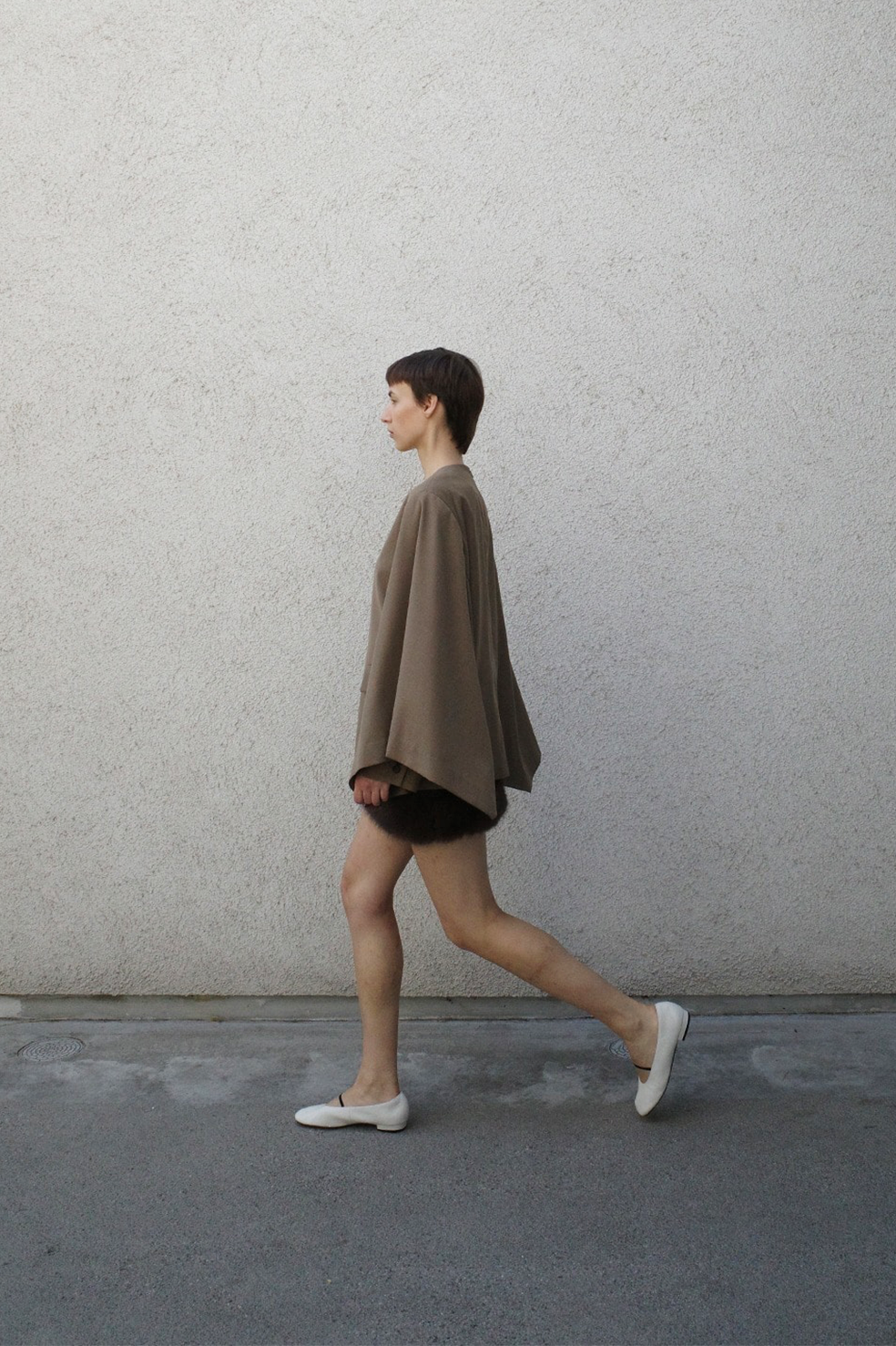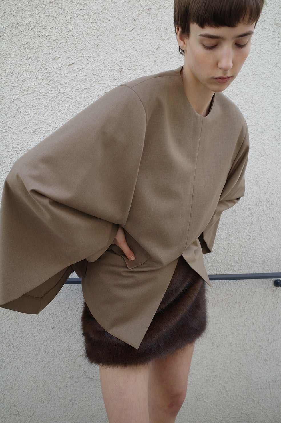 艶を抑え毛並みがしっかり立つ素材を採用し、上品さの中にモードな雰囲気を演出する一着です。スカートの内側にはショートパンツをドッキングし、動いてもインナーが見えない安心の仕様に。
