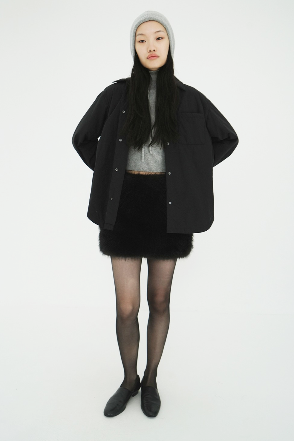 毛足の長いファーを使用した、ローウエストのミニスカート。
