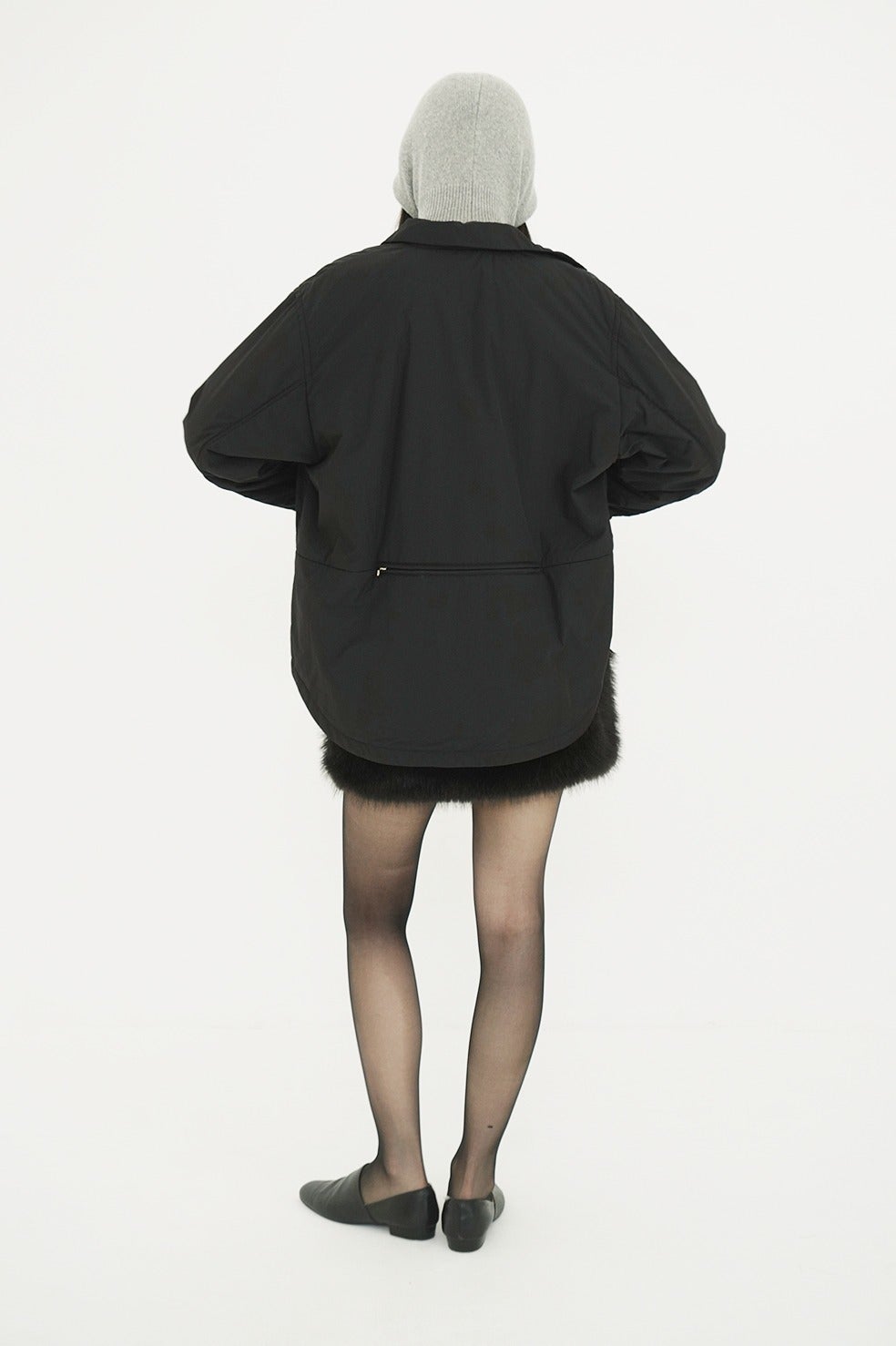 艶を抑え毛並みがしっかり立つ素材を採用し、上品さの中にモードな雰囲気を演出する一着です。スカートの内側にはショートパンツをドッキングし、動いてもインナーが見えない安心の仕様に。