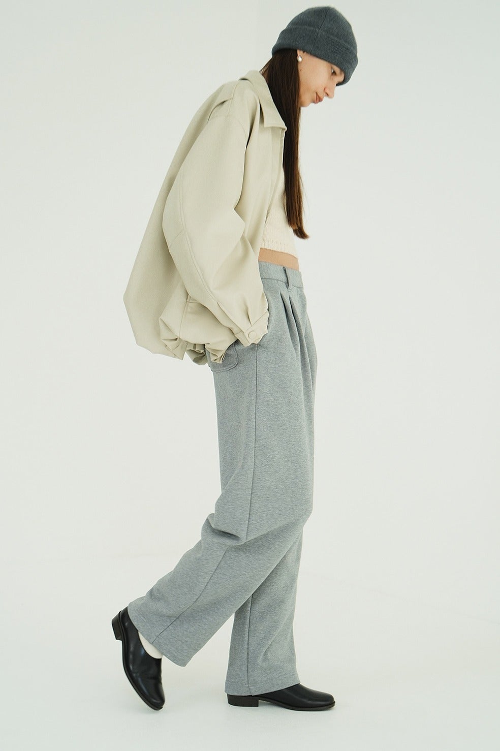 タックによって腰まわりにゆとりを持たせ、リラックス感のある快適な穿き心地に仕上げました。スウェット特有のカジュアルさは残しつつ、前開きのスラックス仕様でモードな雰囲気をプラス。ウエストは後ろがゴム仕様で、ベルトループ付きのデザイン。