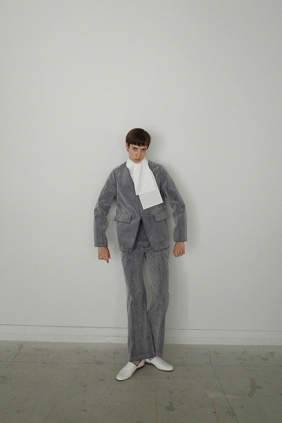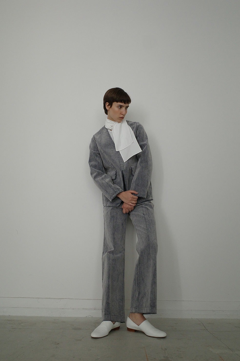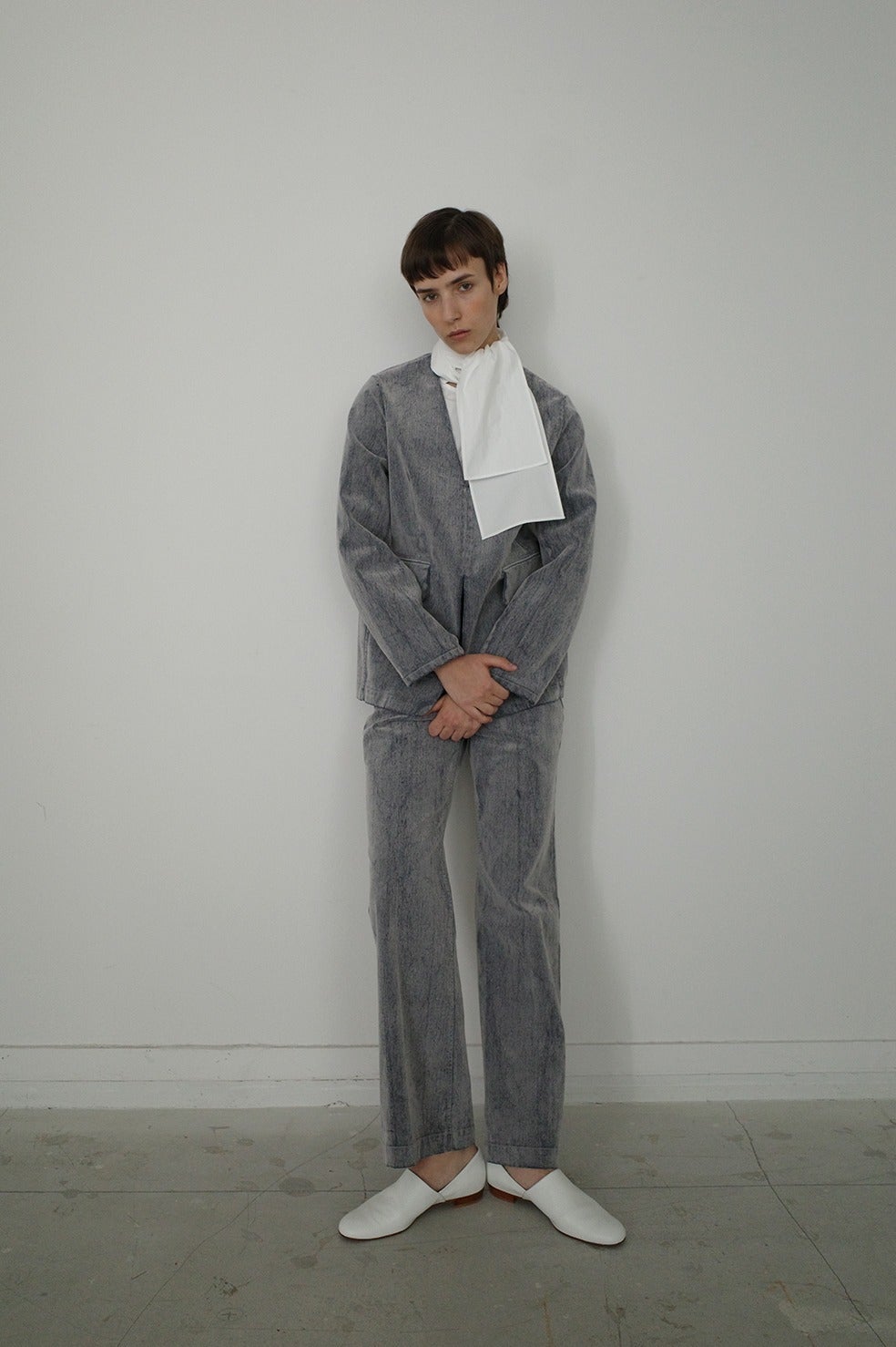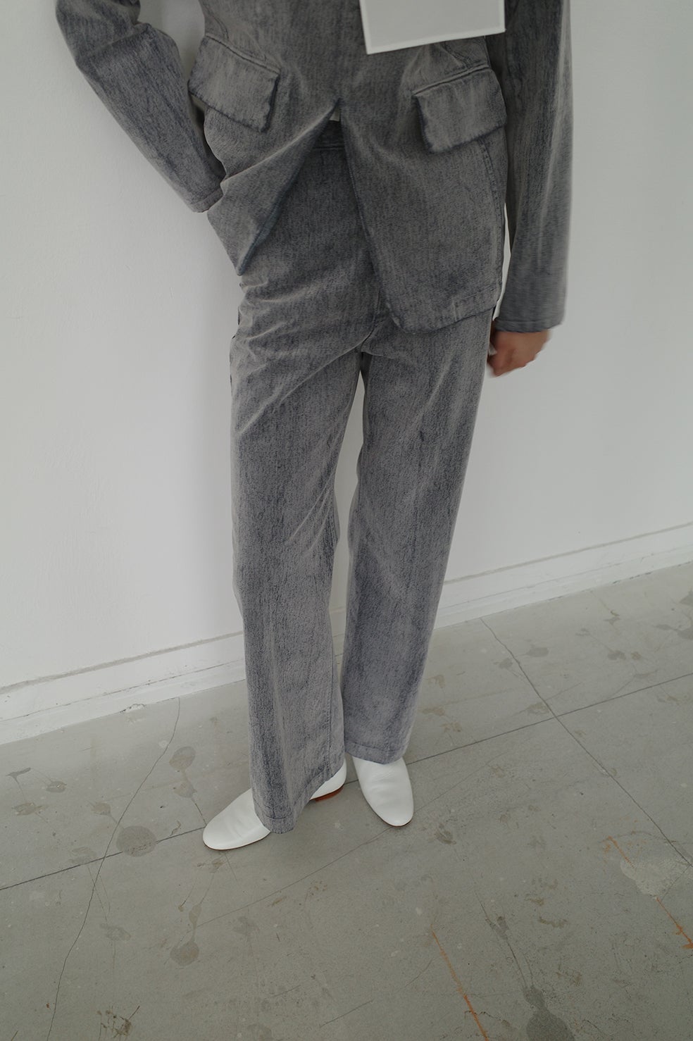 フロッキーデニムにはワンウォッシュ加工を施しており、程よい柔らかさとデイリーに着やすい風合いをプラス。カジュアルにもモードにも馴染む万能な一本です。