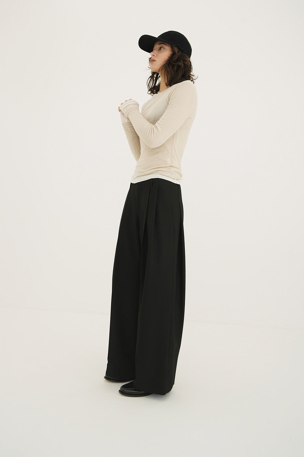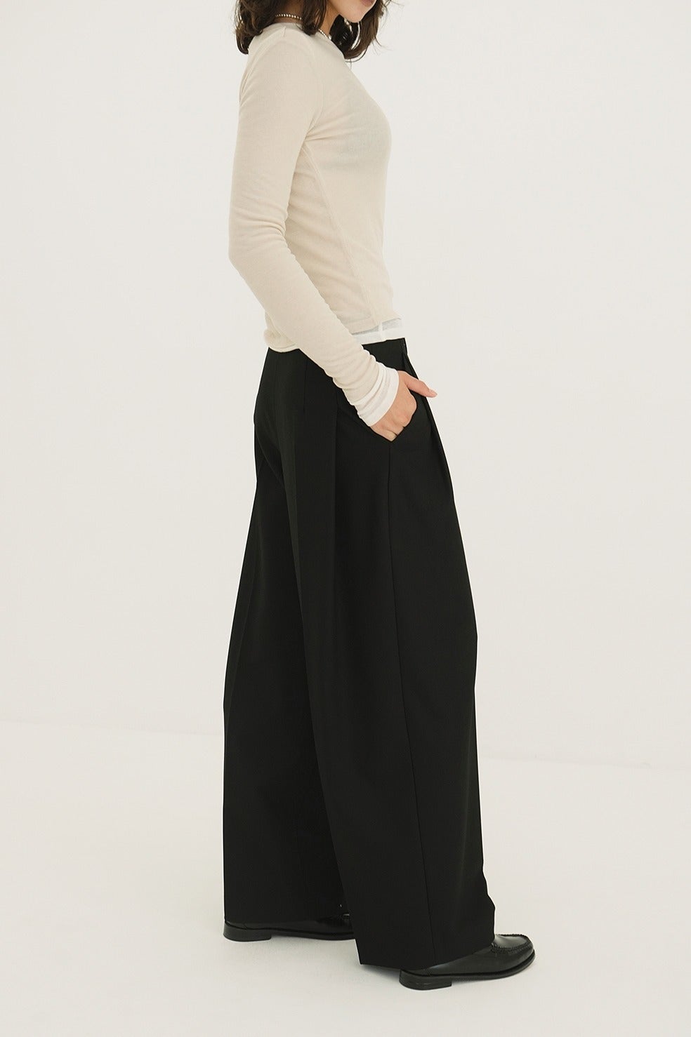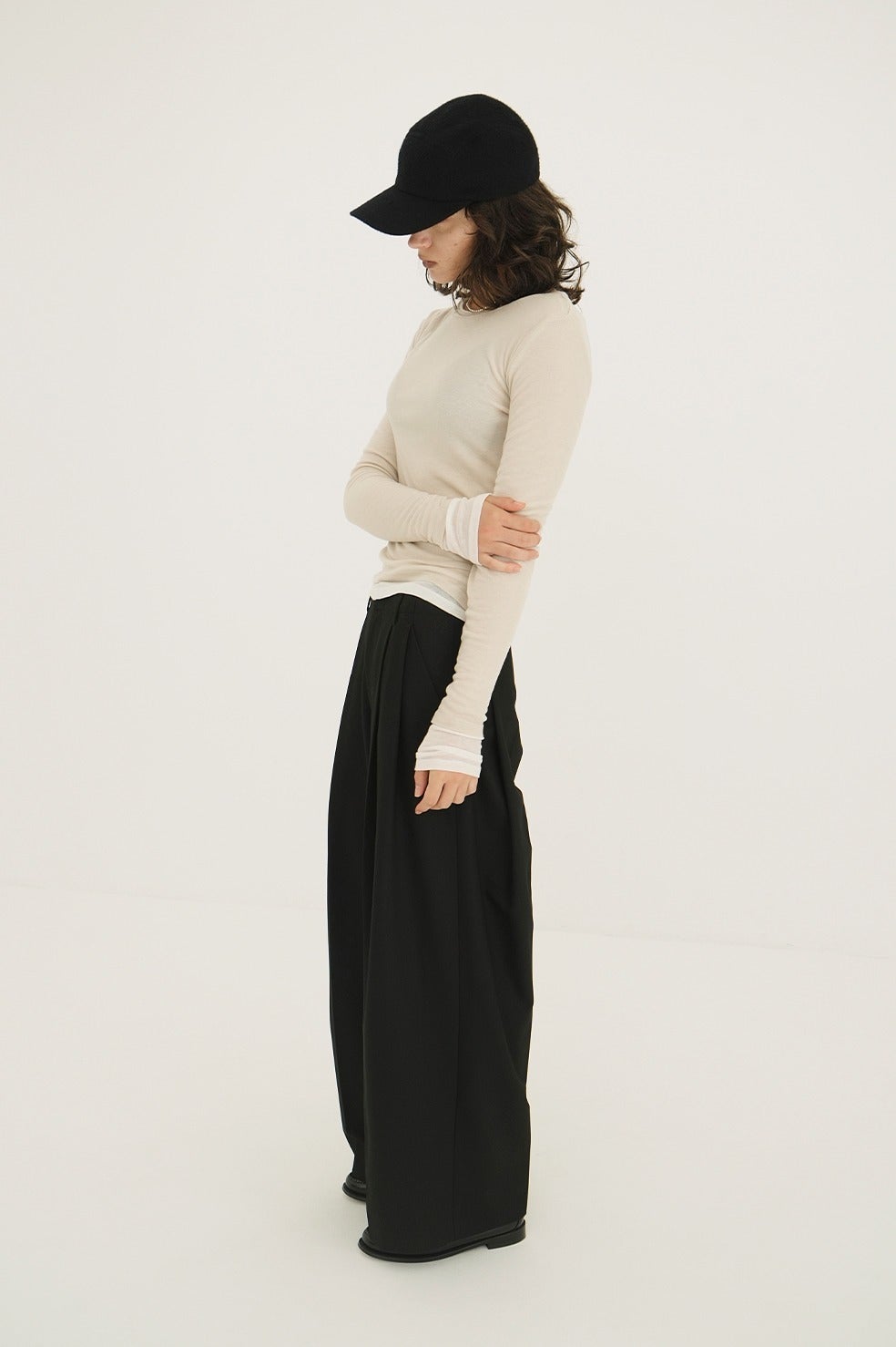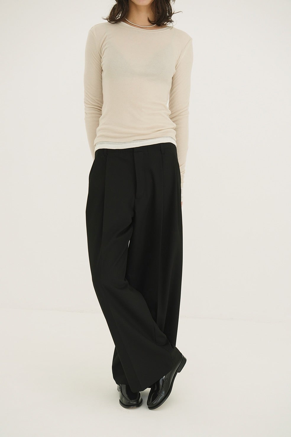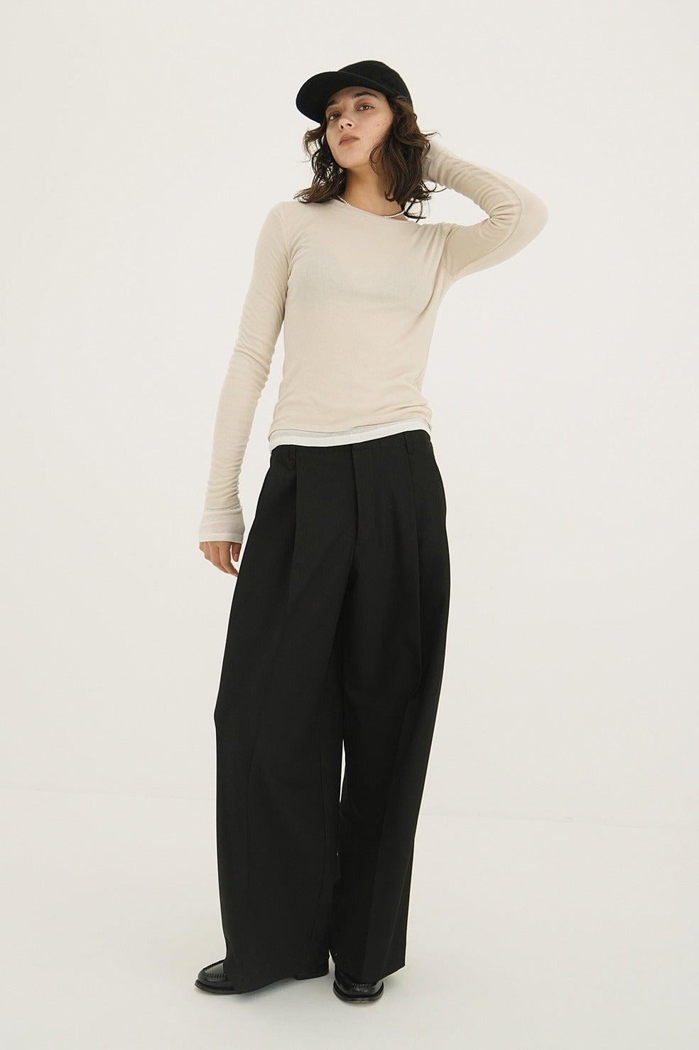 ローウエストの履き位置で、今季らしい抜け感のあるバランスに仕上げました。深めに入れたタックが立体的なシルエットを生み、センタープレスが脚のラインをすらりと美しく演出。ウエストはぐるりとゴム仕様で、リラックスした穿き心地もポイントです。