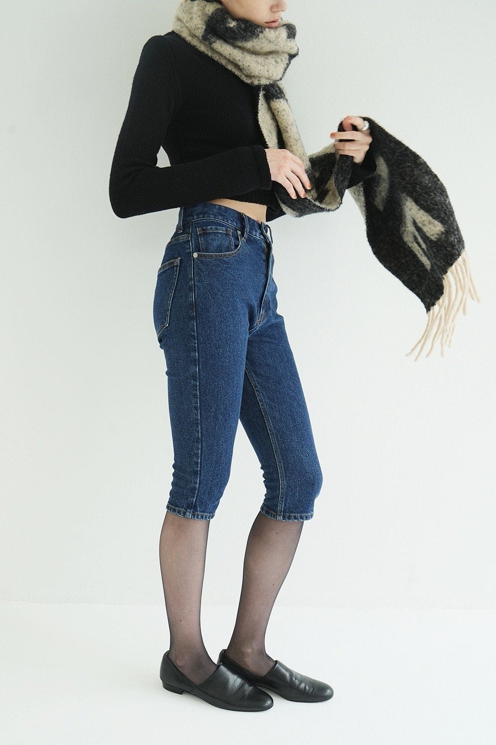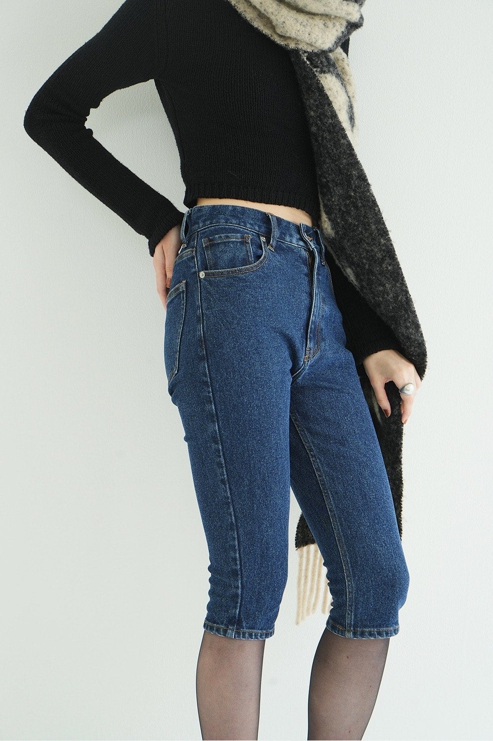 トレンド感のあるタイトシルエットに、ストレッチの効いたデニム素材のカプリパンツ。