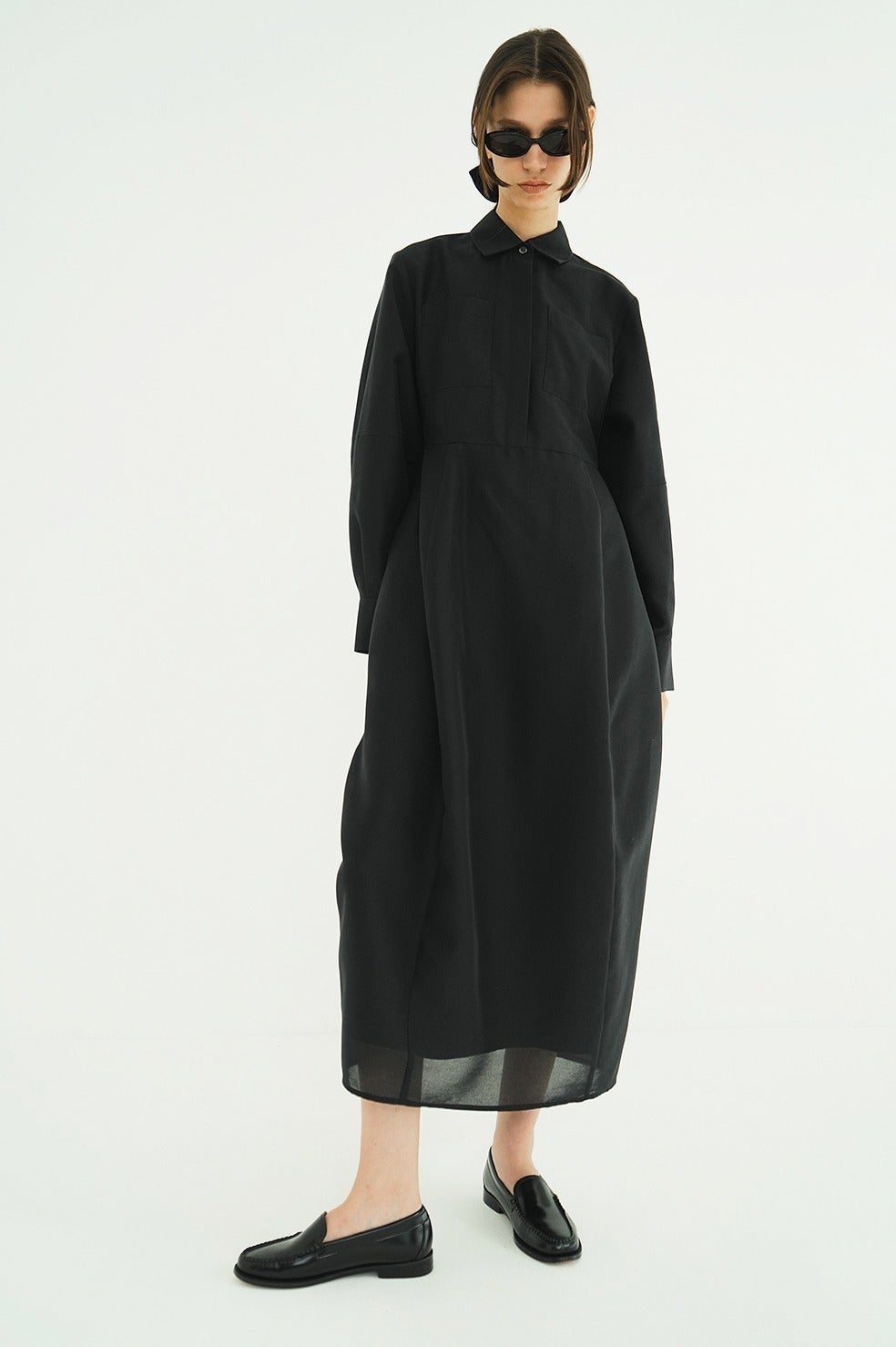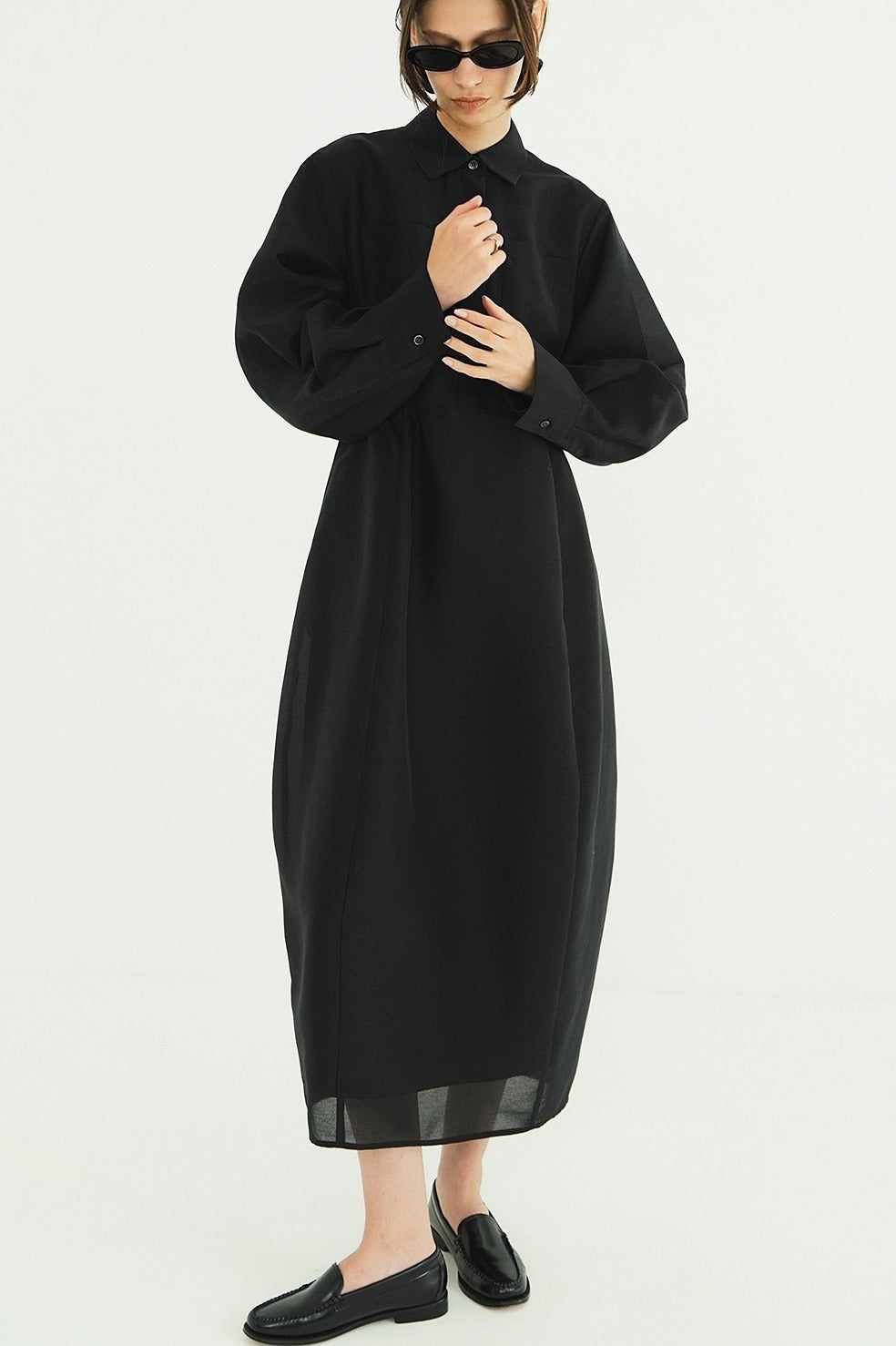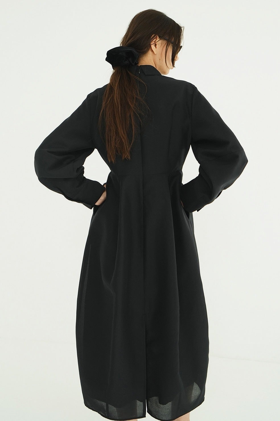 スカート部分にボリュームが出るよう、構築的なコクーンシルエットに仕上げました。