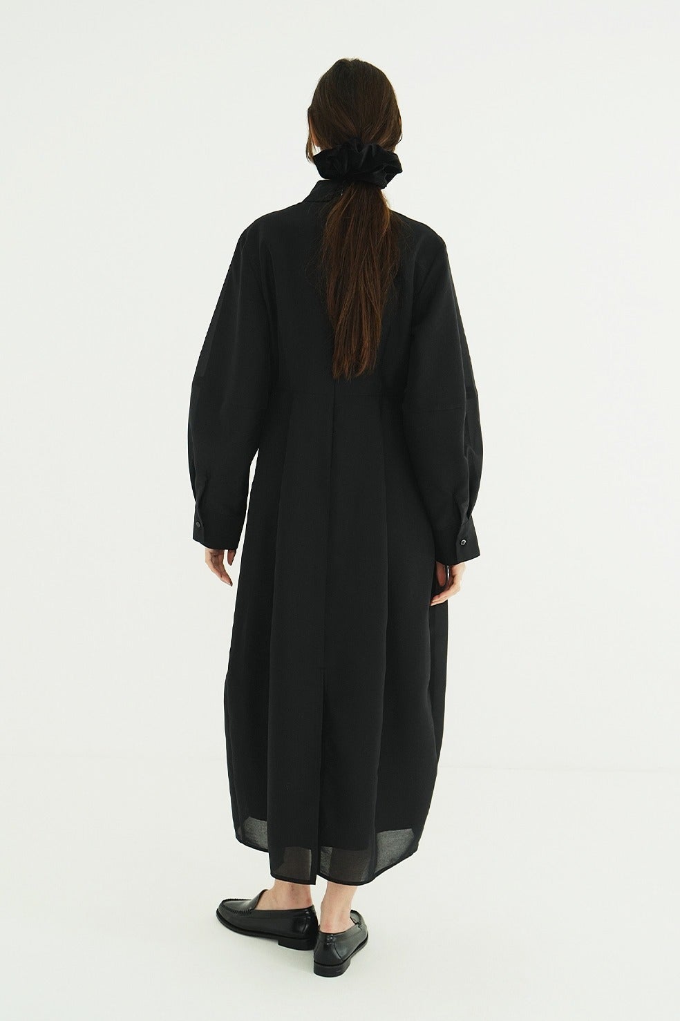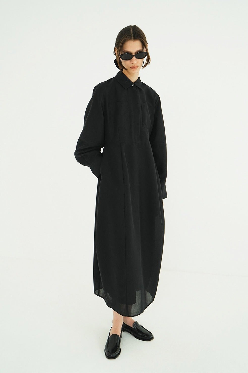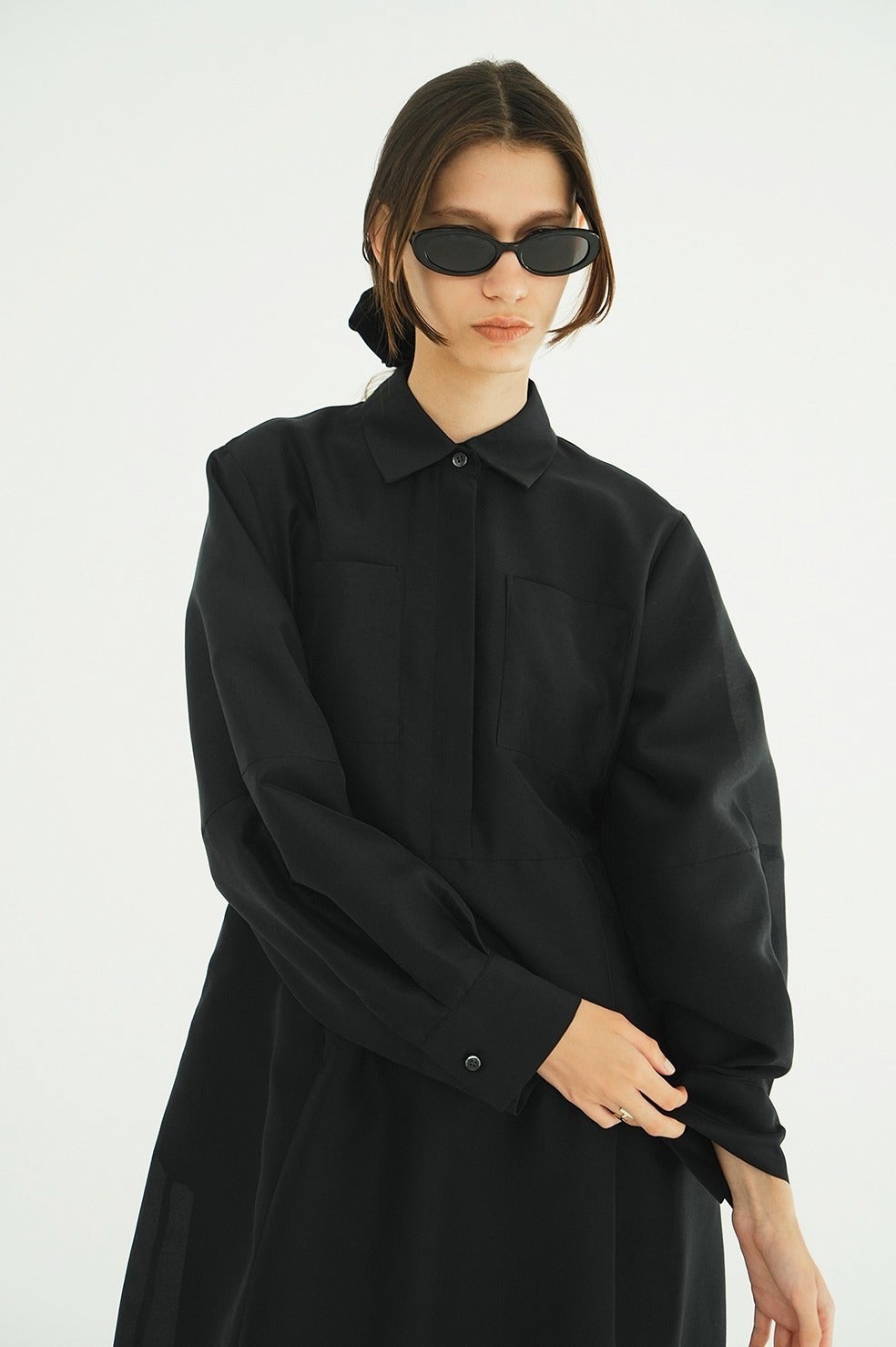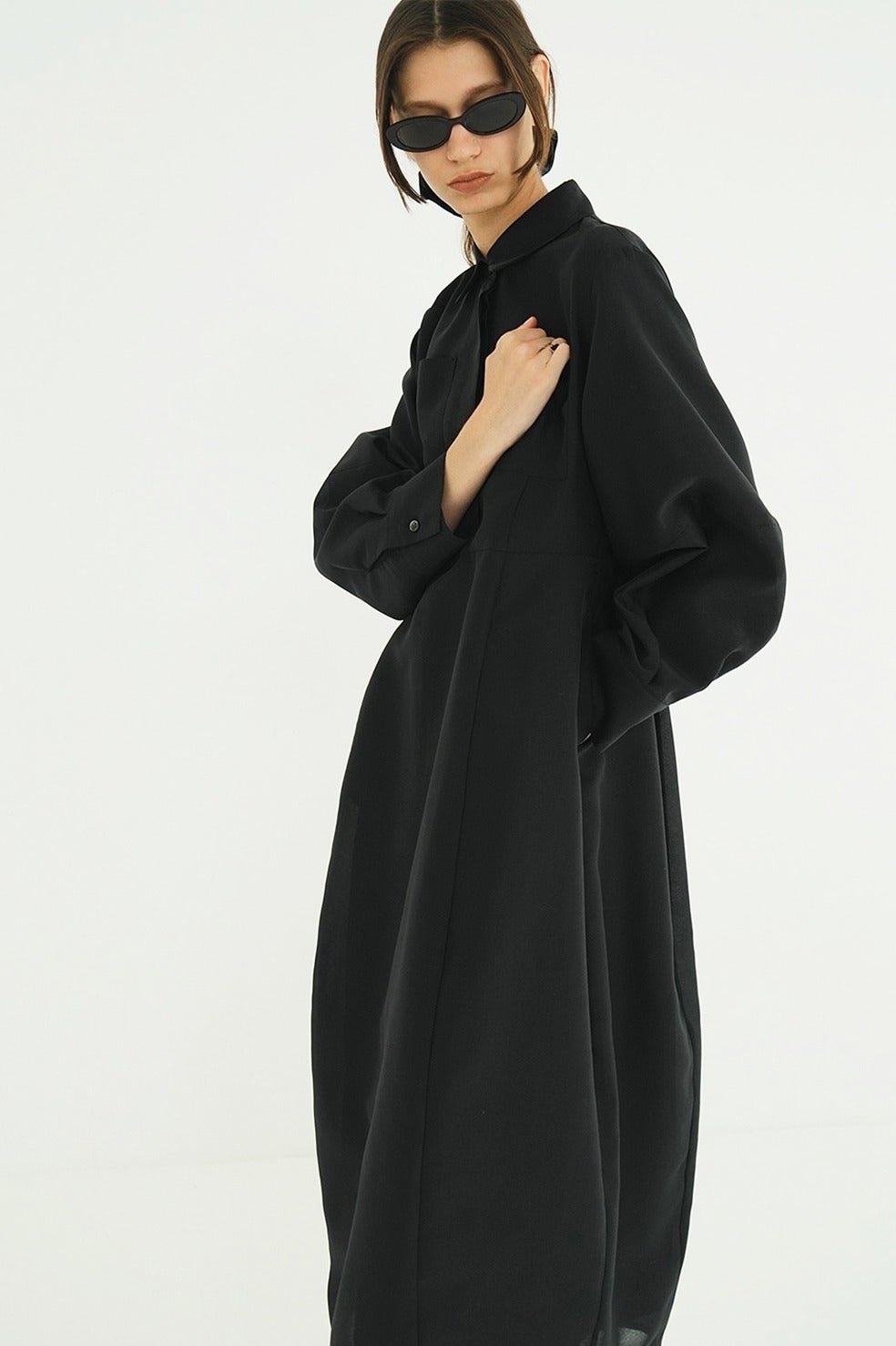 スカート部分にボリュームが出るよう、構築的なコクーンシルエットに仕上げました。
