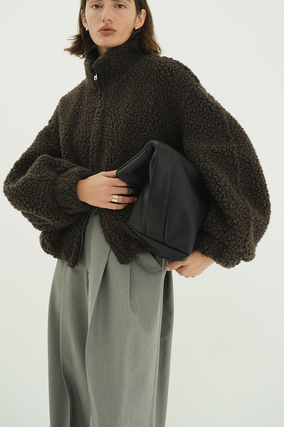 マチを広めにとったバスケット型のフォルムと、両サイドから続く太めのハンドルがミニマルな印象を与えます。