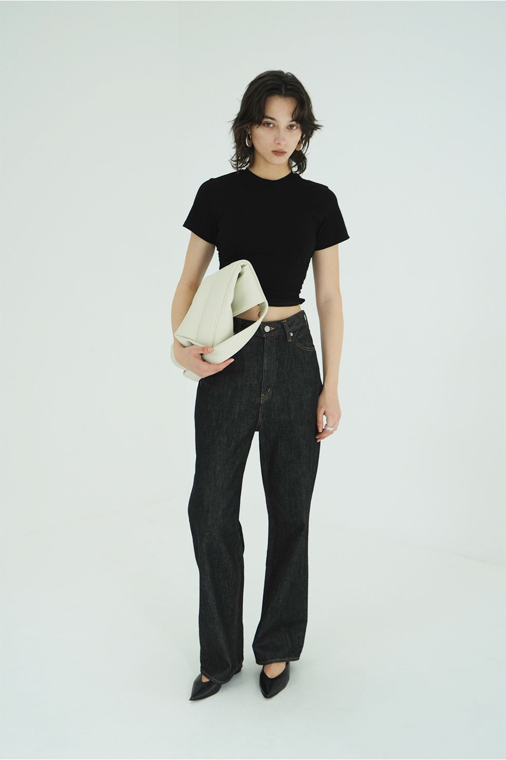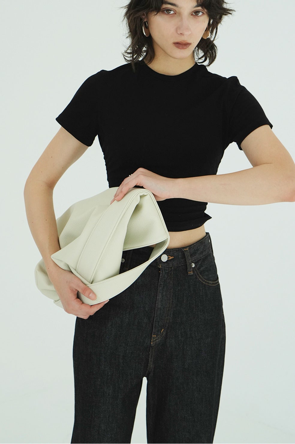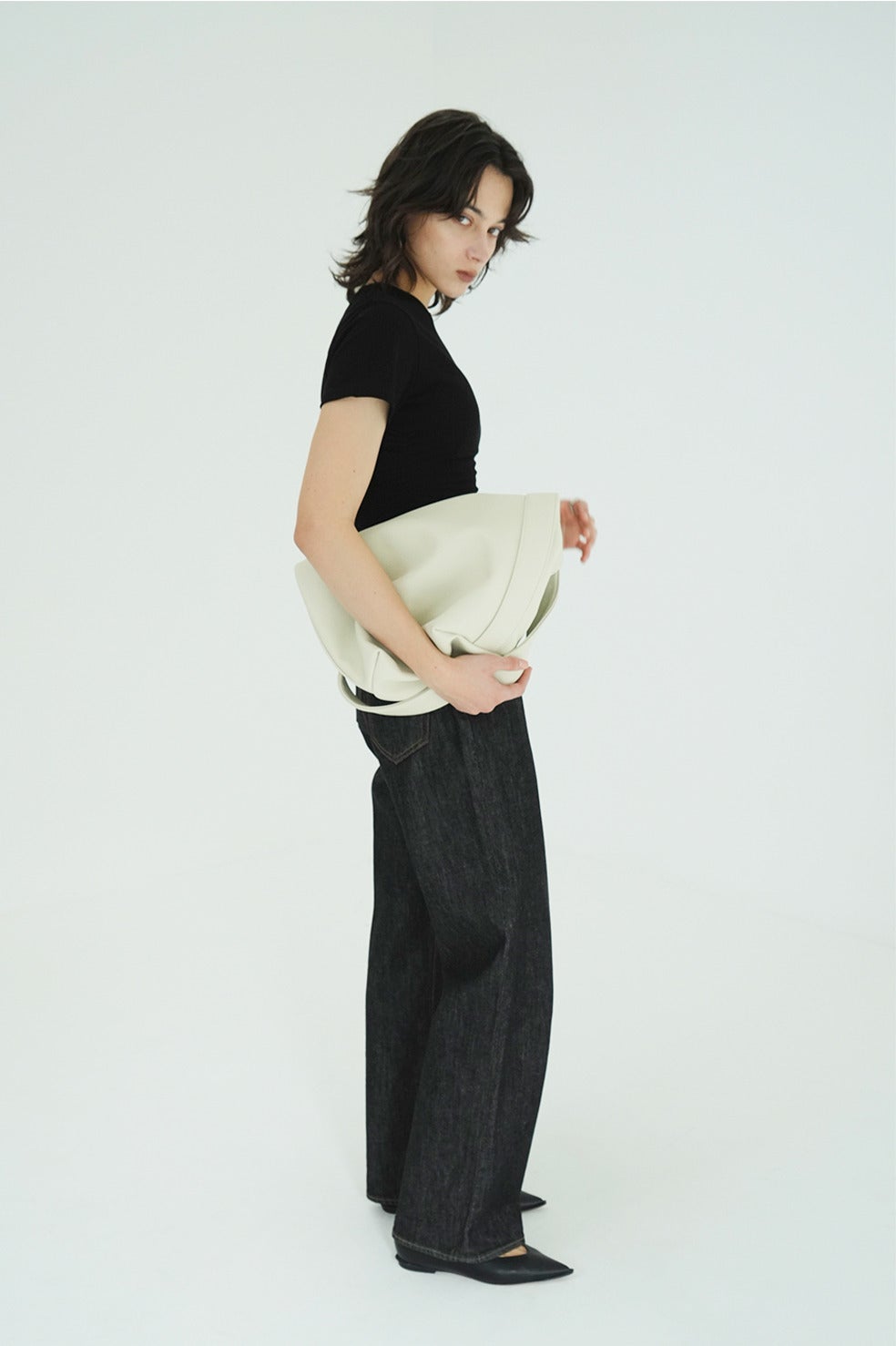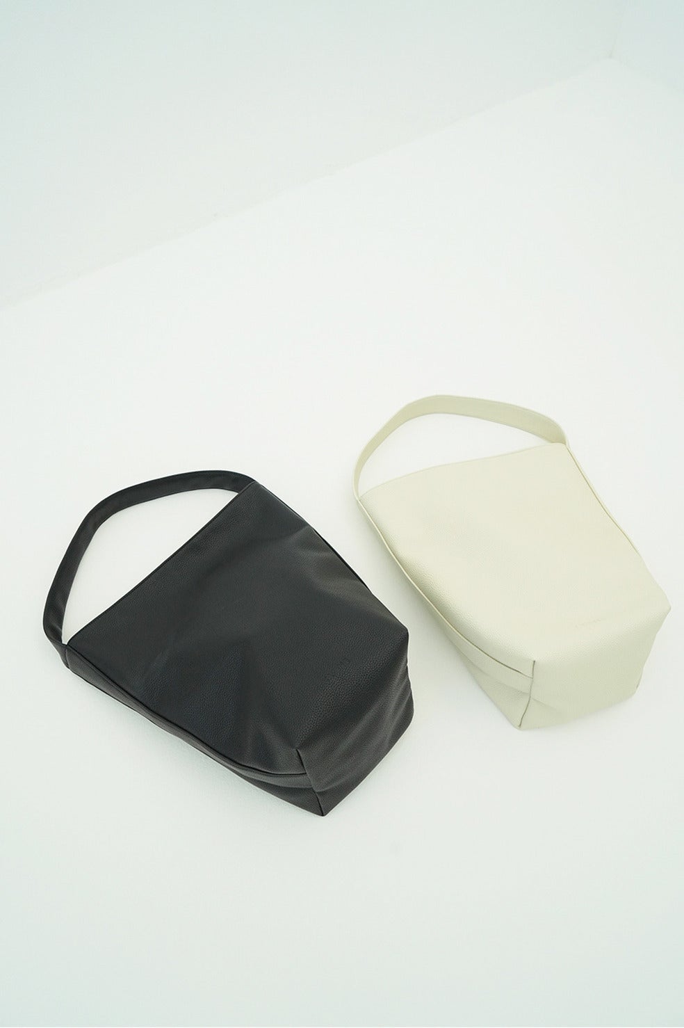 マチを広めにとったバスケット型のフォルムと、両サイドから続く太めのハンドルがミニマルな印象を与えます。