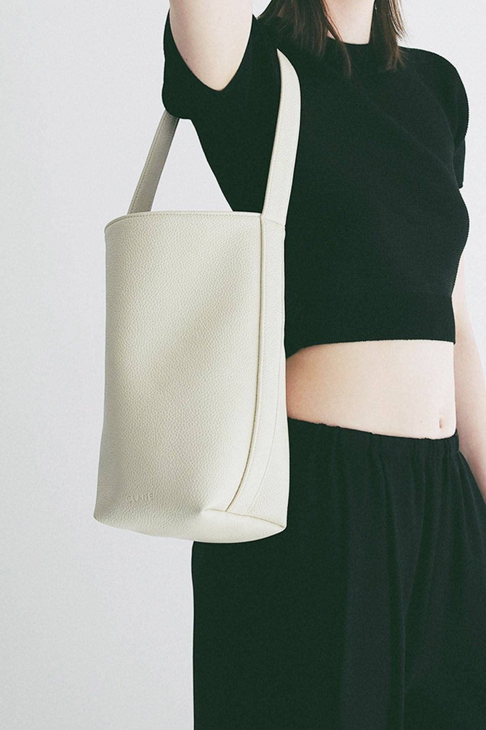 マチを広めにとったバスケット型のフォルムと、両サイドから続く太めのハンドルがミニマルな印象を与えます。普段使いにちょうど良いサイズ感で、カジュアルからきれいめまで幅広いスタイリングにマッチします。