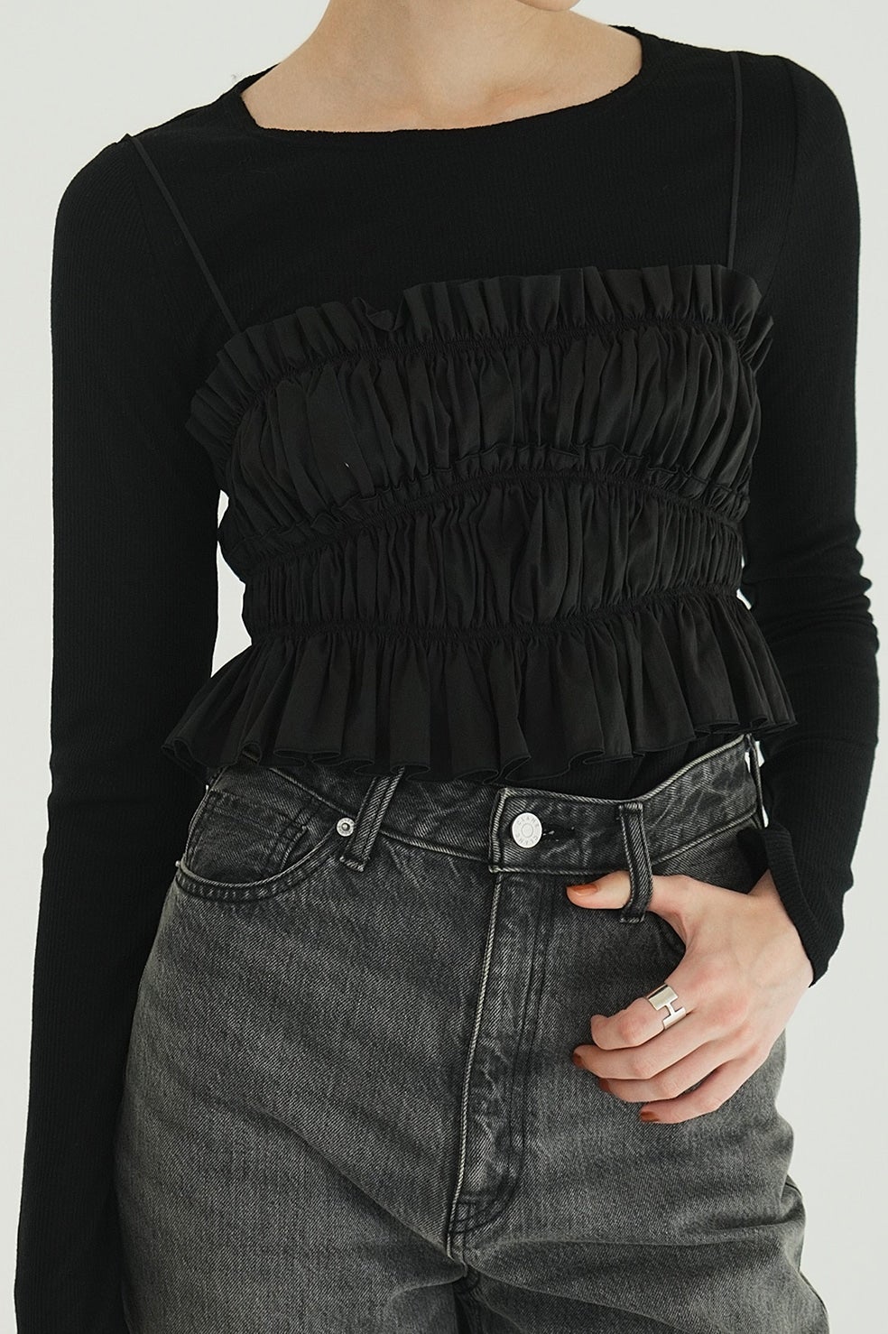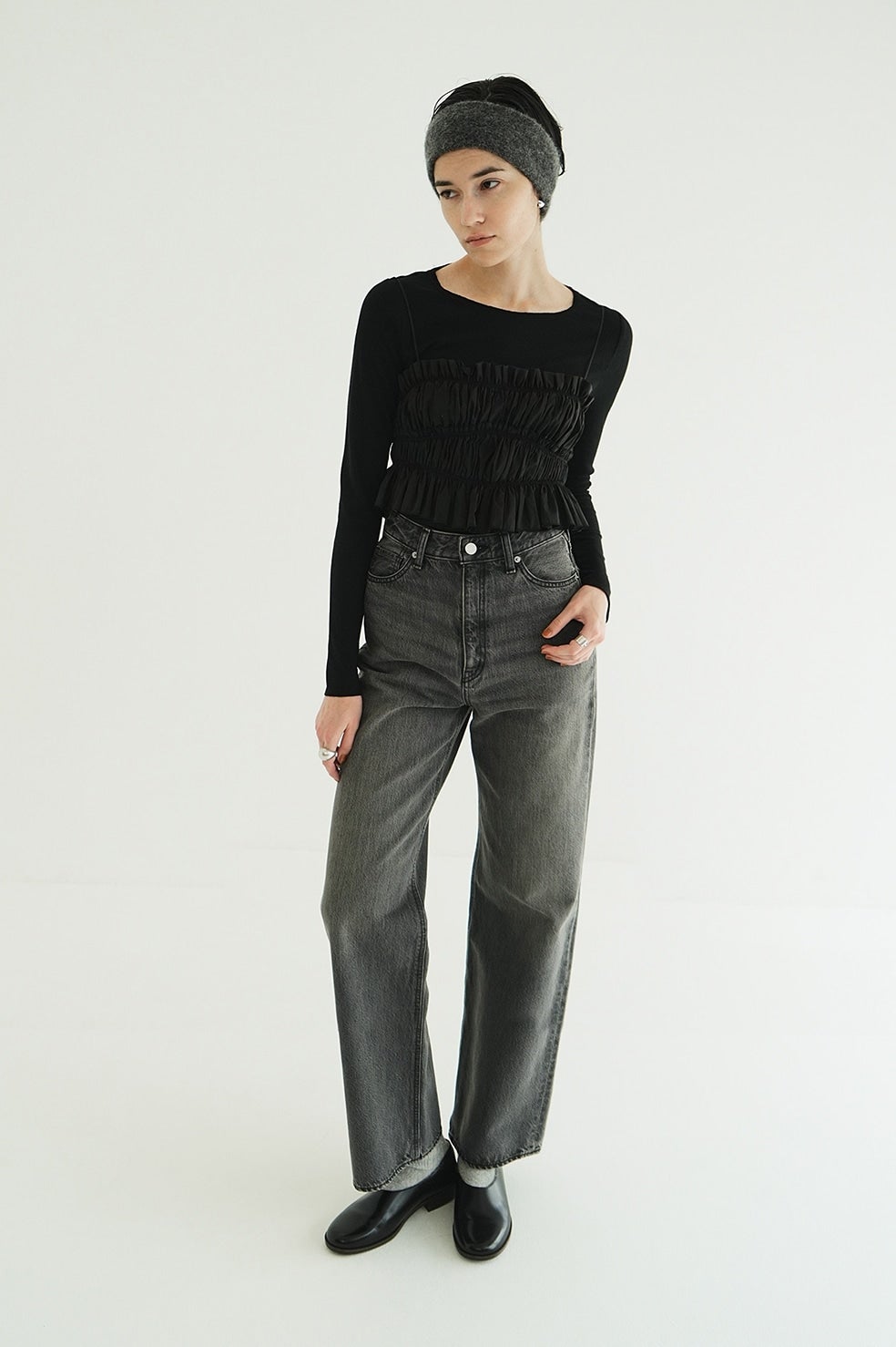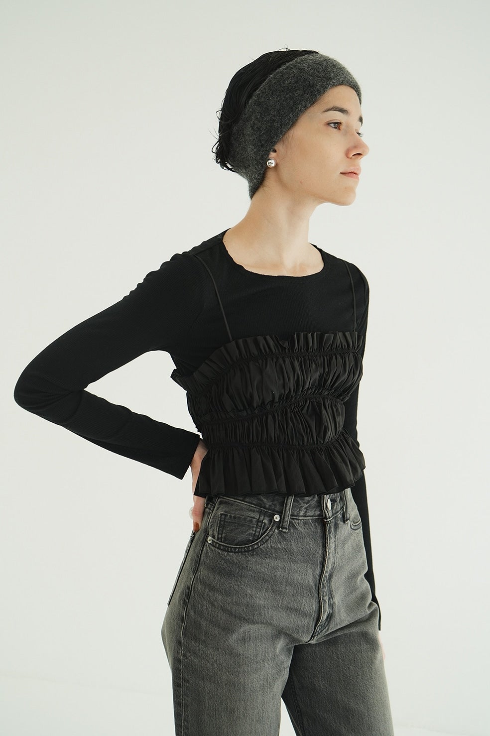 ビスチェはギャザーを贅沢に寄せた、コンパクトでトレンド感のあるデザイン。レイヤードすることで一気に今年らしいスタイリングが完成します。