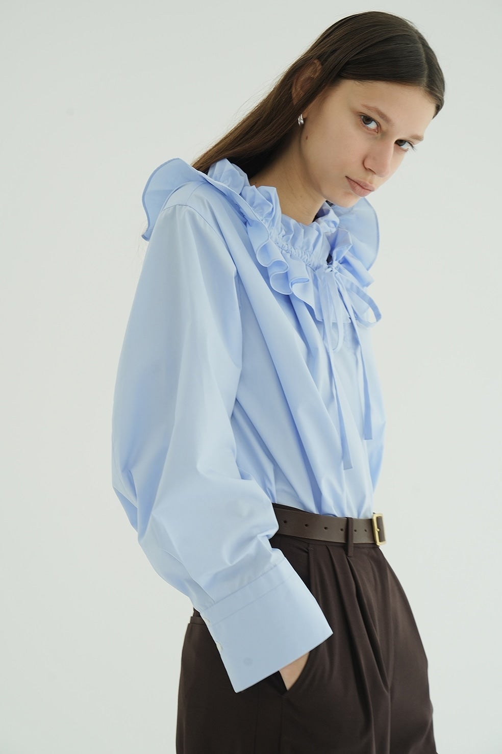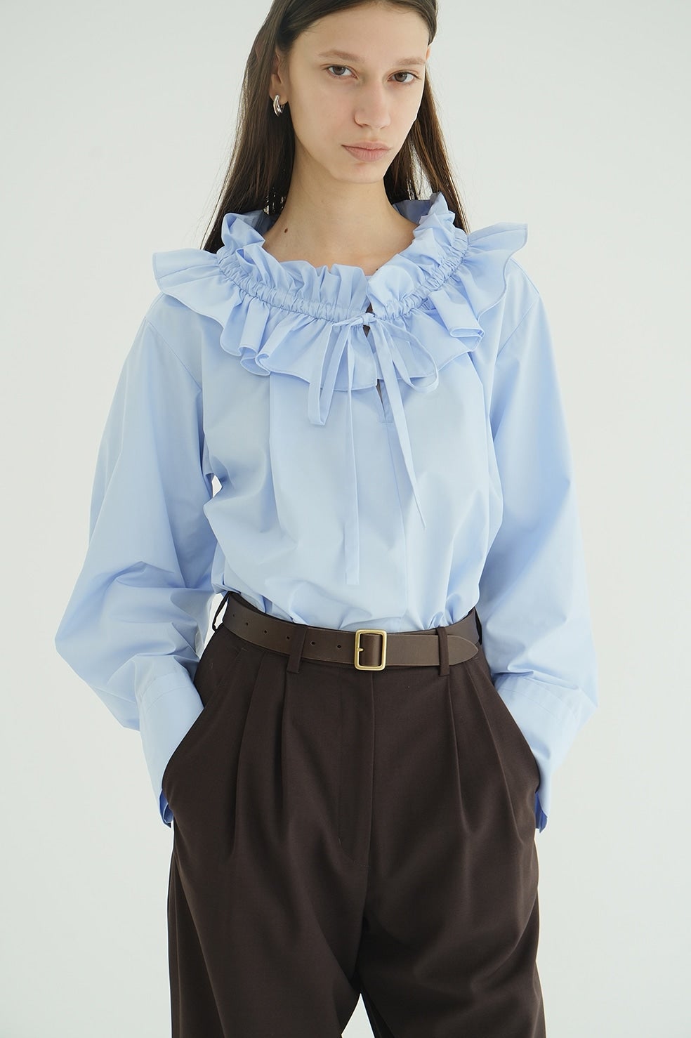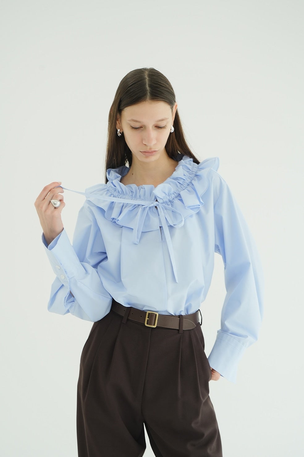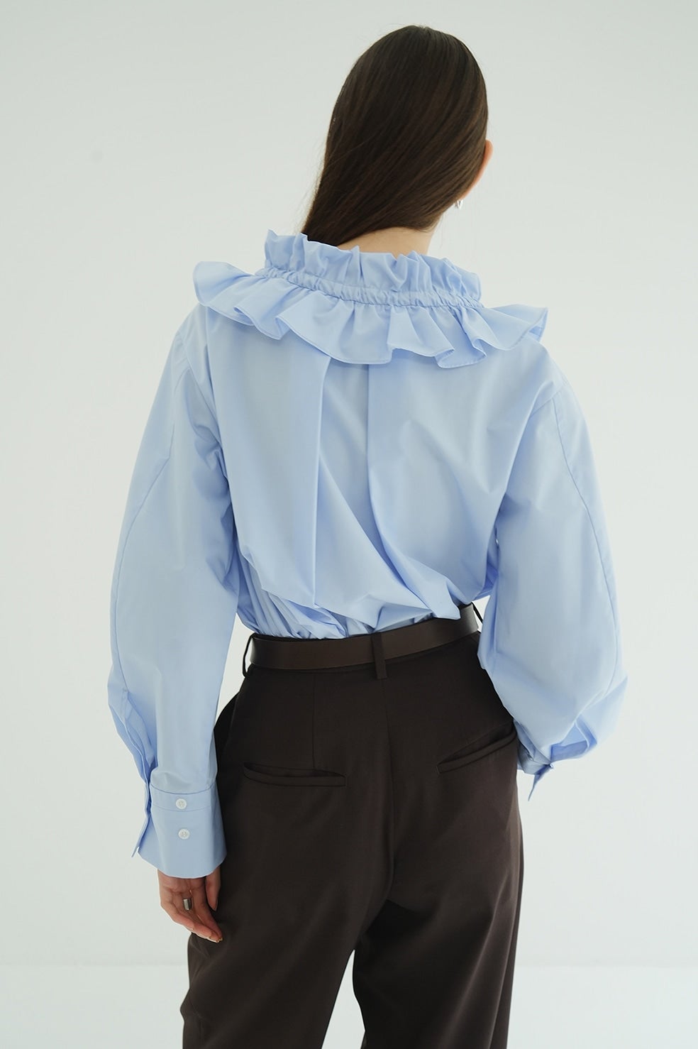 ゆったりとしたサイジングで抜け感を出し、ネックのフリルがアクセントになったフリルシャツ。