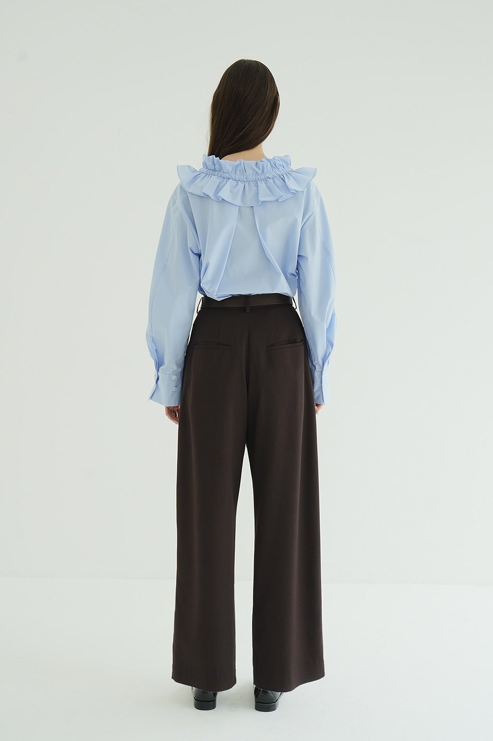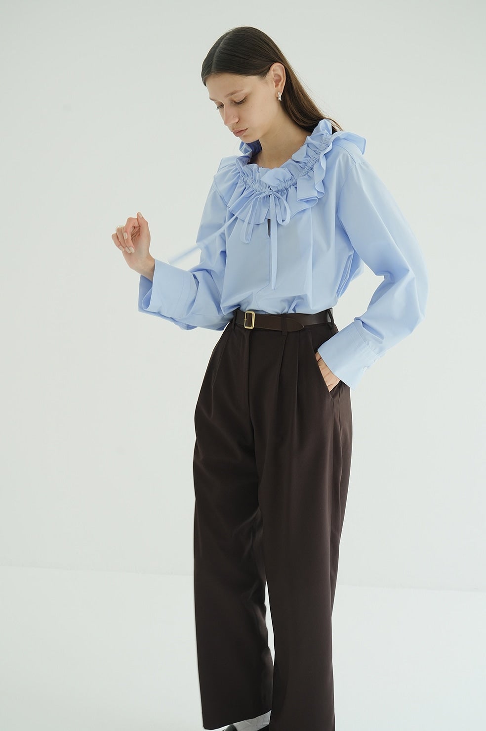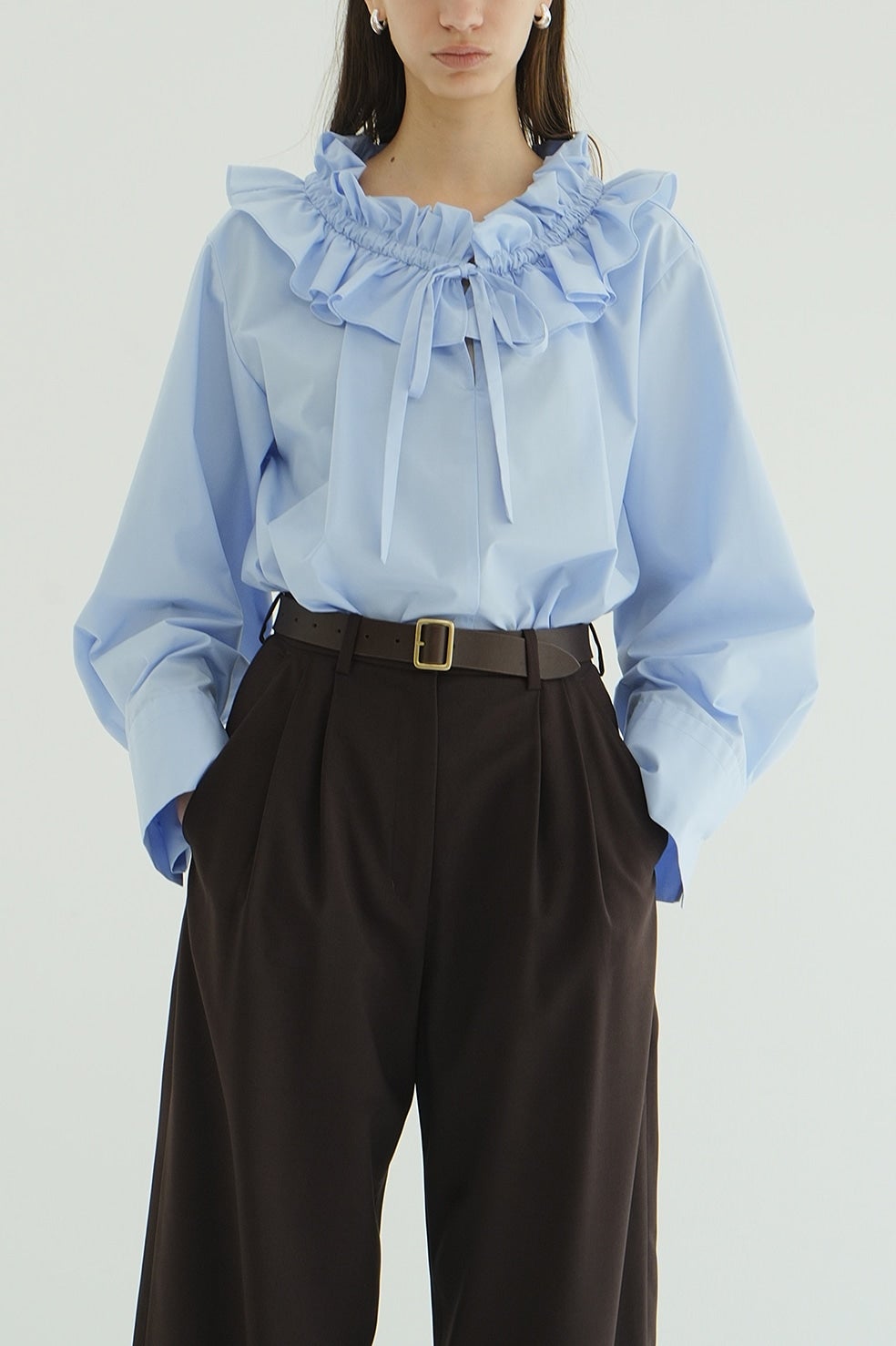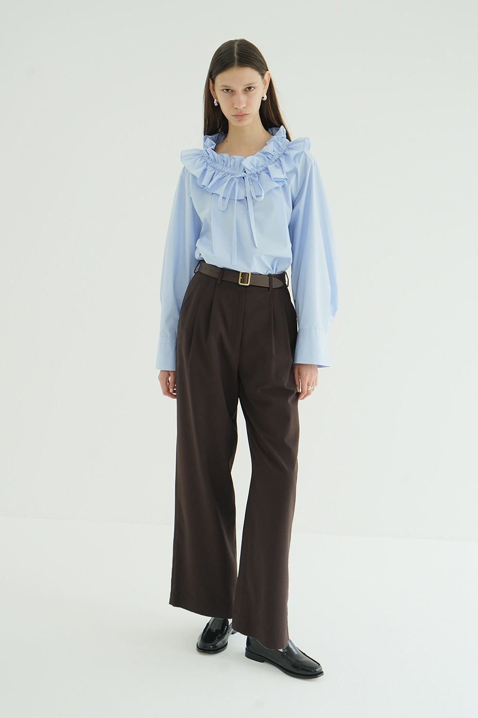 ゆったりとしたサイジングで抜け感を出し、ネックのフリルがアクセントになったフリルシャツ。